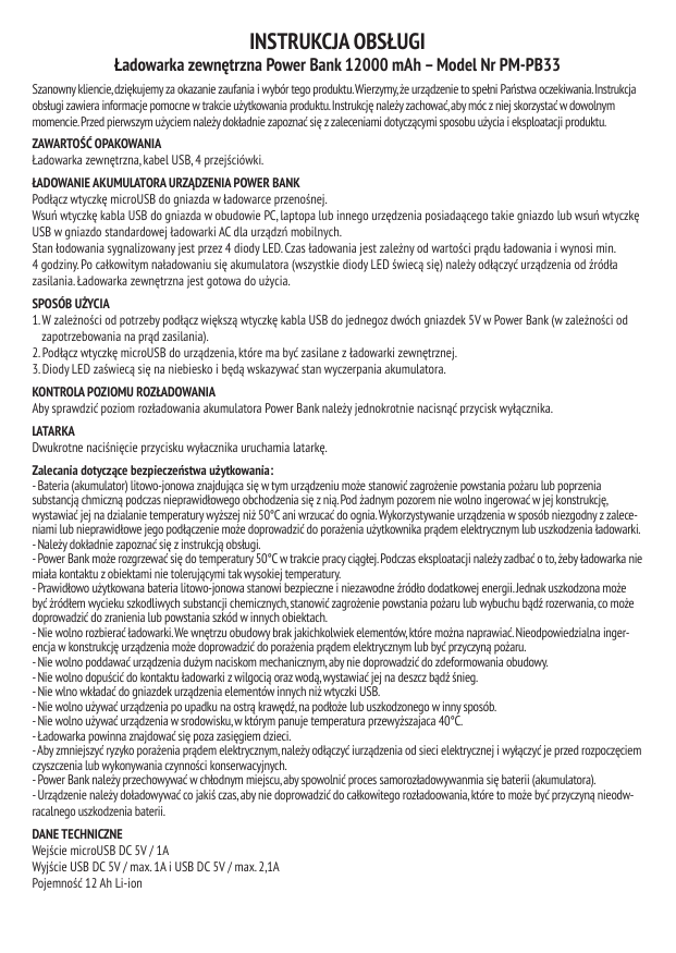 INSTRUKCJA OBSŁUGI Ładowarka zewnętrzna Power Bank 12000 mAh – Model Nr PM-PB33 Szanowny kliencie, dziękujemy za okazanie zaufania i wybór tego produktu. Wierzymy, że urządzenie to spełni Państwa oczekiwania. Instrukcja obsługi zawiera informacje pomocne w trakcie użytkowania produktu. Instrukcję należy zachować, aby móc z niej skorzystać w dowolnym momencie. Przed pierwszym użyciem należy dokładnie zapoznać się z zaleceniami dotyczącymi sposobu użycia i eksploatacji produktu. ZAWARTOŚĆ OPAKOWANIA Ładowarka zewnętrzna, kabel USB, 4 przejściówki. ŁADOWANIE AKUMULATORA URZĄDZENIA POWER BANK Podłącz wtyczkę microUSB do gniazda w ładowarce przenośnej. Wsuń wtyczkę kabla USB do gniazda w obudowie PC, laptopa lub innego urzędzenia posiadaącego takie gniazdo lub wsuń wtyczkę USB w gniazdo standardowej ładowarki AC dla urządzń mobilnych. Stan łodowania sygnalizowany jest przez 4 diody LED. Czas ładowania jest zależny od wartości prądu ładowania i wynosi min. 4 godziny. Po całkowitym naładowaniu się akumulatora (wszystkie diody LED świecą się) należy odłączyć urządzenia od źródła zasilania. Ładowarka zewnętrzna jest gotowa do użycia. SPOSÓB UŻYCIA 1. W zależności od potrzeby podłącz większą wtyczkę kabla USB do jednegoz dwóch gniazdek 5V w Power Bank (w zależności od zapotrzebowania na prąd zasilania). 2. Podłącz wtyczkę microUSB do urządzenia, które ma być zasilane z ładowarki zewnętrznej. 3. Diody LED zaświecą się na niebiesko i będą wskazywać stan wyczerpania akumulatora. KONTROLA POZIOMU ROZŁADOWANIA Aby sprawdzić poziom rozładowania akumulatora Power Bank należy jednokrotnie nacisnąć przycisk wyłącznika. LATARKA Dwukrotne naciśnięcie przycisku wyłacznika uruchamia latarkę. Zalecania dotyczące bezpieczeństwa użytkowania: - Bateria (akumulator) litowo-jonowa znajdująca się w tym urządzeniu może stanowić zagrożenie powstania pożaru lub poprzenia substancją chmiczną podczas nieprawidłowego obchodzenia się z nią. Pod żadnym pozorem nie wolno ingerować w jej konstrukcję, wystawiać jej na dzialanie temperatury wyższej niż 50°C ani wrzucać do ognia. Wykorzystywanie urządzenia w sposób niezgodny z zaleceniami lub nieprawidłowe jego podłączenie może doprowadzić do porażenia użytkownika prądem elektrycznym lub uszkodzenia ładowarki. - Należy dokładnie zapoznać się z instrukcją obsługi. - Power Bank może rozgrzewać się do temperatury 50°C w trakcie pracy ciągłej. Podczas eksploatacji należy zadbać o to, żeby ładowarka nie miała kontaktu z obiektami nie tolerującymi tak wysokiej temperatury. - Prawidłowo użytkowana bateria litowo-jonowa stanowi bezpieczne i niezawodne źródło dodatkowej energii. Jednak uszkodzona może być żródłem wycieku szkodliwych substancji chemicznych, stanowić zagrożenie powstania pożaru lub wybuchu bądź rozerwania, co może doprowadzić do zranienia lub powstania szkód w innych obiektach. - Nie wolno rozbierać ładowarki. We wnętrzu obudowy brak jakichkolwiek elementów, które można naprawiać. Nieodpowiedzialna ingerencja w konstrukcję urządzenia może doprowadzić do porażenia prądem elektrycznym lub być przyczyną pożaru. - Nie wolno poddawać urządzenia dużym naciskom mechanicznym, aby nie doprowadzić do zdeformowania obudowy. - Nie wolno dopuścić do kontaktu ładowarki z wilgocią oraz wodą, wystawiać jej na deszcz bądź śnieg. - Nie wlno wkładać do gniazdek urządzenia elementów innych niż wtyczki USB. - Nie wolno używać urządzenia po upadku na ostrą krawędź, na podłoże lub uszkodzonego w inny sposób. - Nie wolno używać urządzenia w srodowisku, w którym panuje temperatura przewyższajaca 40°C. - Ładowarka powinna znajdować się poza zasięgiem dzieci. - Aby zmniejszyć ryzyko porażenia prądem elektrycznym, należy odłączyć iurządzenia od sieci elektrycznej i wyłączyć je przed rozpoczęciem czyszczenia lub wykonywania czynności konserwacyjnych. - Power Bank należy przechowywać w chłodnym miejscu, aby spowolnić proces samorozładowywanmia się baterii (akumulatora). - Urządzenie należy doładowywać co jakiś czas, aby nie doprowadzić do całkowitego rozładoowania, które to może być przyczyną nieodwracalnego uszkodzenia baterii. DANE TECHNICZNE Wejście microUSB DC 5V / 1A Wyjście USB DC 5V / max. 1A i USB DC 5V / max. 2,1A Pojemność 12 Ah Li-ion Ochrona środowiska naturalnego Informacje dotyczące utylizacji urządzeń elektrycznych i elektronicznych Ochrana životního prostředí Po upłynięciu czasu żywotności produktu lubzařízení. w momencie, kiedy naprawa jestproduktu nieekonomiczna, nie wolno Informace k likvidaci elektrických a elektronických Po uplynutí doby životnosti nebo v okamžiku, kdy by oprava byla produktu neekonomická, produkt nevhazujte doAby domovního Za účelem správné likvidacenależy výrobku jej odevzdejte wyrzucać do odpadów domowych. dokonaćodpadu. właściwej utylizacji produktu, oddać go do na určených sběrnýchmiejsca místech,zbiórki, kde budou přijata zdarma. Správnou likvidací pomůžete zachovat cenné přírodní zdroje pomagasz a napowyznaczonego gdzie zostanie przyjęty nieodpłatnie. Dokonując prawidłowej utylizacji máháte prevenci potenciálních negativníchidopadů na životní prostředí a lidské zdraví, což by mohly být důsledky nesprávné zachować cenne zasoby przyrodnicze wspomagasz prewencję likvidace odpadů. Další podrobnosti si vyžádejte od místního úřadu nebo nejbližšího sběrného místa. Při nesprávné likvidaci przeciw potencjalnemu negatywnemu wpływowi na środowisko naturalne i ludzkie zdrowie, na co mogłaby mieć wpływ tohoto druhu odpadu mohou být v souladu s národními předpisy uděleny pokuty. Baterie nevhazujte do běžného odpadu, ale odevzdejte na nieprawidłowa utylizacja odpadów. Dalszych szczegółów wymagaj od lokalne