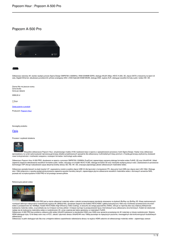 Popcorn Hour : Popcorn A-500 Pro Popcorn A-500 Pro Odtwarzacz sieciowy 4K, bardzo wydajny proces Sigma Design SMP8758 (1200MHz), RAM 2048MB DDR3, obsługa 4Kx2K 30fps, HEVC H.265, 3D, złącze SATA z kieszenią na dysk 3,5 cala, Gigabit Ethernet, wbudowany przetwornik cyfrowo-analogowy DAC z ESS Sabre32 ES9018K2M, obsługa DSD, wyjścia XLR, obsługuje wszelkie formaty audio i wideo HD i 3D. Ocena Nie ma jeszcze oceny Cena brutto Cena po rabacie 3099,00 zł Zadaj pytanie o produkt Producent: Popcorn Hour Szczegóły produktu Opis Procesor i szybkość działania Wszystkie odtwarzacze Popcorn Hour, od pierwszego modelu A100, budowane były w oparciu o specjalizowane procesory marki Sigma Design. Każdy nowy odtwarzacz wprowadzany na rynek wykorzystywał najnowszą generację układów projektowanych specjalnie dla odtwarzaczy multimedialnych klasy premium. Z każdą generacją użytkownicy dostawali nowe funkcjonalności i możliwości związane z rozwojem formatów i technologii audio-wideo. Odtwarzacz Popcorn Hour A-500 PRO, zbudowano w oparciu o procesor SMP8758 (1200MHz DualCore) zapewniający sprawną obsługę formatów wideo FullHD, 3D oraz UltraHD/4K. Układ zapewnia wsparcie dekodowania wszelkich formatów audio i wideo, wliczając w to kodek HEVC H.265, obsługę formatów 3D oraz niezwykle wydajną pracę w sieci. Zastosowana w procesorze technologia VXP oferuje rozbudowane opcje aktywnej korekty obrazu SD, HD, 4K i 3D, znacząco poprawiając jakość odtwarzanych materiałów wideo. Odtwarzacz posiada kieszeń na dysk twardy 3.5", wyposażony został w szybkie złącze USB 3.0 dla łączności z komputerem PC, dwa porty host USB oraz złącze sieci LAN 1Gbit. Obsługa sieci 1Gbit połączona z wysoką wydajnością procesora zapewnia wysokie transfery danych, zapewniające płynne odtwarzanie wszelkich materiałów wideo z domowych serwerów NAS, pozwala też na wykorzystanie A-500 PRO w roli prostego serwera plików. Referencyjna jakość wideo A-500 PRO jest w stanie odtwarzać materiały wideo o jakości przewyższającej standardy stosowane na dyskach BluRay czy BluRay 3D. Klasę zastosowanych rozwiązań definiuje maksymalna rozdzielczość wyjścia 4K (3840x2160), sprzętowe wsparcie dla kodeka HEVC/H265 z głebią kolorystyczna 10bit oraz możliwości przetwarzania strumieni wideo o przepływności do 160Mbps. Kodek HEVC/H265 (High Efficiency Video Coding), w stosunku do swego poprzednika (H264), oferuje co najmniej dwa razy większą efektywność kodowania materiału wideo, co przekłada się na mniejsze rozmiary plików i mniejsze wymogi na przepustowość łączy internetowych przy odtwarzaniu strumieniowym. Kodek ten doskonale nadaje się do kodowania materiałów wideo w rozdzielczości 4K, coraz częściej jest także spotykany w materiałach FullHD. Odtwarzacz A-500 PRO bez problemu odtworzy pliki wideo UltraHD kodowane w standardzie H264 oraz H265 oraz sprawnie przeskaluje do 4K materiały w niższej rozdzielczości. Wyjście HDMI obsługuje tryby 12-bit deep color oraz xvYCC. Jakość i płynność obrazu UltraHD/4K oraz 1080p pozostaje na najwyższym poziomie, nieosiągalnym dla konkurencyjnych budżetowych odtwarzaczy. Odtwarzacz w pełni obsługuje tryb 24p oraz umiejętnie dobiera częstotliwości odświeżania obrazu na wyjściu HDMI zależnie od odtwarzanego materiału wideo - zapewniając zawsze 1/5 Popcorn Hour : Popcorn A-500 Pro maksymalną płynność odtwarzania. Zastosowane rozwiązania sprzętowe oraz szybka pamięć podręczna DDR3 o pojemności 1024MB gwarantują bezproblemowe odtwarzanie plików wideo we wszystkich najpopularniejszych formatach, w dowolnej rozdzielczości, zarówno z nośników lokalnych jako i przez sieć. W pełni obsługiwane są także formaty 3D FullHD. Unikalna technologiaVXP Video Processing zastosowana w procesorze, odpowiada za zaawansowane skalowanie materiałów (SD do FullHD, SD i FullHD do 4K itd), aktywne usuwanie przeplotu z detekcją kadencji, dynamiczną korektę kontrastu, poprawę szczegółowości obrazu i wygładzanie krawędzi. Algorytmy te znacząco poprawiając jakość obrazu 2D i 3D, szczególnie w przypadku plików skompresowanych. Wielokanałowe ścieżki audio w formatach DTS, DTS-HD, DolbyDigital czy Dolby TrueHD odtwarzane są w pełnym formacie 7.1 kanałów lub są dekodowane do 2 kanałów dla systemów kina domowego bez amplitunera wielokanałowego. Odtwarzacz obsługuje wiele popularnych muzycznych formatów audio (MP3, FLAC, WMA, OGG, WAV, APE), także w jakości 192kHz/24bit. Pozwala na uruchomienie prezentacji zdjęć w formatach JPG, BMP, PNG, GIF, z różnymi efektami przejść i muzyką w tle. Jakość dźwięku Popcorn Hour A-500 PRO wyposażono w wysokiej klasy, 32-bitowy przewtornik cyfrowo-analogowy DAC ESS (układ Sabre32 ES9018K2M) który odpowiada za wysoką, audiofilską jakość dźwięku na analogowych wyjściach odtwarzacza. A500 PRO wyposażono też wyjście słuchawkowe oraz w parę niezbalanoswanych analogowych wyjść XLR z dynamiką na poziomie 122dB przy niezwykle niskim poziomie zniekształceń. Moc głównego procesora pozwala na obsługę i odtwarzanie nieskompresowanych materiałów audio wysokiej rozdzielczości, stereofonicznych oraz wielokanałowych, w rozdzielczości do 32bit/384kHz. Urządzenie zapewnia także obsługę plików DSD, w formacie DSD64 (2ch i mch), DSD128 (kodowanie z płyt SACD), DSD256 a nawet DSD512. Odtwarzane są też obrazy ISO płyt DSD. Tryb odtwarzania bez przerw (gapless) dostępny jest dla formatów MP3, WAV, FLAC oraz DSD. Odtwarzanie formatów BluRay, BluRay 3D, DVD, CD... Nie musisz się przejmować że Twoje płyty BD zużyją się od częstego korzystania. Nie musisz szukać i przekładać krążków w odtwarzaczu. Popcorn odtworzy twoje filmy z dysku, ze zarchiwizowanych kopii płyt w formacie ISO. Odtwarzanie z pliku ISO zapewnia dokładnie taką samą jakość obrazu i dźwięku jak przy odtwarzaniu z oryginalnego krążka. Uż