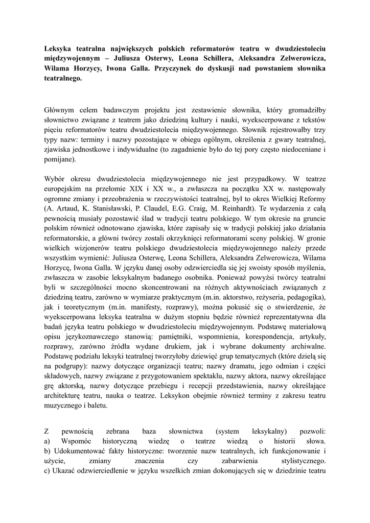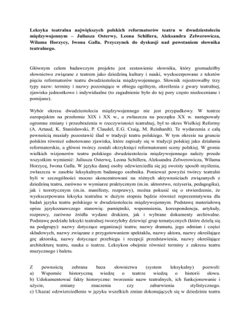Leksyka teatralna największych polskich reformatorów teatru w dwudziestoleciu międzywojennym – Juliusza Osterwy, Leona Schillera, Aleksandra Zelwerowicza, Wilama Horzycy, Iwona Galla. Przyczynek do dyskusji nad powstaniem słownika teatralnego. Głównym celem badawczym projektu jest zestawienie słownika, który gromadziłby słownictwo związane z teatrem jako dziedziną kultury i nauki, wyekscerpowane z tekstów pięciu reformatorów teatru dwudziestolecia międzywojennego. Słownik rejestrowałby trzy typy nazw: terminy i nazwy pozostające w obiegu ogólnym, określenia z gwary teatralnej, zjawiska jednostkowe i indywidualne (to zagadnienie było do tej pory często niedoceniane i pomijane). Wybór okresu dwudziestolecia międzywojennego nie jest przypadkowy. W teatrze europejskim na przełomie XIX i XX w., a zwłaszcza na początku XX w. następowały ogromne zmiany i przeobrażenia w rzeczywistości teatralnej, był to okres Wielkiej Reformy (A. Artaud, K. Stanisławski, P. Claudel, E.G. Craig, M. Reinhardt). Te wydarzenia z całą pewnością musiały pozostawić ślad w tradycji teatru polskiego. W tym okresie na gruncie polskim również odnotowano zjawiska, które zapisały się w tradycji polskiej jako działania reformatorskie, a główni twórcy zostali okrzyknięci reformatorami sceny polskiej. W gronie wielkich wizjonerów teatru polskiego dwudziestolecia międzywojennego należy przede wszystkim wymienić: Juliusza Osterwę, Leona Schillera, Aleksandra Zelwerowicza, Wilama Horzycę, Iwona Galla. W języku danej osoby odzwierciedla się jej swoisty sposób myślenia, zwłaszcza w zasobie leksykalnym badanego osobnika. Ponieważ powyżsi twórcy teatralni byli w szczególności mocno skoncentrowani na różnych aktywnościach związanych z dziedziną teatru, zarówno w wymiarze praktycznym (m.in. aktorstwo, reżyseria, pedagogika), jak i teoretycznym (m.in. manifesty, rozprawy), można pokusić się o stwierdzenie, że wyekscerpowana leksyka teatralna w dużym stopniu będzie również reprezentatywna dla badań języka teatru polskiego w dwudziestoleciu międzywojennym. Podstawę materiałową opisu językoznawczego stanowią: pamiętniki, wspomnienia, korespondencja, artykuły, rozprawy, zarówno źródła wydane drukiem, jak i wybrane dokumenty archiwalne. Podstawę podziału leksyki teatralnej tworzyłoby dziewięć grup tematycznych (które dzielą się na podgrupy): nazwy dotyczące organizacji teatru; nazwy dramatu, jego odmian i części składowych, nazwy związane z przygotowaniem spektaklu, nazwy aktora, nazwy określające grę aktorską, nazwy dotyczące przebiegu i recepcji przedstawienia, nazwy określające architekturę teatru, nauka o teatrze. Leksykon obejmie również terminy z zakresu teatru muzycznego i baletu. Z pewnością zebrana baza słownictwa (system leksykalny) pozwoli: a) Wspomóc historyczną wiedzę o teatrze wiedzą o historii słowa. b) Udokumentować fakty historyczne: tworzenie nazw teatralnych, ich funkcjonowanie i użycie, zmiany znaczenia czy zabarwienia stylistycznego. c) Ukazać odzwierciedlenie w języku wszelkich zmian dokonujących się w dziedzinie teatru (nowo powstające nazwy lub nowe znaczenia terminów już istniejących; wycofywanie nazw przestarzałych, nabieranie przez nazwy nowego odcienia emocjonalnego). Publikacja z pewnością będzie miała również ogromne znaczenie w dziedzinie leksykologii historycznej (uzupełnienie wiedzy językowej z danej epoki). Może być także częścią monografii dotyczącej języka teatru czy słownika teatralnego.
