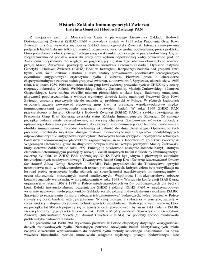 Historia Zakładu Immunogenetyki Zwierząt Instytutu Genetyki i Hodowli Zwierząt PAN Z inicjatywy prof. dr Mieczysława Czaji – pierwszego kierownika Zakładu Hodowli Doświadczalnej Zwierząt (ZHDZ) PAN – powołana została w 1955 roku Pracownia Grup Krwi Zwierząt, z której wywodzi się obecny Zakład Immunogenetyki Zwierząt. Intencją zainicjowania podjętych badań była nie tylko ich wartość poznawcza, lecz, co godne podkreślenia, presja praktyki, która potrzebowała obiektywnego, biologicznego wskaźnika, pomocnego w pracy hodowlanej. Ciężar zorganizowania od podstaw warsztatu pracy oraz wyboru odpowiedniej kadry powierzono prof. dr Antoniemu Spryszakowi. Ze względu na pogarszający się stan Jego zdrowia obowiązki te wkrótce przejął Maciej Żurkowski, późniejszy wieloletni kierownik Pracowni/Zakładu i Dyrektor Instytutu Genetyki i Hodowli Zwierzat (IGiHZ) PAN w Jastrzębcu. Rozpoczęto badania nad grupami krwi bydła, koni, świń, dzików i drobiu, a także analizy porównawcze podobieństw serologicznych czynników antygenowych erytrocytów bydła i żubrów. Pierwsza praca o charakterze eksperymentalnym z zakresu badań grup krwi zwierząt, autorstwa prof. Spryszaka, ukazała się w 1955 roku, a w latach 1959-1964 rezultatem badań grup krwi zwierząt prowadzonych w ZHDZ były cztery rozprawy doktorskie (Alfreda Wróblewskiego, Jolanty Gasparskiej, Macieja Żurkowskiego i Janusza Gasparskiego), które można określić mianem pionierskich w skali kraju. Badawczy entuzjazm, aktywność popularyzatorska, a wkrótce wymierny dorobek kadry naukowej Pracowni Grup Krwi Zwierząt, znacznie przyczyniły się do rozwoju tej problematyki w Polsce. W różnych krajowych ośrodkach zaczęły powstawać pracownie grup krwi, a przyjazne współzawodnictwo między immunogenetykami zaowocowało znaczącym rozwojem badań. W roku 1969 ZHDZ PAN przekształcono w Instytut Genetyki i Hodowli Zwierząt (IGiHZ) PAN, a szybko rozwijająca się Pracownia Grup Krwi Zwierząt uzyskała status Zakładu Immunogenetyki Zwierząt. Od samego początku badania miały ukierunkowany, aplikacyjny charakter. Zastosowane wówczas procedury optymalnego dobierania par dawca-biorca do celowych alloimmunizacji oraz techniki uzyskiwania i obróbki immunosurowic biorców zachowują aktualność do dnia dzisiejszego. Opanowanie tych procedur umożliwiło uzyskanie dużego zestawu monospecyficznych reagentów identyfikujących odpowiednie czynniki antygenowe erytrocytów. Rozwojowi badań sprzyjało utrzymywanie roboczych kontaktów z renomowanymi placówkami zagranicznymi, m.in. z laboratorium grup krwi zwierząt w Wageningen (Holandia), gdzie na długoterminowym stażu naukowym przebywał Maciej Żurkowski, który kierował Zakładem do roku 1997. Funkcję tę powierzono następnie Jolancie Kurył. Istotnym elementem determinującym późniejszy rozwój i kształt krajowych badań z dziedziny immunogenetyki zwierząt był fakt, że ZHDZ PAN (późniejszy IGiHZ PAN) był jednym z pierwszych członków instytucjonalnych międzynarodowego Towarzystwa Badań Grup Krwi Zwierząt (International Society for Animal Blood Group Research – ISABR). Fakt przynależności do Towarzystwa sprzyjał uczestnictwu m.in. w międzynarodowych testach porównawczych, których celem była weryfikacja na losowej próbie erytrocytów bydła różnych ras specyficzności uzyskiwanych immunoreagentów i ocena skuteczności stosowanych metod analitycznych. Współpraca i międzynarodowe robocze kontakty znalazły wyraz m.in. w zorganizowaniu w roku 1968 w Warszawie konferencji ISABR oraz organizacji w latach 1968 i 1979 w Polsce międzynarodowych testów porównawczych dla bydła i koni. Dzięki instytucjonalnemu uczestnictwu ZHDZ i później IGiHZ PAN w międzynarodowej wymianie naukowej, wielu pracowników Zakładu zostało później indywidualnymi członkami ISABR. Sprzyjało to rozszerzaniu formuły i obszaru ich zainteresowań badawczych, które również w Polsce stawały się coraz bardziej interdyscyplinarne. W całej biologii, a zwłaszcza w genetyce, zaczęły w coraz większym stopniu decydować techniki genetyki molekularnej. Ilustracją nowych wyzwań, które na początku lat 80-tych pojawiły się w genetyce cech jakościowych był m.in. fakt nadania ISABR szerszej formuły i jego przekształcenie w roku 1988 w Międzynarodowe Stowarzyszenie Genetyków Zwierząt (International Society for Animal Genetics – ISAG). W podobny sposób ewoluowała problematyka badawcza Zakładu. Na przełomie lat 1960/1961 wykonano pierwsze w Polsce ekspertyzy dotyczące wiarygodności danych rodowodowych bydła. Narastająca potrzeba rozwijania badań identyfikacyjnych miała związek z szerokim wprowadzaniem do hodowli bydła metody sztucznego unasieniania. Ta nowa wówczas biotechnika rozrodu umożliwiała osiąganie szybszego postępu hodowlanego, lecz 1 równocześnie sprzyjała powstawaniu pomyłek w zapisach dokumentacji hodowlanej. Jednym z obiektywnych czynników sprzyjających powstawaniu pomyłek jest występowanie rui u krów cielnych. Nie dysponowano wówczas metodą umożliwiającą ujawnianie takich przypadków. Brak dostatecznej wiedzy sprawiał, że wystąpienie rui u unasienionej krowy tłumaczono złą jakością zastosowanego nasienia i do ponownego zabiegu wykorzystywano nasienie innego reproduktora, któremu ostatecznie przypisywano ojcostwo urodzonego cielęcia. Pionierskie w kraju obserwacje na temat występowania i ujawnienia, poprzez badania grup krwi, przypadków występowania rui u krów cielnych, były przedmiotem rozprawy habilitacyjnej Macieja Żurkowskiego. Wykonywane w Zakładzie prace genetyczno-identyfikacyjne bydła oparte na serologii grupowej krwi i ich duża skuteczność w weryfikowaniu rzetelności zapisów rodowodowych (co było i jest niezwykle istotne m.in. dla prawidłowej wyceny wartości hodowlanej buhajów na podstawie oceny użytkowości potomstwa), znacznie wyprzedziły i w dużym 