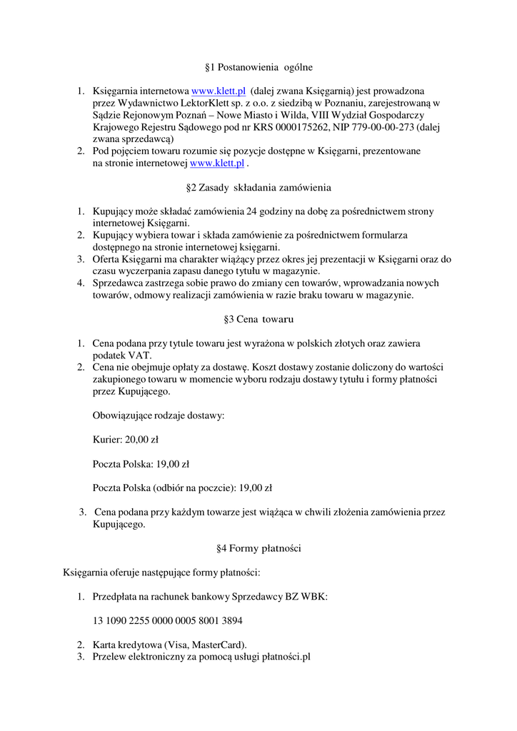 §1 Postanowienia ogólne 1. Księgarnia internetowa www.klett.pl (dalej zwana Księgarnią) jest prowadzona przez Wydawnictwo LektorKlett sp. z o.o. z siedzibą w Poznaniu, zarejestrowaną w Sądzie Rejonowym Poznań – Nowe Miasto i Wilda, VIII Wydział Gospodarczy Krajowego Rejestru Sądowego pod nr KRS 0000175262, NIP 779-00-00-273 (dalej zwana sprzedawcą) 2. Pod pojęciem towaru rozumie się pozycje dostępne w Księgarni, prezentowane na stronie internetowej www.klett.pl . §2 Zasady składania zamówienia 1. Kupujący może składać zamówienia 24 godziny na dobę za pośrednictwem strony internetowej Księgarni. 2. Kupujący wybiera towar i składa zamówienie za pośrednictwem formularza dostępnego na stronie internetowej księgarni. 3. Oferta Księgarni ma charakter wiążący przez okres jej prezentacji w Księgarni oraz do czasu wyczerpania zapasu danego tytułu w magazynie. 4. Sprzedawca zastrzega sobie prawo do zmiany cen towarów, wprowadzania nowych towarów, odmowy realizacji zamówienia w razie braku towaru w magazynie. §3 Cena towaru 1. Cena podana przy tytule towaru jest wyrażona w polskich złotych oraz zawiera podatek VAT. 2. Cena nie obejmuje opłaty za dostawę. Koszt dostawy zostanie doliczony do wartości zakupionego towaru w momencie wyboru rodzaju dostawy tytułu i formy płatności przez Kupującego. Obowiązujące rodzaje dostawy: Kurier: 20,00 zł Poczta Polska: 19,00 zł Poczta Polska (odbiór na poczcie): 19,00 zł 3. Cena podana przy każdym towarze jest wiążąca w chwili złożenia zamówienia przez Kupującego. §4 Formy płatności Księgarnia oferuje następujące formy płatności: 1. Przedpłata na rachunek bankowy Sprzedawcy BZ WBK: 13 1090 2255 0000 0005 8001 3894 2. Karta kredytowa (Visa, MasterCard). 3. Przelew elektroniczny za pomocą usługi płatności.pl 4. Przesyłka za pobraniem §5 Realizacja zamówienia 1. Warunkiem realizacji zamówienia jest jego potwierdzenie w systemie obsługi księgarni internetowej na stronie www.klett.pl lub po zaksięgowaniu pieniędzy na rachunku bankowym Sprzedawcy, wskazanym w § 4. 2. Zamówienia są realizowane zgodnie z kolejnością ich otrzymywania do momentu wyczerpania zapasów towarów w magazynie. 3. O braku w magazynie jakiegokolwiek zamówionego tytułu powiadamiamy za pomocą poczty elektronicznej lub telefonicznie. 4. W przypadku, gdy zamówienie obejmuje kilka pozycji towarów i wystąpią trudności z uzyskaniem wszystkich zamówionych tytułów, w celu zminimalizowania kosztów dostawy zamówienie realizowane będzie w dłuższym czasie (tylko opłata jednorazowa). Jednak na życzenie Klienta Księgarnia może podzielić zamówienie na kilka partii, każdorazowo pobierając od niego koszty przesyłki. 5. Zamówienie może zostać anulowane telefonicznie pod numerem 61 8496 223 w ciągu 1 dnia od złożenia zamówienia/pod warunkiem, że nie zostało zrealizowane (tj. przekazane do wysyłki). 6. Sprzedawca realizuje zamówienia za pośrednictwem Poczty Polskiej lub kurierem. 7. Księgarnia nie realizuje wysyłki poza granicę Polski. 8. Sprzedawca nie ponosi odpowiedzialności za niedostarczenie towaru lub opóźnienie w dostawie spowodowane błędnym lub niedokładnym adresem podanym przez Kupującego, jak również za opóźnienie w dostarczeniu towaru spowodowane przez działanie dostawcy (Poczty Polskiej lub kuriera). 9. Sprzedawca wystawia za zakupiony towar paragon lub fakturę VAT; odpowiedni dokument dołączany jest do przesyłki z towarem. Dokonując zakupu w Księgarni Kupujący wyraża zgodę na wystawienie faktury VAT bez podpisu odbiorcy. §6 Prawo odstąpienia od umowy 1. Zgodnie z obowiązującymi przepisami prawa, Użytkownik będący Konsumentem, który nabył produkt, ma prawo bez podania przyczyny i bez ponoszenia kosztów (z wyjątkiem kosztów zwrotnej wysyłki produktów do Wydawnictwa), odstąpić od umowy sprzedaży produktów zakupionych w Księgarni w ciągu 14 dni od dnia wydania rzeczy (odebrania towaru przez Użytkownika lub upoważnioną przez niego inną osobę). Do zachowania tego terminu wystarczy wysłanie oświadczenia przed jego upływem. 2. Oświadczenie o odstąpieniu od umowy może być złożone Wydawnictwu w dowolny sposób, zapewniający jednak Wydawnictwu możliwość zapoznania się z jego treścią. 3. Jest to możliwe tylko wówczas, gdy towar nie był używany, kopiowany ani nie został w żaden sposób zniszczony. Zwracane towary muszą być kompletne. Towary zabezpieczone fabrycznie przed otwarciem nie mogą być zwrócone po zdjęciu folii lub usunięciu zabezpieczeń, zniszczeniu pudełka. Książki, kursy językowe w pudełkach, Płyty CD, płyty DVD muszą być zwracane w oryginalnym, nienaruszonym opakowaniu (nieusunięta folia, niezniszczone pudełko). 4. Zwrot towaru następuje na koszt Kupującego. Razem z towarem należy zwrócić otrzymany dowód zakupu. Towar należy przesyłać na adres: LektorKlett - Arvato Services Polska Panattoni Park Poznań ul. Składowa 11 Żerniki 62-023 Gądki k/Poznania 5. Sprzedawca gwarantuje zwrot ceny towaru wraz z kosztem dostawy. 6. Pieniądze zostaną odesłane niezwłocznie po otrzymaniu przez Sprzedawcę przesyłki na wskazany przez Kupującego numer rachunku bankowego. § 7 Reklamacje 1. W przypadku niezgodności towaru z umową, Kupującemu przysługuje prawo do reklamacji towaru. 2. Warunkiem dla rozpoznania reklamacji jest odesłanie towaru na adres: LektorKlett - Arvato Services Polska Panattoni Park Poznań ul. Składowa 11 Żerniki 62-023 Gądki k/Poznania z dopiskiem REKLAMACJA wraz z dowodem zakupu oraz z pisemnym wskazaniem przyczyny zwrotu. Koszt wysyłki pokrywa Kupujący. 3. Sprzedawca rozpatruje reklamację w ciągu 14 dni od jej otrzymania. 4. W przypadku pozytywnego rozpoznania reklamacji, Sprzedawca wymieni towar na nowy, a jeśli powyższe okaże się niemożliwe zwróci należność za towar podlegający reklamacji na rachunek bankowy wskazany przez Kupującego lub zapro