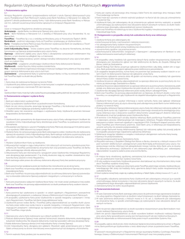 Regulamin Użytkowania Podarunkowych Kart Płatniczych mypremium I. Postanowienia ogólne §1 Niniejszy Regulamin używania i przeprowadzania rozliczeń z tytułu Operacji dokonywanych przy użyciu Przedpłaconych Kart Płatniczych wydany przez Bank Handlowy w Warszawie S.A. (dalej „Regulamin”) określa podstawowe zasady, formy i tryb dokonywania przez Bank Handlowy w Warszawie S.A., rozliczeń za pomocą instrumentów opisanych w niniejszym Regulaminie. §2 Użyte w niniejszym Regulaminie określenia oznaczają: Autoryzacja – zgoda Banku na dokonanie Operacji przy użyciu Karty; Bank – Bank Handlowy w Warszawie S.A. z siedzibą w Warszawie przy ulicy Senatorskiej 16, wydawca Kart; TravelPass – TravelPass Sp. z o.o. z siedzibą we Wrocławiu, przy ul. Powstańców Śląskich 28/30; Kontrahent – podmiot nabywający Karty od TravelPass i przekazujący je Użytkownikom; Karta – Przedpłacona Karta Płatnicza typu Visa Electron wydana przez Bank we współpracy z TravelPass, będąca kartą bezimienną bez PIN; Limit Indywidualny Karty – kwota ustalona przez TravelPass na zlecenie Kontrahenta, do której honorowane są Operacje przeprowadzane przy użyciu Karty; Operacja – dokonanie zapłaty przy użyciu Karty u akceptantów oznaczonych emblematem Visa Electron, w tym również na odległość (np. w Internecie); System Visa – międzynarodowy system obsługi transakcji dokonywanych przy użyciu kart płatniczych ze znakiem Visa; Terminal POS – urządzenie umożliwiające Użytkownikowi Karty dokonywanie Operacji; Użytkownik – osoba fizyczna, której wydana została Karta; Visa – międzynarodowa organizacja zrzeszająca instytucje wydające karty płatnicze Visa oraz obsługujące operacje dokonywane przy użyciu tych kart; Zastrzeżenie – unieważnienie Karty w systemie kartowym Banku i w Visa, na wniosek Użytkownika lub TravelPass bądź na skutek decyzji Banku. §3 1.Karta służy do realizowania Operacji na terenie Polski. 2.Użytkownik przy dokonywaniu Operacji może korzystać z urządzeń akceptujących karty Visa Electron w szczególności z terminala POS lub Internetu. §4 Użytkownikiem Karty może być tylko osoba fizyczna posiadająca pełną zdolność do czynności prawnych. II. Postanowienia wstępne i wydanie Karty §5 1.Bank jest właścicielem wydanych Kart. 2.Karty są wydawane Użytkownikom za pośrednictwem Kontrahenta, 3.Bank nie jest stroną stosunku prawnego łączącego TravelPass z Kontrahentem ani Kontrahenta z Użytkownikiem będącego przesłanką wydania Karty. 4.Wszelkie spory lub roszczenia wynikające z użytkowania Karty Użytkownik powinien kierować bezpośrednio do Kontrahenta. §6 1.Użytkownik jest upoważniony do dysponowania przy użyciu Karty udostępnionymi środkami do wysokości Limitu Indywidualnego Karty określonego przez TravelPass na podstawie zamówienia Kontrahenta. 2.Dla pojedynczej Operacji z użyciem Przedpłaconej Karty Płatniczej obowiązuje limit jednej operacji w wysokości 3000 (słownie trzy tysiące) złotych. 3.Wydanie Karty nie oznacza przyjęcia przez Bank zobowiązania wobec Użytkownika do realizowania operacji do wysokości Limitu Indywidualnego Karty. Bank realizuje rozliczenia za pomocą Karty pod warunkiem udostępnienia przez TravelPass środków niezbędnych do dokonania rozliczenia. §7 1.Wydane Użytkownikom Karty są nieaktywne. 2.Aktywacja Kart nastąpi w ciągu maksymalnie 2 dni roboczych od momentu przesłania przez Kontrahenta do TravelPass potwierdzenia otrzymania Kart oraz przesłania przez TravelPass do Banku pliku zawierającego rekordy aktywacyjne Kart. 3.Aktywowanie Karty jest równoznaczne z przyjęciem przez Użytkownika niniejszego Regulaminu oraz akceptacją jego postanowień. Z tą chwilą skuteczne stają się wszelkie oświadczenia Użytkownika Karty zawarte w treści Regulaminu. 4.Bank zastrzega sobie prawo do odmowy dokonania aktywacji Karty bez podania przyczyny. §8 1.Karta powinna być podpisana przez jej Użytkownika niezwłocznie po jej otrzymaniu. 2.Bank oraz TravelPass nie ponoszą odpowiedzialności za odmowę dokonania Operacji przy użyciu niepodpisanej Karty. 3.Bank oraz TravelPass nie ponoszą odpowiedzialności za odmowę dokonania Operacji potwierdzanej na dowodzie dokonania Operacji podpisem niezgodnym z umieszczonym na Karcie. §9 1.Karta jest przyznawana wyłącznie Użytkownikowi Karty i nie może zostać przekazana innej osobie. Bank oraz TravelPass nie ponoszą odpowiedzialności za skutki przekazania Karty osobom trzecim. III. Użytkowanie Karty § 10 1.Karta powinna być użytkowana w sposób i w celach zgodnych z Regulaminem, powszechnie obowiązujących przepisami, a zwłaszcza Ustawą o Elektronicznych Instrumentach Płatniczych. 2.W przypadku użytkowania Karty przez Użytkownika w sposób niezgodny z przepisami i niniejszym Regulaminem, TravelPass lub Bank mogą zablokować kartę. 3.Użytkownik ponosi wobec Banku i TravelPass pełną odpowiedzialność za wszelkie skutki używania Karty przez siebie oraz osoby trzecie w sposób niezgodny z niniejszym Regulaminem i obowiązującymi przepisami i zobowiązuje się naprawić ewentualne szkody poniesione przez Bank lub/i TravelPass z tego tytułu. § 11 1.Operacje przy użyciu Karty realizowane są w złotych polskich (PLN). 2.Podczas dokonywania Operacji może zaistnieć konieczność okazania dokumentu stwierdzającego tożsamość Użytkownika. Nie okazanie dokumentu może być powodem odmowy akceptacji Karty. 3.Każda dokonana Operacja obniża Limit Indywidualny Karty o kwotę Operacji. 4.Limit Indywidualny Karty obciążany jest opłatami. Wysokość opłat prezentowana jest w Tabeli Opłat umieszczonej na stronie internetowej www.mypremium.pl lub dostępnej u Kontrahenta. § 12 1.Termin ważności Karty podany jest na awersie Karty. 2.Karta jest ważna od pierwszego dnia miesiąca (Valid From) do ostatniego dnia miesiąca (Valid Thru) podanego na Karcie. 3.Karta może być używana w okresi