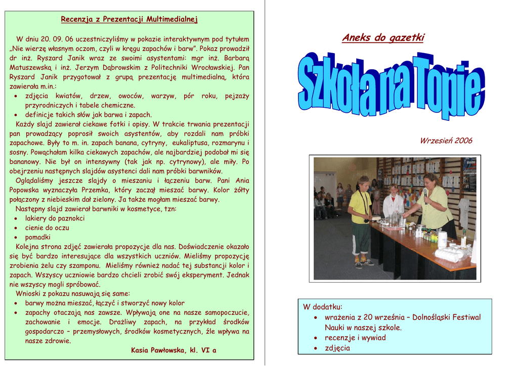 Recenzja z Prezentacji Multimedialnej W dniu 20. 09. 06 uczestniczyliśmy w pokazie interaktywnym pod tytułem „Nie wierzę własnym oczom, czyli w kręgu zapachów i barw”. Pokaz prowadził dr inż. Ryszard Janik wraz ze swoimi asystentami: mgr inż. Barbarą Matuszewską i inż. Jerzym Dąbrowskim z Politechniki Wrocławskiej. Pan Ryszard Janik przygotował z grupą prezentację multimedialną, która zawierała m.in.: • zdjęcia kwiatów, drzew, owoców, warzyw, pór roku, pejzaży przyrodniczych i tabele chemiczne. • definicje takich słów jak barwa i zapach. Każdy slajd zawierał ciekawe fotki i opisy. W trakcie trwania prezentacji pan prowadzący poprosił swoich asystentów, aby rozdali nam próbki zapachowe. Były to m. in. zapach banana, cytryny, eukaliptusa, rozmarynu i sosny. Powąchałam kilka ciekawych zapachów, ale najbardziej podobał mi się bananowy. Nie był on intensywny (tak jak np. cytrynowy), ale miły. Po obejrzeniu następnych slajdów asystenci dali nam próbki barwników. Oglądaliśmy jeszcze slajdy o mieszaniu i łączeniu barw. Pani Ania Popowska wyznaczyła Przemka, który zaczął mieszać barwy. Kolor żółty połączony z niebieskim dał zielony. Ja także mogłam mieszać barwy. Następny slajd zawierał barwniki w kosmetyce, tzn: • lakiery do paznokci • cienie do oczu • pomadki Kolejna strona zdjęć zawierała propozycje dla nas. Doświadczenie okazało się być bardzo interesujące dla wszystkich uczniów. Mieliśmy propozycję zrobienia żelu czy szamponu. Mieliśmy również nadać tej substancji kolor i zapach. Wszyscy uczniowie bardzo chcieli zrobić swój eksperyment. Jednak nie wszyscy mogli spróbować. Wnioski z pokazu nasuwają się same: • barwy można mieszać, łączyć i stworzyć nowy kolor • zapachy otaczają nas zawsze. Wpływają one na nasze samopoczucie, zachowanie i emocje. Drażliwy zapach, na przykład środków gospodarczo – przemysłowych, środków kosmetycznych, źle wpływa na nasze zdrowie. Kasia Pawłowska, kl. VI a Aneks do gazetki Wrzesień 2006 W dodatku: • wrażenia z 20 września – Dolnośląski Festiwal Nauki w naszej szkole. • recenzje i wywiad • zdjęcia Trochę aktualności... Na kilka dni przed 20 września dowiedzieliśmy się, że Instytut Niskich Temperatur i Badań Strukturalnych PAN niestety nie zagości w naszej szkole. W zamian odbyła się prezentacja multimedialna zatytułowana „Nie wierzę własnym oczom, czyli w kręgu zapachów i barw”, którą przeprowadzili naukowcy z Politechniki Wrocławskiej. Recenzja z tego pokazu znajduje się na ostatniej stronie naszej gazetki. Pozostałe dwa interaktywne wykłady odbyły się zgodnie z planem. Gościły u nas różne szkoły podstawowe oraz gimnazja, które również brały udział w pokazach. Wywiad z dr inż. Krzysztofem Matkowskim z Katedry Ochrony Roślin w Akademii Rolniczej. Rozmowa została przeprowadzona 20. 09. 06 w SP 96 z okazji interaktywnego pokazu pt. „Czy warto kupić mikroskop? Grzyby, których nie dostrzegamy”. P: Chciałybyśmy zadać kilka pytań na temat pana pracy. Gdzie Pan pracuje? O: Pracuję w pracowni hitopatologii. Jest to nauka o chorobach roślin, a ponieważ grzyby są główną przyczyną chorób roślin, zajmuję się głównie grzybami. Pracuję na Akademii rolniczej we Wrocławiu. P: Jak to się stało, że przyjechał Pan do naszej szkoły? O: Pani, która uczy was przyrody, zaprosiła mnie do waszej szkoły. Jak powiedziała, że są tu bardzo fajne dzieci i będzie można z nimi ciekawie porozmawiać, to od razu się zgodziłem. P: Czym się Pan kierował wybierając zawód naukowca? O: Chyba tym, ze zawsze mnie ciekawiła przyroda i świat. Już jak miałem 5 albo 6 lat, to już wiedziałem, że będę naukowcem. Jak się czegoś bardzo chce, to na pewno się to osiągnie. Recenzja z pokazu „Czy warto kupić mikroskop? Grzyby, których nie dostrzegamy”. 20 września byłam na pokazie o grzybach. Prezentacja odbyła się w naszej szkole w ramach IX Dolnośląskiego Festiwalu Nauki. Miły Pan naukowiec ze swoją asystentką zrobili dla nas prezentację multimedialną. Bardzo mi się podobał. Pan naukowiec pokazywał nam ciekawe grzyby powiększone pod mikroskopem. Mówił, że drożdże to też grzyby i gdy mają pod dostatkiem cukru i mleka, mogą się potężnie rozrosnąć. Najbardziej podobał mi się mikroskop naukowy. Jedynym minusem byli gadający koledzy i koleżanki w pierwszym rzędzie, którzy swoim gadulstwem rozpraszali całą klasę. Było ciekawie, pięknie, cudownie...po prostu super! Dominika Nowakowska Zdjęcia z interaktywnego pokazu „ O tym co tworzy pianę, bąbelki, lody bakaliowe, aerozole i kosmetyki” P: Czy w dzieciństwie marzył Pan i pracy naukowej? O: Tak, marzyłem i rzeczywiście chciałem zostać naukowcem. Zawsze mnie interesował przyroda i zawsze tę przyrodę oglądałem. P: A czy lubi Pan swój zawód? O: Bardzo lubię, nigdy nie żałowałem, ze taki zawód wybrałem i myślę, że zawsze z przyjemnością będę go wykonywał. P: Od kiedy zaczął się Pan interesować grzybami? O: Grzybami interesuję się od 1989 roku, czyli 17 lat. Ale powiem wam, że wcześniej grzyby mnie nie interesowały, chciałem być naukowcem w innej dziedzinie. Ponieważ jednak dowiedziałem się, że o grzybach niewiele wiadomo, zająłem się grzybami, bo chciałem mieć swój wkład w ich poznawaniu. DN: Dziękujemy Panu za udzielenie wywiadu, który zostanie opublikowany w gazetce naszej szkoły. KM: Ja również wam bardzo dziękuję, rozumiem, że jesteście redaktorkami tej gazetki. Tak? Bardzo mi było miło, że przeprowadziłyście ze mną wywiad. Wywiad przeprowadziły uczennice kl. Va, Dominika Nowakowska i Paulina Skoropada pod opieką p. Bożeny Troczyńskiej Fot. Jakub Drzazga Nasze wrażenia po pokazach.... Dnia 20. września 2006 roku do Szkoły Podstawowej nr 96 im. Leonida Teligi na lekcję pokazową przyjechali naukowcy z Politechniki Wr
