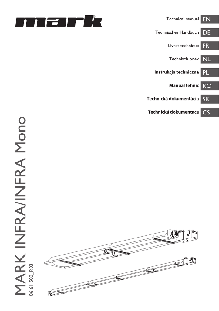Technical manual EN Technisches Handbuch DE Livret technique FR Technisch boek NL Instrukcja techniczna 06 61 500_R03 MARK INFRA/INFRA Mono Manual tehnic PL RO Technická dokumentácia SK Technická dokumentace CS 2 EN Read this document before installing the appliance Warning An incorrectly performed installation, adjustment, alteration, repair or maintenance activity may lead to material damage, injury or explosion.All work must be carried out by approved, qualified professionals. If the appliance is not positioned in accordance with the instructions, the warranty shall be voided. If the manual refers to an image or table, a number will be shown between square brackets, for example [3].The number refers to images and tables at the back of the manual with the stated number. 1.0 General 1.1 Application: The Infra radiant heater heats the room through a fully automatic gas burner with electrical ignition and complete protection. The flue gases are conducted by the heater tubes, which makes them hot. On account of the danger of corrosion, radiant heaters cannot be used in areas where there are corrosive fumes. This relates in particular to chlorinated hydrocarbons which are either produced directly in the area, or may be drawn in from the outside by the heater via a connection or an open connector. Subject to change The manufacturer is committed to constantly improving its products and reserves the right to make changes in the specifications without prior notice.The technical details are considered correct but do not form the basis for a contract or warranty.All orders are accepted according to the standard terms of our sales and delivery conditions (available upon request). 1.2 Type designation INFRA Infra 13 B/C (H/L) Infra 22 B/C (H/L) Infra 38 B/C (H/L) Infra 50 (H/L) INFRA Mono Infra mono 22 B/C (H/L) Infra mono 38 B/C (H/L) (H/L) : High Low B : Combustion air from room C : Closed appliance 3 All types of appliance are listed in Table [1]. See the legend below. T Type A Nominal power B * Nominal load (lower value) C Gas consumption (15°C) D Burner pressure (H/L = high/low type) E Weight F Electrical power G Recommended suspension height, horizontal H Recommended suspension height, 30° angle I Injector diameter G20/G25 J Injector diameter G30/G31 K Diameter of gas connection L Minimum suspension height between any obstacles * High/low type: low load is 80% of high load. 1.3 General warnings An incorrect installation, adjustment, alteration, maintenance activity or repair may lead to material or environmental damage and/or injuries.The appliance should therefore be installed, adapted or converted by a skilled and qualified installer, taking into account national and international regulations.A faulty installation, adjustment, alteration, maintenance activity or repair shall void the warranty. Appliance When installing radiant heaters, observe the national and, if applicable, regional and local regulations (e.g. gas company regulations, building regulations etc.). Installation of a radiant heater is only permitted in an area and a position suitable for the purpose, see Chapter 2 Positioning the appliance. Gas supply and connection Before installation check that the local distribution conditions, gas type and pressure and the current adjustment of the appliance all match.An approved gas stop cock and flexible connection must be fitted to the inner pipeline. Flue gas exhaust and outlet vent / exhaust duct Combustion air supply pipelines and flue gas exhaust ducts should contain as few bends as possible. In general, the resistance should be kept to a minimum and in all cases the diameter should be constant along its entire length.The duct may not rest on the radiant heater but should be suspended efficiently! If the flue gas exhaust duct passes along or through combustible walls or floors, the duct must be sufficiently free to prevent fire. 1.4 Think of your safety If you smell gas, it is expressly prohibited – To ignite an appliance – To touch electrical switches, or to telephone from the area in question Take the following actions – Switch off the gas and electricity – Activate the operational emergency plan Evacuate everyone from the building 4 2.0 Positioning the appliance EN After unpacking, check the unit for damage. Check the accuracy of the type/model, the voltage (230 V) and the gas type.When determining the suspension height, remember to keep a sufficient distance from any crane gantries. If necessary, shield any flammable goods. Place the appliance and any accessories on a sufficiently solid structure, taking into account the minimum required free space.Wall-mounting support frames are available to order. [1] [2] INFRA / INFRA MONO The radiant heater can be suspended with galvanised chains with links with a minimum diameter of 4 mm and with 10 mm cross bars with good rust protection. In order to suspend the radiant heaters in the right way, it is advisable to use eyebolts with which the radiant heaters can be readily adjusted to the correct height.The radiant heaters can be suspended at a maximum inclination of 30°. If the radiant heaters are suspended inclined, the burner is installed horizontally TO THE LOWEST TUBE on the right, as seen from the heated area.The radiant heater must be mounted with the flue sloping with a drop of approximately 25 mm [3]. 2.1 Installing the appliance General [4]. – Spread out the heater tubes (E) and attach them to each other using the supplied fastening materials. – The stainless steel burner tube (K) is for Germany – Attach the bend * (F) to the heater tubes and, if applicable, add the retarder (J). – Attach the suspension brackets (H) by means of straps to the correct position on the heater tubes. Note! The first strap from the burner should not be fastened, to allow for expansion. – Attach the reflectors to the suspension brackets. – Next, the burner (A) and, if applicable, the flue fan (B) can be mounted. – Once all t
