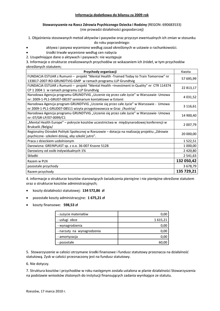 Informacja dodatkowa do bilansu za 2009 rok Stowarzyszenie na Rzecz Zdrowia Psychicznego Dziecka i Rodziny (REGON: 690683533) (nie prowadzi działalności gospodarczej) 1. Objaśnienia stosowanych metod aktywów i pasywów oraz przyczyn ewentualnych ich zmian w stosunku do roku poprzedniego: • aktywa i pasywa wyceniono według zasad określonych w ustawie o rachunkowości. • środki trwałe wycenione według cen nabycia 2. Uzupełniające dane o aktywach i pasywach: nie występuje 3. Informacje o strukturze zrealizowanych przychodów ze wskazaniem ich źródeł, w tym przychodów określonych statutem; Przychody organizacji FUNDACJA ESTUAR z Rumunii – projekt “Mental Health -Trained Today to Train Tomorrow” nr 133817-2007-RO-GRUNDTVIG-GMP w ramach programu LLP Grundtvig FUNDACJA ESTUAR z Rumunii – projekt “Mental Health –Investment in Quality” nr CTR 114374 CP 1 2004 1 w ramach programu LLP Grundtvig Narodowa Agencja programu GRUNDTVIG „Uczenie się przez całe życie” w Warszawie- Umowa nr: 2009-1-PL1-GRU07-08197 seminarium kontaktowe w Estonii Narodowa Agencja program GRUNDTVIG „Uczenie się przez całe życie” w Warszawie - Umowa nr 2009-1-PL1-GRUD07-08511 wizyta przygotowawcza w Graz /Austria/ Narodowa Agencja programu GRUNDTVIG „Uczenie się przez całe życie” w Warszawie- Umowa nr: 07/GR-LP/07-0099/C1 „Mental Health Europe” – pokrycie kosztów uczestnictwa w międzynarodowej konferencji w Brukselii /Belgia/ Regionalny Ośrodek Polityki Społecznej w Rzeszowie – dotacja na realizację projektu „Zdrowie psychiczne- szkoleni dzisiaj, aby szkolić jutro”. Praca z dzieckiem uzdolnionym Darowizna: GREINPLAST sp. z o.o. 36-007 Krasne 512B Darowizny od osób indywidualnych 1% Składki Kwota 57 695,99 22 813,17 4 031,52 3 116,61 14 900,40 2 007,79 20 000,00 1 522,51 1 000,00 2 420,80 2 541,63 Razem w PLN pozostałe przychody 132 050,42 Razem przychody 135 729,21 3 678,79 4. informacje o strukturze kosztów stanowiących świadczenia pieniężne i nie pieniężne określone statutem oraz o strukturze kosztów administracyjnych; • koszty działalności statutowej: 134 572,86 zł • pozostałe koszty administracyjne: 1 675,21 zł • koszty finansowe: 598,53 zł - zużycie materiałów - usługi obce 0,00 1 615,21 - wynagrodzenia 0,00 - narzuty na wynagrodzenia 0,00 - amortyzacja - pozostałe 0,00 60,00 5. Stowarzyszenie w całości otrzymane środki finansowe i fundusz statutowy przeznacza na działalność statutową. Zysk w całości przeznaczony jest na fundusz statutowy. 6. Nie dotyczy. 7. Struktura kosztów i przychodów w roku następnym została ustalona w planie działalności Stowarzyszenia na podstawie wniosków złożonych do instytucji finansujących zadania wynikające ze statutu. Rzeszów, 17 marca 2010 r.