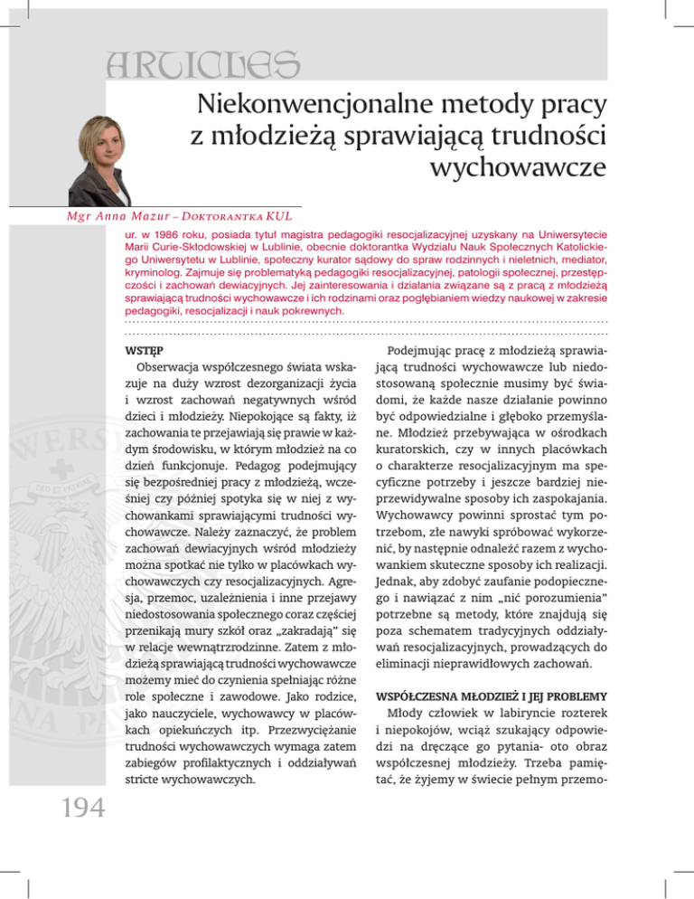 ARTICLES Niekonwencjonalne metody pracy z młodzieżą sprawiającą trudności wychowawcze Mg r A nna Ma zur – Doktorantka KUL ur. w 1986 roku, posiada tytuł magistra pedagogiki resocjalizacyjnej uzyskany na Uniwersytecie Marii Curie-Skłodowskiej w Lublinie, obecnie doktorantka Wydziału Nauk Społecznych Katolickiego Uniwersytetu w Lublinie, społeczny kurator sądowy do spraw rodzinnych i nieletnich, mediator, kryminolog. Zajmuje się problematyką pedagogiki resocjalizacyjnej, patologii społecznej, przestępczości i zachowań dewiacyjnych. Jej zainteresowania i działania związane są z pracą z młodzieżą sprawiającą trudności wychowawcze i ich rodzinami oraz pogłębianiem wiedzy naukowej w zakresie pedagogiki, resocjalizacji i nauk pokrewnych. Wstęp Obserwacja współczesnego świata wskazuje na duży wzrost dezorganizacji życia i wzrost zachowań negatywnych wśród dzieci i młodzieży. Niepokojące są fakty, iż zachowania te przejawiają się prawie w każdym środowisku, w którym młodzież na co dzień funkcjonuje. Pedagog podejmujący się bezpośredniej pracy z młodzieżą, wcześniej czy później spotyka się w niej z wychowankami sprawiającymi trudności wychowawcze. Należy zaznaczyć, że problem zachowań dewiacyjnych wśród młodzieży można spotkać nie tylko w placówkach wychowawczych czy resocjalizacyjnych. Agresja, przemoc, uzależnienia i inne przejawy niedostosowania społecznego coraz częściej przenikają mury szkół oraz „zakradają” się w relacje wewnątrzrodzinne. Zatem z młodzieżą sprawiającą trudności wychowawcze możemy mieć do czynienia spełniając różne role społeczne i zawodowe. Jako rodzice, jako nauczyciele, wychowawcy w placówkach opiekuńczych itp. Przezwyciężanie trudności wychowawczych wymaga zatem zabiegów profilaktycznych i oddziaływań stricte wychowawczych. 194 Podejmując pracę z młodzieżą sprawiającą trudności wychowawcze lub niedostosowaną społecznie musimy być świadomi, że każde nasze działanie powinno być odpowiedzialne i głęboko przemyślane. Młodzież przebywająca w ośrodkach kuratorskich, czy w innych placówkach o charakterze resocjalizacyjnym ma specyficzne potrzeby i jeszcze bardziej nieprzewidywalne sposoby ich zaspokajania. Wychowawcy powinni sprostać tym potrzebom, złe nawyki spróbować wykorzenić, by następnie odnaleźć razem z wychowankiem skuteczne sposoby ich realizacji. Jednak, aby zdobyć zaufanie podopiecznego i nawiązać z nim „nić porozumienia” potrzebne są metody, które znajdują się poza schematem tradycyjnych oddziaływań resocjalizacyjnych, prowadzących do eliminacji nieprawidłowych zachowań. Współczesna młodzież i jej problemy Młody człowiek w labiryncie rozterek i niepokojów, wciąż szukający odpowiedzi na dręczące go pytania- oto obraz współczesnej młodzieży. Trzeba pamiętać, że żyjemy w świecie pełnym przemo- ARTYKUŁY cy, agresji, brutalizacji życia codziennego, zawładniętego przez sidła Internetu i telewizji. Niewątpliwie jest to świat, w którym brakuje czułości, wrażliwości na ludzką krzywdę i przede wszystkim wzajemnej miłości. Młodzież poprostu często zatraca się w codziennych problemach, nie radząc sobie z ich rozwiązaniem, a efektem są przejawiane przez nią trudności wychowawcze. Andrzej Lewicki trudnościami wychowawczymi nazywa „takie zachowanie dzieci, które jest niezgodne z przyjętymi normami życia społecznego, równocześnie uporczywe i nie poddające się zwykłym zabiegom wychowawczym”. Autor mówiąc o trudnościach wychowawczych ma na myśli tkwiące w samej pracy wychowawczej, a nie w dziecku1. Pojęcie „trudności wychowawcze” jest zamiennie używane z takimi pojęciami, jak np. „nieprzystosowanie”, czy „niedostosowanie społeczne”. Jan Konopnicki zastąpił nazwę „trudności wychowawcze” terminem „niedostosowanie społeczne”. Według niego dziecko niedostosowane społecznie sprawia swym zachowaniem wiele kłopotów, których samo nie jest w stanie rozwiązać. Jego reakcje są trudne do przewidzenia i nieproporcjonalne do bodźców, które je wywołały. Dziecko takie napotyka różne niepowodzenia, nie ma możliwości przeżywania sukcesów i dlatego czuje się nieszczęśliwe, co stanowi główną cechę niedostosowania społecznego. Jest również rzadko lubiane przez inne dzieci i przez dorosłych. Nie ma ono zaufania do innych, z trudnością nawiązuje kontakty i przyjaźnie. Nie mogąc w spo1 sób normalny zaspokoić swoich potrzeb, czyni to w sposób okrężny, nieprzyjemny dla otoczenia, a nawet antyspołeczny. Ta ogólna charakterystyka dziecka niedostosowanego społecznie pozwala stwierdzić, że trudności wychowawcze leżą zarówno w sferze jego osobowości, jak i czysto zewnętrznych zachowań2. Maria Przetacznikowa używa terminu „trudności wychowawcze” zamiennie z pojęciem „nieprzystosowanie społeczne”, przez co rozumie trudności przystosowawcze lżejszego stopnia. Pojęcie „niedostosowanie społeczne” łączy ze zjawiskiem wykolejenia i przestępczością nieletnich. Tak więc dzieci nieprzystosowane społecznie wymagają oddziaływań pedagogicznych, a dzieci niedostosowane społecznie specjalnych zabiegów resocjalizacyjnych3. Krystyna Ostrowska uważa, iż nieprzystosowane społecznie dzieci i młodzież to te „[…] o poważnie zaburzonej postawie wobec zasadniczych wymagań społecznych. Zachowanie ich nacechowane jest nieprzestrzeganiem podstawowych zasad postępowania i norm społecznych obowiązujących młodzież w tym wieku. Zachowania te nie mają charakteru sporadycznego, ale są względnie trwałe”4. Wczesne rozpoznanie dzieci, które wykazują trudności wychowawcze daje szanse na szybkie ich przezwyciężenie. Łatwe bowiem jest skorygowanie niepoprawnych zachowań w początkowej fazie ich występowania. Powszechnie obserwuje się wzrost brutalności i bezwzględności w postawach i 