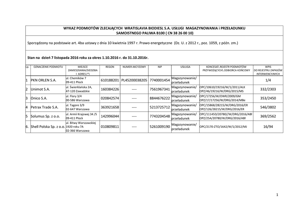 1 WYKAZ PODMIOTÓW ZLECAJĄCYCH WRATISLAVIA BIODIESL