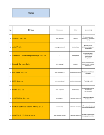 Mielec Firma Lp. 1 AERO AT Sp. z o.o. 2 AGMAR S.A. Strona www Sektor Typ produkcji www.at-3.com lotniczy Produkcja sprzętu lotniczego - samolotów AT-3 www.agmar.com.pl elektroniczny Produkcja szaf telekomunikacyjnych i serwerowych - motoryzacja Produkcja części i podzespołów do samochodów klasycznych www.basco.pl metalowy Produkcja elementów łącznikowych instalacji grzewczych 3 Automotive Coachbuilding and Design Sp. z o.o. 4 Basco 2 Sp. z o.o. Sp.k. 5 Blek Meble Sp. z o.o. www.brwmielec.pl przetwórstwo drewna Produkcja mebli/mebli biurowych 6 BRW Sp. z o.o. www.brwmielec.pl przetwórstwo drewna Produkcja mebli 7 BURY Sp. z o.o. www.bury.com elektroniczny Produkcja akcesoriów do telefonów komórkowych 8 C+N POLSKA Sp. z o.o. pl.cnpkg.com tworzywa sztuczne Produkcja opakowań plastikowych 9 Centrum Badawcze "CLEAR AIR" Sp. z o.o. www.cbca.pl badawczo-rozwojowy B+R w zakresie ochrony środowiska naturalnego www.contenur.com/pl/ tworzywa sztuczne Produkcja pojemników na odpady komunalne 10 CONTENUR POLSKA Sp. z o.o. www.dulmar.pl metalowy Produkcja kół zębatych i przekładni kątowych www.ec-aviotech.pl metalowy Produkcja podzespołów lotniczych www.eldan.pl tekstylny Produkcja odzieży www.ec.mielec.pl usługowy Dostawca energii cieplnej 15 EURO - EKO Sp. z o.o. www.euro-eko.mielec.pl usługowy Odbiorca zanieczyszczeń 16 EURO - ENERGETYKA Sp. z o.o. www.euroenergetyka.pl usługowy Dostawca energii elektrycznej www.eurotech.com.pl metalowy Produkcja specjalistycznych urządzeń (górnictwo, lotnictwo) www.fakro.pl elementy budowlane Produkcja okien dachowych www.mechanika.rze.pl metalowy Produkcja wyrobów z metalu www.waldrex.pl metalowy Produkcja wyrobów z metalu dla branży lotniczej i motoryzacyjnej www.tarapata.com metalowy Produkcja podzespołów do motoryzacji www.formaplan-komponenty.com przetwórsto drewna Produkcja szuflad www.galwex.mielec.pl usługowy Galwanizowanie 11 DUL MAR Spółka Jawna 12 EC AvioTech Sp. z o.o. 13 ELDAN D. Dziura., E. Burkiewicz Spółka Jawna 14 E-Star Elektrociepłownia Mielec Sp. z o.o. 17 EUROTECH Sp. z o.o. 18 FAKRO WDF Sp. z o.o. 19 Firma Produkcyjno - Usługowo - Handlowa "MECHANIKA" Danuta & Adam Leśniak 20 Waldrex Sp. z o.o. Sp.k. 21 FIRMA TARAPATA Sp. z o.o. 22 Formaplan Komponenty Sp. z o.o. 23 GALWEX Cebula Elwira i Wspólnicy Spółka Jawna www.gardner-aerospace.com motoryzacja / lotnictwo Produkcja podzespołów lotniczych www.geyer-hosaja.com.pl tworzywa sztuczne Produkcja wyrobów gumowych - poligrafia i opakowania Oficyna wydawnicza www.husqvarna.com elektromaszynowy Produkcja kosiarek spalinowych www.interphone.com.pl elektroniczny Produkcja sprzętu telekomunikacyjnego i elektronicznego [email protected] motoryzacja / lotnictwo Produkcja części i podzespołów dla przemysłu motoryzacyjnego www.kronospan.pl przetwórstwo drewna Produkcja wyrobów z drewna 31 Lear Corporation Poland II Sp. z o.o. www.lear.pl motoryzacja Produkcja wiązek elektrycznych do samochodów osobowych 32 Leopard Automobile-Mielec Sp. z o.o. www.leopard.se motoryzacja / lotnictwo Produkcja zespołów samochodowych i innych pojazdów 33 Magellan Aerospace (Polska) Sp. z o.o. www.magellan.aero motoryzacja / lotnictwo Produkcja, obróbka metali dla branży lotniczje 34 MELEX A & D Tyszkiewicz Spółka Jawna www.melex.com.pl motoryzacja Produkcja wózków z napędem elektrycznym metalpol-sj.pl metalowy Produkcja sprężyn www.mondigroup.com poligrafia i opakowania Produkcja opakowań papierowych 24 Gardner Aerospace Mielec Sp. z o.o. 25 GEYER & HOSAJA Zakłady Gumowe w Mielcu Sp. z o.o. 26 HELIO. COM S.A. 27 HUSQVARNA POLAND Sp. z o.o. 28 Interphone Service Sp. z o.o. 29 KIRCHHOFF POLSKA Sp. z o.o. 30 Kronospan Mielec Sp. z o.o. 35 METALPOL Sp.z o.o. 36 Mondi Bags Mielec Sp. z o.o. www.pressmedia.com.pl poligrafia i opakowania Oficyna wydawnicza www.onduline.com.pl elementy budowlane Produkcja pokryć dachowych www.cobi.pl przetwórstwo tworzyw sztucznych Produkcja zabawek z tworzyw sztucznych 40 PLASTWAG S.A. www.plastwag.pl przetwórstwo tworzyw sztucznych Produkcja korpusów z tworzyw sztucznych do środków transportu 41 Polskie Zakłady Lotnicze Sp. z o.o. www.pzlmielec.pl lotnictwo Produkcja sprzętu lotniczego 37 Oficyna Wydawnicza Press- Media 38 Onduline Production Sp. z o.o. 39 Plastic Factory COBI S.A. 42 Polsko Koreańskie Przedsiębiorstwo Produkcyjno Handlowe JOONGPOL Sp. z o.o. www.joongpol.com.pl 43 PPHU P&S Sp. z o.o. - 44 PPUH Wojciech Tycner www.tycner.com.pl 45 PRESS - MEDIA S.A. Produkcja arkuszy i przetwórstwo kształtowników z pianki tworzyw sztucznych PE metalowy Produkcja wyrobów z metali, blach stalowych i aluminiowych przetwórstwo Produkcja artykułów tworzyw sztucznych instalacyjno-sanitarnych www.pressmedia.com.pl poligrafia i opakowania Oficyna wydawnicza 46 Przedsiębiorstwo Produkcyjno-Handlowo-Usługowe CASMET-SYSTEM Józef Małecki www.casmet-system.pl metalowy Produkcja stelaży metalowych i mebli biurowych 47 Purcell Systems International AB Sp. z o.o. Oddział Polska www.purcellsystems.com elektroniczny Produkcja szaf telekomunikacyjnych www.rbcbearings.com lonictwo Produkcja łożyska dla branży lotniczej www.regmot.pl metalowy Produkcja kół zębatych dla motoryzacji 48 RBC Bearings Polska Sp. z o.o. 49 REGMOT Sp. z o.o. 50 REMOG POLSKA Sp. z o.o. www.remog.pl lotnictwo Produkcja podzespołów lotniczych 51 Retech Sp. z o.o. www.retech.pl metalowy Produkcja płyt sterujących, obróbka stali nierdzewnej www.samdex.pl przetwórstwo tworzyw sztucznych Produkcja folii ochronnych i taśm samoprzylepnych www.sanglass.com.pl elementy budowlane Produkcja wyrobów ze szkła hartowanego płaskiego oraz giętego www.sieroslawscy.com.pl przetwórstwo tworzyw sztucznych Produkcja form wtryskowych dla AGD, motoryzacji, budownictwa elementy budowlane Produkcja systemów odprowadzania spalin oraz systemów wentylacyjnych www.ssceurope.eu metalowy Produkcja czujników temperatury, płyty sterujace, okablowanie do urz