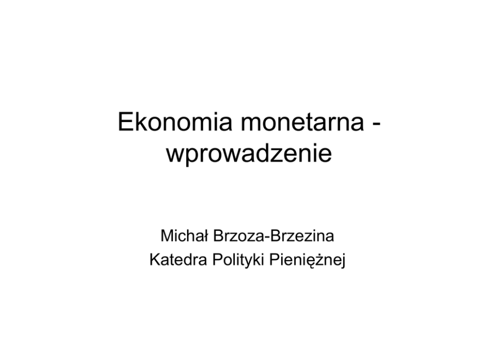 Ekonomia monetarna wprowadzenie Michał Brzoza-Brzezina Katedra Polityki Pieniężnej Spis treści 1. Co to jest ekonomia monetarna? 2. Krótkie wprowadzenie do polityki pieniężnej 3. Stopy procentowe, produkcja i inflacja w ujęciu empirycznym 4. Modele makroekonomiczne oparte na mikropodstawach 5. Syllabus M.Brzoza-Brzezina: Ekonomia monetarna - wprowadzenie 2 1. Co to jest ekonomia monetarna? • Ekonomia monetarna zajmuje się związkami pomiędzy zmiennymi realnymi (zatrudnienie, produkcja, realna stopa procentowa) i nominalnymi (ceny, płace, podaż pieniądza, kurs walutowy) • W szczególności ekonomia monetarna analizuje politykę pieniężną pod kątem jej efektów (wpływu na zmienne nominalne i realne), optymalności i przebiegu transmisji monetarnej. • Ekonomia monetarna w znacznym stopniu pokrywa się z makroekonomią (w szczególności z literaturą dotyczącą cyklu koniunkturalnego) M.Brzoza-Brzezina: Ekonomia monetarna - wprowadzenie 3 Modele w ekonomii • Ekonomiści nie mogą eksperymentować na żywych organizmach gospodarczych • Dlatego budują modele • Modele powinny być proste lecz podobne do rzeczywistości • W przypadku ekonomii monetarnej oznacza to realistyczny opis polityki pieniężnej, jej wpływu na gospodarkę i interakcji podstawowych zmiennych w modelu (PKB, inflacja, stopy procentowe) • Ten wykład poświęcony jest budowie takiego modelu M.Brzoza-Brzezina: Ekonomia monetarna - wprowadzenie 4 M.Brzoza-Brzezina: Ekonomia monetarna - wprowadzenie 5 2. Polityka pieniężna M.Brzoza-Brzezina: Ekonomia monetarna - wprowadzenie 6 Cel polityki pieniężnej • Celem większości banków centralnych jest zapewnienie stabilności cen • Przykład: cel NBP • USTAWA z dnia 29 sierpnia 1997 r. o Narodowym Banku Polskim: Art. 3.1. Podstawowym celem działalności NBP jest utrzymanie stabilnego poziomu cen, przy jednoczesnym wspieraniu polityki gospodarczej Rządu, o ile nie ogranicza to podstawowego celu NBP. M.Brzoza-Brzezina: Ekonomia monetarna - wprowadzenie 7 Strategie polityki pieniężnej • Banki centralne wykorzystują różne strategie by osiągnąć stabilne ceny • Najpopularniejsze strategie: - strategia monetarna – popularna w przeszłości - strategia bezpośredniego celu inflacyjnego (BCI) – popularna obecnie (np. NBP) - strategia kursowa – popularna w małych gospodarkach • Omówimy strategię bezpośredniego celu inflacyjnego M.Brzoza-Brzezina: Ekonomia monetarna - wprowadzenie 8 Strategia BCI (wersja skrócona) • • Bank centralny wyznacza cel inflacyjny NBP: 2.5% Bank Anglii: 2% Bank centralny kontroluje stopy procentowe za pomocą operacji otwartego rynku • Stopy procentowe wpływają na konsumpcję i inwestycje (czyli popyt) • Popyt wpływa na produkcję i inflację M.Brzoza-Brzezina: Ekonomia monetarna - wprowadzenie 9 Operacje otwartego rynku • Banki komercyjne pożyczają bazę monetarną od BC • BC jako monopolistyczny dostawca bazy monetarnej ustala jej cenę (czyli stopę procentową) • BC pożycza BK bazę monetarną na krótki termin (np. 1 tydzień) M.Brzoza-Brzezina: Ekonomia monetarna - wprowadzenie 10 Transmisja stóp procentowych (1) • Operacje otwartego rynku wpływają na krótkoterminowe stopy rynku pieniężnego ... Source: NBP M.Brzoza-Brzezina: Ekonomia monetarna - wprowadzenie 11 Transmisja stóp procentowych (2) • ... a te na oprocentowanie kredytów i depozytów M.Brzoza-Brzezina: Ekonomia monetarna - wprowadzenie 12 Stopy procentowe a popyt • Stopy procentowe wpływają na konsumpcję i inwestycje • Wyższe stopy ograniczają popyt • Niższe stopy zwiększają popyt • Popyt wpływa na produkcję i inflację M.Brzoza-Brzezina: Ekonomia monetarna - wprowadzenie 13 Polityka pieniężna w modelach teorii pieniądza • W starszych modelach bank centralny jest przedstawiany jako instytucja sterująca podażą pieniądza (strategia monetarna) • We współczesnych modelach bank centralny steruje stopą procentową (strategia BCI) M.Brzoza-Brzezina: Ekonomia monetarna - wprowadzenie 14 3. Stopy procentowe, produkcja i inflacja w ujęciu empirycznym M.Brzoza-Brzezina: Ekonomia monetarna - wprowadzenie 15 Teoria i empiria • Dobra teoria powinna odpowiadać faktom empirycznym • Najpopularniejsze sposoby empirycznej weryfikacji teorii: - Analiza momentów - Analiza funkcji reakcji • Próbujemy budować modele będące w zgodzie z badaniami empirycznymi M.Brzoza-Brzezina: Ekonomia monetarna - wprowadzenie 16 Badania empiryczne • Najczęściej wykorzystywane: analiza momentów i funkcje reakcji • Modele ekonomii monetarnej tłumaczą zjawiska średniookresowe (cykl koniunkturalny) • Nie interesuje nas wzrost • Dlatego analizowane są dane po usunięciu długookresowych trendów M.Brzoza-Brzezina: Ekonomia monetarna - wprowadzenie 17 Przykład: usuwanie trendu z PKB Hodrick-Prescott Filter (lambda=1600) 180000 170000 160000 6000 150000 4000 140000 2000 130000 0 120000 -2000 -4000 -6000 95 96 97 98 99 GDPFIXED_SA 00 01 02 Trend M.Brzoza-Brzezina: Ekonomia monetarna - wprowadzenie 03 04 Cycle 18 Fakty empiryczne oparte na modelach VAR • VAR – wektorowa autoregresja • Każda zmienna jest modelowana na podstawie przeszłych wartości swoich i wszystkich pozostałych zmiennych M.Brzoza-Brzezina: Ekonomia monetarna - wprowadzenie 19 Funkcje reakcji na podstawie modeli VAR • Do takiego układu można wprowadzić zaburzenia i obserwować reakcję poszczególnych zmiennych • Przykłady zaburzeń - Wstrząs polityki pieniężnej - Wstrząs produktywności - Wstrząs popytowy - Wstrząs kursowy M.Brzoza-Brzezina: Ekonomia monetarna - wprowadzenie 20 Przykładowe funkcje reakcji • Reakcja PKB na wstrząs polityki pieniężnej M.Brzoza-Brzezina: Ekonomia Źródło: Angeloni et al. (2002) monetarna - wprowadzenie 21 Przykładowe funkcje reakcji • Reakcja inflacji na wstrząs polityki pieniężnej M.Brzoza-Brzezina: Ekonomia Źródło: Angeloni et al. (2002) monetarna