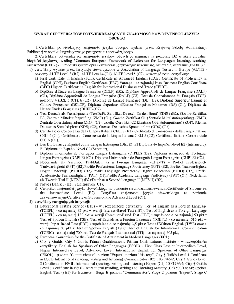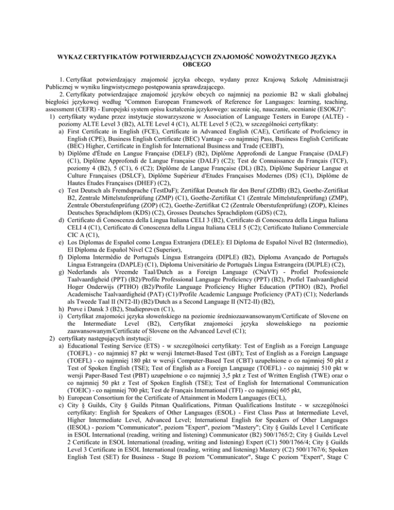 WYKAZ CERTYFIKATÓW POTWIERDZAJĄCYCH ZNAJOMOŚĆ NOWOŻYTNEGO JĘZYKA OBCEGO 1. Certyfikat potwierdzający znajomość języka obcego, wydany przez Krajową Szkołę Administracji Publicznej w wyniku lingwistycznego postępowania sprawdzającego. 2. Certyfikaty potwierdzające znajomość języków obcych co najmniej na poziomie B2 w skali globalnej biegłości językowej według "Common European Framework of Reference for Languages: learning, teaching, assessment (CEFR) - Europejski system opisu kształcenia językowego: uczenie się, nauczanie, ocenianie (ESOKJ)": 1) certyfikaty wydane przez instytucje stowarzyszone w Association of Language Testers in Europe (ALTE) poziomy ALTE Level 3 (B2), ALTE Level 4 (C1), ALTE Level 5 (C2), w szczególności certyfikaty: a) First Certificate in English (FCE), Certificate in Advanced English (CAE), Certificate of Proficiency in English (CPE), Business English Certificate (BEC) Vantage - co najmniej Pass, Business English Certificate (BEC) Higher, Certificate in English for International Business and Trade (CEIBT), b) Diplôme d'Étude en Langue Française (DELF) (B2), Diplôme Approfondi de Langue Française (DALF) (C1), Diplôme Approfondi de Langue Française (DALF) (C2); Test de Connaissance du Français (TCF), poziomy 4 (B2), 5 (C1), 6 (C2); Diplôme de Langue Française (DL) (B2), Diplôme Supérieur Langue et Culture Françaises (DSLCF), Diplôme Supérieur d'Etudes Françaises Modernes (DS) (C1), Diplôme de Hautes Études Françaises (DHEF) (C2), c) Test Deutsch als Fremdsprache (TestDaF); Zertifikat Deutsch für den Beruf (ZDfB) (B2), Goethe-Zertifikat B2, Zentrale Mittelstufenprüfung (ZMP) (C1), Goethe-Zertifikat C1 (Zentrale Mittelstufenprüfung) (ZMP), Zentrale Oberstufenprüfung (ZOP) (C2), Goethe-Zertifikat C2 (Zentrale Oberstufenprüfung) (ZOP), Kleines Deutsches Sprachdiplom (KDS) (C2), Grosses Deutsches Sprachdiplom (GDS) (C2), d) Certificato di Conoscenza della Lingua Italiana CELI 3 (B2), Certificato di Conoscenza della Lingua Italiana CELI 4 (C1), Certificato di Conoscenza della Lingua Italiana CELI 5 (C2); Certificato Italiano Commerciale CIC A (C1), e) Los Diplomas de Español como Lengua Extranjera (DELE): El Diploma de Español Nivel B2 (Intermedio), El Diploma de Español Nivel C2 (Superior), f) Diploma Intermédio de Português Língua Estrangeira (DIPLE) (B2), Diploma Avançado de Português Língua Estrangeira (DAPLE) (C1), Diploma Universitário de Português Língua Estrangeira (DUPLE) (C2), g) Nederlands als Vreemde Taal/Dutch as a Foreign Language (CNaVT) - Profiel Professionele Taalvaardigheid (PPT) (B2)/Profile Professional Language Proficiency (PPT) (B2), Profiel Taalvaardigheid Hoger Onderwijs (PTHO) (B2)/Profile Language Proficiency Higher Education (PTHO) (B2), Profiel Academische Taalvaardigheid (PAT) (C1)/Profile Academic Language Proficiency (PAT) (C1); Nederlands als Tweede Taal II (NT2-II) (B2)/Dutch as a Second Language II (NT2-II) (B2), h) Prøve i Dansk 3 (B2), Studieprøven (C1), i) Certyfikat znajomości języka słoweńskiego na poziomie średniozaawansowanym/Certificate of Slovene on the Intermediate Level (B2), Certyfikat znajomości języka słoweńskiego na poziomie zaawansowanym/Certificate of Slovene on the Advanced Level (C1); 2) certyfikaty następujących instytucji: a) Educational Testing Service (ETS) - w szczególności certyfikaty: Test of English as a Foreign Language (TOEFL) - co najmniej 87 pkt w wersji Internet-Based Test (iBT); Test of English as a Foreign Language (TOEFL) - co najmniej 180 pkt w wersji Computer-Based Test (CBT) uzupełnione o co najmniej 50 pkt z Test of Spoken English (TSE); Test of English as a Foreign Language (TOEFL) - co najmniej 510 pkt w wersji Paper-Based Test (PBT) uzupełnione o co najmniej 3,5 pkt z Test of Written English (TWE) oraz o co najmniej 50 pkt z Test of Spoken English (TSE); Test of English for International Communication (TOEIC) - co najmniej 700 pkt; Test de Français International (TFI) - co najmniej 605 pkt, b) European Consortium for the Certificate of Attainment in Modern Languages (ECL), c) City § Guilds, City § Guilds Pitman Qualifications, Pitman Qualifications Institute - w szczególności certyfikaty: English for Speakers of Other Languages (ESOL) - First Class Pass at Intermediate Level, Higher Intermediate Level, Advanced Level; International English for Speakers of Other Languages (IESOL) - poziom "Communicator", poziom "Expert", poziom "Mastery"; City § Guilds Level 1 Certificate in ESOL International (reading, writing and listening) Communicator (B2) 500/1765/2; City § Guilds Level 2 Certificate in ESOL International (reading, writing and listening) Expert (C1) 500/1766/4; City § Guilds Level 3 Certificate in ESOL International (reading, writing and listening) Mastery (C2) 500/1767/6; Spoken English Test (SET) for Business - Stage B poziom "Communicator", Stage C poziom "Expert", Stage C poziom "Mastery"; English for Business Communications (EBC) - Level 2, Level 3; English for Office Skills (EOS) - Level 2, d) Edexcel, Pearson Language Tests, Pearson Language Assessments - w szczególności certyfikaty: London Tests of English, Level 3 (Edexcel Level 1 Certificate in ESOL International); London Tests of English, Level 4 (Edexcel Level 2 Certificate in ESOL International); London Tests of English, Level 5 (Edexcel Level 3 Certificate in ESOL International), e) Education Development International (EDI), London Chamber of Commerce and Industry Examinations Board - w szczególności certyfikaty: London Chamber of Commerce and Industry Examinations (LCCI) English for Business Level 2, English for Business Level 3, English for Business Level 4; London Chamber of Commerce and Industry Examinations (LCCI) - Foundation Certificate for Teachers of Business English (FTBE); London Chamber of Commerce and Industry Examinations (LCCI) - English for Tourism Level 2 poziom "Pass with Credit", poziom "Pass with Distinction", f) Univers