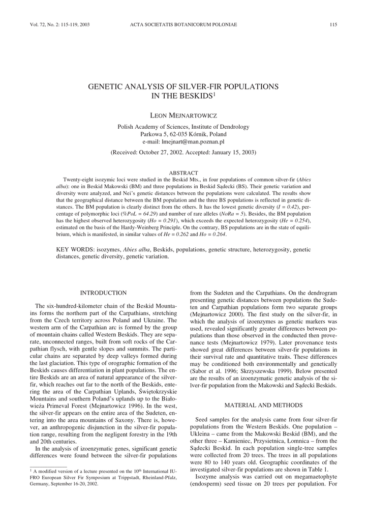 Vol. 72, No. 2: 115-119, 2003 ACTA SOCIETATIS BOTANICORUM POLONIAE 115 GENETIC ANALYSIS OF SILVER-FIR POPULATIONS IN THE BESKIDS1 LEON MEJNARTOWICZ Polish Academy of Sciences, Institute of Dendrology Parkowa 5, 62-035 Kórnik, Poland e-mail: [email protected] (Received: October 27, 2002. Accepted: January 15, 2003) ABSTRACT Twenty-eight isozymic loci were studied in the Beskid Mts., in four populations of common silver-fir (Abies alba): one in Beskid Makowski (BM) and three populations in Beskid S¹decki (BS). Their genetic variation and diversity were analyzed, and Neis genetic distances between the populations were calculated. The results show that the geographical distance between the BM population and the three BS populations is reflected in genetic distances. The BM population is clearly distinct from the others. It has the lowest genetic diversity (I = 0.42), percentage of polymorphic loci (%PoL = 64.29) and number of rare alleles (NoRa = 5). Besides, the BM population has the highest observed heterozygosity (Ho = 0.291), which exceeds the expected heterozygosity (He = 0.254), estimated on the basis of the Hardy-Weinberg Principle. On the contrary, BS populations are in the state of equilibrium, which is manifested, in similar values of He = 0.262 and Ho = 0.264. KEY WORDS: isozymes, Abies alba, Beskids, populations, genetic structure, heterozygosity, genetic distances, genetic diversity, genetic variation. INTRODUCTION The six-hundred-kilometer chain of the Beskid Mountains forms the northern part of the Carpathians, stretching from the Czech territory across Poland and Ukraine. The western arm of the Carpathian arc is formed by the group of mountain chains called Western Beskids. They are separate, unconnected ranges, built from soft rocks of the Carpathian flysch, with gentle slopes and summits. The particular chains are separated by deep valleys formed during the last glaciation. This type of orographic formation of the Beskids causes differentiation in plant populations. The entire Beskids are an area of natural appearance of the silverfir, which reaches out far to the north of the Beskids, entering the area of the Carpathian Uplands, wiêtokrzyskie Mountains and southern Polands uplands up to the Bia³owie¿a Primeval Forest (Mejnartowicz 1996). In the west, the silver-fir appears on the entire area of the Sudeten, entering into the area mountains of Saxony. There is, however, an anthropogenic disjunction in the silver-fir population range, resulting from the negligent forestry in the 19th and 20th centuries. In the analysis of izoenzymatic genes, significant genetic differences were found between the silver-fir populations _______________ 1 A modified version of a lecture presented on the 10th International IUFRO European Silver Fir Symposium at Trippstadt, Rheinland-Pfalz, Germany, September 16-20, 2002. from the Sudeten and the Carpathians. On the dendrogram presenting genetic distances between populations the Sudeten and Carpathian populations form two separate groups (Mejnartowicz 2000). The first study on the silver-fir, in which the analysis of izoenzymes as genetic markers was used, revealed significantly greater differences between populations than those observed in the conducted then provenance tests (Mejnartowicz 1979). Later provenance tests showed great differences between silver-fir populations in their survival rate and quantitative traits. These differences may be conditioned both environmentally and genetically (Sabor et al. 1996; Skrzyszewska 1999). Below presented are the results of an izoenzymatic genetic analysis of the silver-fir population from the Makowski and S¹decki Beskids. MATERIAL AND METHODS Seed samples for the analysis came from four silver-fir populations from the Western Beskids. One population Ukleina came from the Makowski Beskid (BM), and the other three Kamieniec, Przysietnica, £omnica from the S¹decki Beskid. In each population single-tree samples were collected from 20 trees. The trees in all populations were 80 to 140 years old. Geographic coordinates of the investigated silver-fir populations are shown in Table 1. Isozyme analysis was carried out on megamaetophyte (endosperm) seed tissue on 20 trees per population. For 116 GENETIC ANALYSIS OF SILVER-FIR POPULATIONS TABLE 1. Geographic coordinates of the investigated silver-fir populations. Population name Geographic region Ukleina (1) Kamieniec (2) Przysietnica (3) £omnica (4) Beskid Makowski Beskid S¹decki Beskid S¹decki Beskid S¹decki Latitude Long. Altitude [m] Tree age 49° 49 49° 34 49° 30 49° 27 19° 58 20° 36 20° 36 20° 47 260-540 400-440 540-660 50-730 120 80 140 140 each tree isozyme analysis was carried out on 7-megagametophyte. Enzyme was separated by starch gel (11.5%) electrophoresis in a discontinuous buffer system of Poulik (1957) and Siciliano and Shaw (1976). Isozyme analysis was performed following procedures of Bergmann and al. (1990), Konnert (1992), Mejnartowicz (1979), Mejnartowicz and Bergmann (1985), Pitel and Cheliak (1984) and Schröder (1989). Visualization of isozymes was mostly realized after Wendel and Weeden (1989). Enzyme systems, presented in Table 2, were the same as in the studies of silver-fir populations from the Eastern Be- Mejnartowicz L. skids and the Sudeten (Mejnartowicz 2000), but allele numbering is different it corresponds to enzyme Rf and not to the enzyme order of appearance in the analysis (Mejnartowicz 2000): the fastest migrating allele is no.1, the slower one no. 2, etc. The statistical analysis was performed with the Yeh and Yang (1999) Popgene program. RESULTS AND DISCUSSION Beskid Makowski Population: Ukleina (1) In 28 investigated izoenzymatic loci of 4 silver-fir populations from the Western Beskids, 4 loci were monomorphic: MEN-A, MEN-B, PGI-A, and SOD-A. These loci had two or more alleles in the Eastern Beskids silver-fir populations (Mejnartowicz 2000). The smallest percentage of polymorphic loci (64.29%) and the 