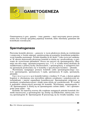 GAMETOGENEZA Gametogenezą (z grec. gamete – żona; gametes – mąż) nazywamy proces powstawania oraz rozwoju specjalnej populacji komórek, które określamy gametami lub komórkami rozrodczymi. Spermatogeneza Pierwotne komórki płciowe – gonocyty w życiu płodowym dzielą się wielokrotnie i ostatecznie w formie uśpionej, umiejscawiają się pomiędzy komórkami podpórkowymi kanalika nasiennego. Światło kanalika aż do około 7 roku życia jest zamknięte. W okresie dojrzewania płciowego komórki te dzielą się i przekształcają, co prowadzi do wytworzenia plemników. Proces ten nazywa się spermatogenezą. Obejmuje ona dwa etapy: spermatocytogenezę (ryc. 3-1), w wyniku której dochodzi do zredukowania o połowę liczby chromosomów, i spermiogenezę, w następstwie której spermatyda przekształca się w komórkę o specyficznym kształcie – plemnik. Wyróżniamy następujące postacie komórek cyklu spermatogenicznego (ryc. 2-2): spermatogonie, spermatocyty I rzędu, spermatocyty II rzędu, spermatydy, plemniki. S p e r m a t o g o n i e są to komórki kuliste o średnicy 9–15 µm, z dużym jądrem bogatym w chromatynę oraz niewielkim rąbkiem cytoplazmy z pojedynczymi mitochondriami i innymi organellami komórkowymi. Spermatogonie połączone są mostkami cytoplazmatycznymi i dzięki temu dzielą się synchronicznie. W wyniku 6 podziałów mitotycznych powstają 64 komórki. Wyróżniamy spermatogonie A i B. Spermatogonie A dzielą się na spermatogonie ciemne (dark) – Ad i spermatogonie jasne (pale) – Ap. Komórki Ad stanowią rezerwę dla rozplemu następnych pokoleń komórek (komórki macierzyste), a spermatogonie Ap, dzieląc się kilkakrotnie, mitotycznie, tworzą spermatogonie B. Spermatogonie B przesuwają się ku światłu kanalika, wzra- Ryc. 3-1. Schemat spermatogenezy. 41 42 Ryc. 3-2. Przekształcanie się spermatydy w plemnik (spermiogeneza). 43 stają i przekształcają się w ten sposób w spermatocyt I rzędu. Są to komórki duże, o średnicy 25 µm, z owalnym jądrem i bogate w organelle komórkowe. S p e r m a t o c y t y I r z ę d u przystępują do podziału mejotycznego. Mejoza składa się z dwóch kolejnych podziałów, które prowadzą do redukcji liczby chromosomów do połowy. Po pierwszym podziale redukcyjnym powstają dwa s p e r m a t o c y t y I I r z ę d u. Są to małe komórki z haploidalną liczbą chromosomów. Komórki te bardzo szybko przystępują do drugiego podziału mejozy (podział wyrównawczy, ekwacyjny) i ostatecznie powstają 4 s p e r m a t y d y monowalentne (1 n). W procesie spermiogenezy (ryc. 3-2) spermatyda przekształca się w p l e m n i k. Zmianom podlega zarówno jądro komórkowe, jak i cytoplazma. Proces spermiogenezy można podzielić na 4 okresy (stadia): 1) 2) 3) 4) stadium Golgiego, stadium czapeczki, stadium akrosomalne, stadium dojrzewania. Jądro przesuwa się do bieguna komórki, spłaszcza się i wydłuża oraz zmniejsza swą objętość. Chromosomy ulegają kondensacji, chromatyna tworzy zbite, równolegle ułożone blaszki. Zanikają pory jądrowe. Nadmiar otoczki jądrowej zwija się w fałd. Aparat Golgiego przesuwa się na zewnątrz bieguna jądra. W pęcherzykach diktiosomów pojawiają się początkowo pojedyncze ziarenka, które stopniowo zlewają się w ziarno akrosomalne. Ziarno przekształca się w pęcherzyk akrosomalny, który w formie czapeczki akrosomalnej nasadzony jest na jądro. Centriola dzieli się. Centriola bliższa pozostaje przy jądrze, a druga centriola, dalsza, odsuwa się i przekształca we włókno osiowe witki i na końcu wstawki tworzy pierścień dalszy. Mitochondria wydłużają się i w obrębie wstawki wytwarzają osłonkę mitochondrialną. Plemnik ma niewiele cytoplazmy. Jej nadmiar zostaje usunięty w formie ciałek resztkowych w procesie, który nazywa się spermiacją. Cykl spermatogenetyczny u człowieka trwa 74 dni. Dla poszczególnych komórek wynosi: – – – – – spermatogonie Ap spermatogonie B spermatocyty I rzędu spermatocyty II rzędu spermatydy – – – – – 18 dni 9 dni 23 dni l dzień 23 dni Przeciętny czas, jaki potrzebny jest plemnikowi na przebycie drogi od światła kanalika nasiennego, przez system przewodów wyprowadzających, do ejakulacji wynosi średnio 12 dni (najkrócej l doba, najdłużej 21 dni). Według Brinstera teoretycznie, u szczura, z jednej komórki macierzystej linii spermatogenetycznej może powstać 4096 plemników. Ostateczna liczba jest jednak mniejsza, gdyż wskutek apoptozy ginie 25–50% komórek. 44 Budowa plemnika Plemnik (spermatozoa, spermia) jest specyficzną pod względem kształtu i budowy komórką (ryc. 3-3). Ma około 60 µm długości i składa się z dwóch zasadniczych części: główki i ogona (witki). Główka plemnika ma kształt spłaszczonej gruszki o wymiarach: 4,5 µm długości i 2,5–3,5 µm szerokości. Zawiera skondensowane jądro w formie chromatyny jądrowej o jednorodnej gęstości elektronowej. Drugim składnikiem główki jest akrosom. Pokrywa on 2/3 przedniej powierzchni jądra i występuje w formie spłaszczonej Ryc. 3-3. Schemat plemnika uwzględniający jego budowę submikroskopową. 45 czapeczki akrosomalnej. Czapeczka akrosomalna składa się z dwóch błon akrosomalnych – zewnętrznej, leżącej blisko błony komórkowej, i wewnętrznej. W zewnętrznej błonie akrosomu znajduje się galaktozylotransferaza, a w błonie wewnętrznej – akrozyna, fosfataza kwaśna, hialuronidaza oraz neuraminidaza. Otoczka jądrowa jest ciągła w górnej części główki i ściśle przylega do skondensowanej chromatyny jądrowej. W dolnej części główki otoczka jądrowa jest porowata i pokrywa płytki dołek implantacyjny, tj. miejsce, w którym główka łączy się z ogonem plemnika. Ogon (witka) składa się z czterech części: szyjki, wstawki, odcinka głównego witki i odcinka końcowego witki. Szyjka zbudowana jest z dwóch centrioli oraz 9 segmentowych kolumn pr