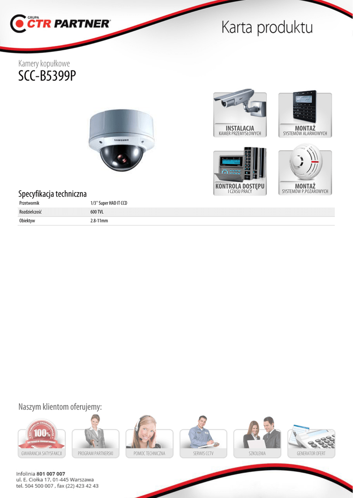 Kamery kopułkowe SCC-B5399P INSTALACJA KAMER PRZEMYSŁOWYCH KONTROLA DOSTĘPU I CZASU PRACY Specyfikacja techniczna Przetwornik 1/3'' Super HAD IT CCD Rozdzielczość 600 TVL Obiektyw 2.8-11mm MONTAŻ SYSTEMÓW ALARMOWYCH MONTAŻ SYSTEMÓW P.POŻAROWYCH Naszym klientom oferujemy: GWARANCJA SATYSFAKCJI PROGRAM PARTNERSKI POMOC TECHNICZNA SERWIS CCTV SZKOLENIA GENERATOR OFERT