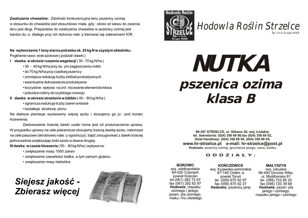Zwalczanie chwastów: Zdolność konkurencyjna łanu pszenicy ozimej w stosunku do chwastów jest stosunkowo mała, gdyż okres od siewu do zwarcia łanu jest długi. Preparatów do zwalczania chwastów w pszenicy ozimej jest bardzo dużo, dlatego przy ich doborze należy kierować się zaleceniami IOR. Na wytworzenie 1 tony ziarna potrzeba ok. 25 kg N w czystym składniku. Pogłówne nawożenie azotowe ( podział i dawki ) I dawka w okresie ruszenia wegetacji ( 30 - 70 kg N/ha ) • 30 - 40 kg N/ha przy dużym zagęszczeniu roślin • do 70 kg N/ha przy rzadkiej pszenicy • zmniejsza redukcję liczby źdźbeł produktywnych • ewentualne dokrzewienie produktywne • korzystnie wpływa na zróżnicowanie elementów kłosa • pobudza rośliny do szybkiego rozwoju II dawka w okresie strzelania w źdźbło ( 40 - 60 kg N/ha ) • ogranicza redukcję liczby ziaren w kłosie • kształtuje strukturę plonu Na słabsze plantacje wysiewamy więcej azotu i stosujemy go już pod koniec krzewienia. Zastosowanie trzeciej dawki uzależnione jest od przeznaczenia uprawy. W przypadku uprawy na cele piekarnicze stosujemy trzecią dawkę azotu, natomiast na cele paszowe (skrobiowe) należy ograniczyć, bądź zrezygnować z dawki trzeciej jednocześnie zwiększając ilość azotu w dawce drugiej. III dawka w czasie kłoszenia ( 50 - 80 kg N/ha ) wpływa na: • zwiększenie masy 1000 ziaren • zwiększenie zawartości białka, a tym samym glutenu • zwiększenie masy hektolitra Siejesz jakość Zbierasz więcej Hodowla Roślin Strzelce Sp. z o.o. Grupa IHAR NUTKA pszenica ozima klasa B 99-307 STRZELCE, ul. Główna 20, woj. Łódzkie, tel. Sekretariat: (024) 356 69 00;fax (024) 356 69 02, Dział Handlowy: (024) 356 69 04, (024) 356 69 05; www.hr-strzelce.pl e-mail: [email protected] Hodowla: pszenicy ozimej, jęczmienia jarego, owsa, bobiku O D D Z I A Ł Y : BOROWO woj. wielkopolskie 64-020 Czempiń powiat Kościan tel.(061) 282 72 67 fax (061) 282 62 97 Hodowla: rzepaku ozimego i jarego, pszenżyta ozimego, maku i lnu oleistego KOŃCZEWICE woj. Kujawsko-pomorskie 87-140 Chełmża powiat Toruń tel. (056) 675 92 97 fax (056) 675 92 27 Hodowla: pszenicy jarej MAŁYSZYN woj. lubuskie 66-400 Gorzów Wlkp. ul. Myśliborska 81 tel. (095) 722 85 20 fax (095) 720 39 68 Hodowla: pszenżyta jarego i ozimego, rzepaku jarego i ozimego Na plantacjach intensywnych sianych w terminach wcześniejszych od zalecanych oraz na stanowiskach bogatych w azot w przypadku gdy już w okresie jesiennym pojawią się oznaki występowania mączniaka prawdziwego lub rdzy brunatnej zalecane jest wykonanie jesienią w fazie krzewienia zabiegu preparatami zwalczającymi te choroby . Pszenica ozima NUTKA Wpisana do Rejestru Odmian w 2001 r. Charakterystyka odmiany 1. Odmiana typu chlebowego-klasa B, bardzo plenna Charakteryzuje się stabilnym w latach i różnorodnych warunkach siedliska potencjałem plonowania 2. Kłos cylindryczny, średnio zbity 3. Ziarno czerwone o masie 1000 ziaren ok. 48-53 g i dobrym wyrównaniu 4. Źdźbło o długości ok. 95 cm, odporne na wyleganie 5. Odporna na porażenie przez: rdzę źdźbłową, septoriozę liści i kłosa, choroby podstawy źdźbła 6. Mrozoodporność dobra 7. Termin kłoszenia i dojrzewania średnio późny 8. Odporna na zakwaszenie gleby Odporność na wyleganie w stosunku do wzorca Plonowanie w stosunku do wzorca 105 %105 % *Wszystkie odmiany zarejestrowane w 2004 roku NUTKA 100 % 111 % * Wzorzec 106106 % % (źródło: COBORU) (źródło: COBORU) 100 % Wiosną po ruszeniu wegetacji do końca fazy krzewienia na stanowiskach o wadliwym płodozmianie i w warunkach środowiskowych sprzyjających wystąpieniu chorób takich jak mączniak prawdziwy, brunatna plamistość liści (DTR), czy rdzy brunatnej zastosować ochronę chemiczną po pojawieniu się objawów chorobowych w nasileniu mogącym ograniczyć rozwój rośliny. 2004 2005 Nawożenie Pszenica wymaga obojętnego odczynu gleby. Nawożenie mineralne uzależnione jest od zasobności gleby w składniki mineralne oraz spodziewanego plonu. Nawożenie fosforowo-potasowe kształtuje się w przedziale 40-100 kg/ha P2O5 i 40-120 kg/ha K2O. Pomimo, że NUTKA charakteryzuje się sztywnym źdźbłem i posiada zwiększona odporność na wyleganie, w warunkach intensywnej uprawy na żyznych glebach oraz dużego nawożenia azotowego zaleca się stosowanie retandantów wzrostu zapobiegających wyleganiu roślin. W fazach od pełni krzewienia do fazy drugiego kolanka można stosować środek zawierający trineksapak etylowy w jednej dawce lub w dawkach dzielonych. I zabieg w fazie końca krzewienia, II do momentu pojawienia się liścia flagowego, można także go stosować w mieszaninie z środkiem chemicznym zawierającym (CCC) chlorek chloromekwatu w fazie drugiego kolanka. Innym sposobem zapobiegania wyleganiu roślin na plantacji jest zastosowanie antywylegaczy zawierających jedną substancję czynną, CCC. Na początku strzelania w źdźbło gdy wyczuwalne jest pierwsze kolanko (w praktyce pszenica ma około 15-20 cm wysokości), należy wykonywać oprysk, temperatura powietrza powinna wynosić powyżej 10oC, średnia dawka na ha zależy od zawartości substancji czynnej CCC w danym środku handlowym . W przypadku NUTKI można zastosować niższe z zalecanych przez producenta dawek antywylegacza. Retandanty wzrostu zawierające jako substancję czynną etefon można stosować od fazy pierwszego kolanka do fazy pojawienia się liścia flagowego, ich reżim stosowania jest podobny do substancji zawierających CCC. NUTKA charakteryzuje się zwiększoną odpornością na kompleks chorób podstawy źdźbła, pomimo tego w systemie uprawy uproszczonej (bezorkowej) lub pszenicy uprawianej w monokulturze należy zwrócić uwagę na zagrożenie łamliwością podstawy źdźbła. W takich przypadkach należy zastosować oprysk zalecanymi środkami chemicznymi. Zabieg można przeprowadzić od początku strzelania w źdźbło do fazy drugiego 