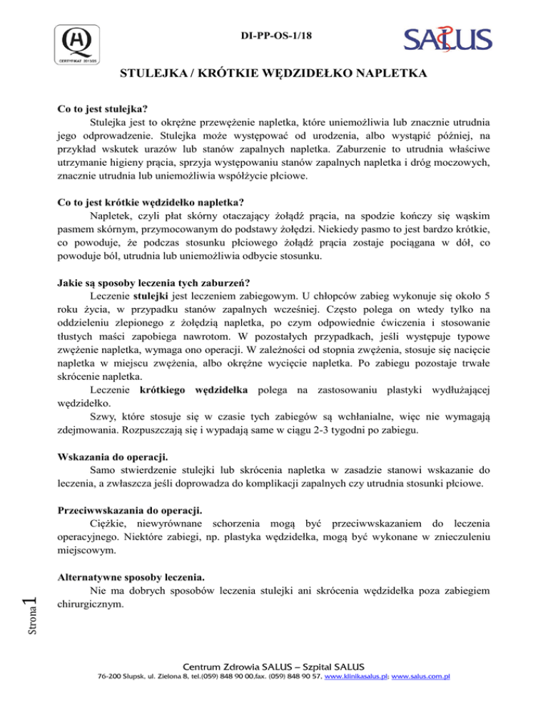 DI-PP-OS-1/18 STULEJKA / KRÓTKIE WĘDZIDEŁKO NAPLETKA Co to jest stulejka? Stulejka jest to okrężne przewężenie napletka, które uniemożliwia lub znacznie utrudnia jego odprowadzenie. Stulejka może występować od urodzenia, albo wystąpić później, na przykład wskutek urazów lub stanów zapalnych napletka. Zaburzenie to utrudnia właściwe utrzymanie higieny prącia, sprzyja występowaniu stanów zapalnych napletka i dróg moczowych, znacznie utrudnia lub uniemożliwia współżycie płciowe. Co to jest krótkie wędzidełko napletka? Napletek, czyli płat skórny otaczający żołądź prącia, na spodzie kończy się wąskim pasmem skórnym, przymocowanym do podstawy żołędzi. Niekiedy pasmo to jest bardzo krótkie, co powoduje, że podczas stosunku płciowego żołądź prącia zostaje pociągana w dół, co powoduje ból, utrudnia lub uniemożliwia odbycie stosunku. Jakie są sposoby leczenia tych zaburzeń? Leczenie stulejki jest leczeniem zabiegowym. U chłopców zabieg wykonuje się około 5 roku życia, w przypadku stanów zapalnych wcześniej. Często polega on wtedy tylko na oddzieleniu zlepionego z żołędzią napletka, po czym odpowiednie ćwiczenia i stosowanie tłustych maści zapobiega nawrotom. W pozostałych przypadkach, jeśli występuje typowe zwężenie napletka, wymaga ono operacji. W zależności od stopnia zwężenia, stosuje się nacięcie napletka w miejscu zwężenia, albo okrężne wycięcie napletka. Po zabiegu pozostaje trwałe skrócenie napletka. Leczenie krótkiego wędzidełka polega na zastosowaniu plastyki wydłużającej wędzidełko. Szwy, które stosuje się w czasie tych zabiegów są wchłanialne, więc nie wymagają zdejmowania. Rozpuszczają się i wypadają same w ciągu 2-3 tygodni po zabiegu. Wskazania do operacji. Samo stwierdzenie stulejki lub skrócenia napletka w zasadzie stanowi wskazanie do leczenia, a zwłaszcza jeśli doprowadza do komplikacji zapalnych czy utrudnia stosunki płciowe. Strona 1 Przeciwwskazania do operacji. Ciężkie, niewyrównane schorzenia mogą być przeciwwskazaniem do leczenia operacyjnego. Niektóre zabiegi, np. plastyka wędzidełka, mogą być wykonane w znieczuleniu miejscowym. Alternatywne sposoby leczenia. Nie ma dobrych sposobów leczenia stulejki ani skrócenia wędzidełka poza zabiegiem chirurgicznym. Centrum Zdrowia SALUS – Szpital SALUS 76-200 Słupsk, ul. Zielona 8, tel.(059) 848 90 00,fax. (059) 848 90 57, www.klinikasalus.pl; www.salus.com.pl DI-PP-OS-1/18 Jakie są możliwe powikłania? Operacje omówione wyżej rzadko doprowadzają do komplikacji. Najczęściej spotykane, to: Krwawienie po operacji lub krwiak podskórny – występuje wcześnie po zabiegu, może wymagać reoperacji Zakażenie rany – wymaga stosowania antybiotyku oraz zdjęcia szwów i zmian opatrunków Wytworzenie blizny ponownie zwężającej napletek i wymagającej reoperacji Zakrzepica w żyłach głębokich kończyn dolnych i miednicy – może wystąpić pomimo profilaktyki przeciwzakrzepowej stosowanej rutynowo w każdej tego typu operacji. Zakrzepica żył głębokich wymaga leczenia, niesie ze sobą ryzyko zatorowości płucnej, ostrej lub przewlekłej niewydolności oddechowej i krążeniowej, a także nagłego zgonu. Inne, rzadko spotykane i niemożliwe do przewidzenia Strona 2 Jak przygotować się do operacji? Jeśli chorujesz na schorzenia takie, jak cukrzyca, nadciśnienie tętnicze, choroba wieńcowa, zaburzenia rytmu serca, alergie lub, jeśli przyjmujesz leki zmniejszające krzepliwość krwi (aspiryna, acard, polocard, acenokumarol, sintrom, warfin, ticlopidyna, klopidogrel), poinformuj o tym swojego chirurga i zgłoś się do swojego Lekarza Rodzinnego w celu odpowiedniego przygotowania do operacji. Jeśli cierpisz na próchnicę zębów – zgłoś się do dentysty i wylecz zęby odpowiednio wcześniej. W przypadku stosowania na stałe leków – zabierz je ze sobą do szpitala w oryginalnych opakowaniach. Ostatni posiłek powinien być zjedzony najdalej sześć godzin przed operacją. Do szpitala prosimy zabrać skierowanie na operację (nie obowiązuje w przypadku operacji opłacanych prywatnie). W dniu zabiegu pacjent powinien wykonać dokładną poranną toaletę (kąpiel lub prysznic) całego ciała, ze szczególnym uwzględnieniem okolicy operowanej. Prosimy o zabranie ze sobą piżamy, szlafroka i kapci (klapki pod prysznic), a także przyborów toaletowych. Prosimy NIE GOLIĆ okolic miejsca operowanego, uczyni to fachowy personel bezpośrednio przed operacją. Golenie w domu powoduje ryzyko zakażenia ran operacyjnych i może być przyczyną odmowy przyjęcia pacjenta do szpitala! Palacze tytoniu powinni zaprzestać palenia w okresie okołooperacyjnym. Palenie powoduje skurcz naczyń krwionośnych, co utrudnia gojenie rany oraz pogarsza wydolność oddechową, co powoduje wzrost częstości powikłań oddechowych po operacji. W wyznaczonym terminie, zazwyczaj kilka dni przed zabiegiem, odbędzie się rozmowa z anestezjologiem, podczas której zostanie ustalony sposób znieczulenia. Tego samego dnia pielęgniarka pobierze krew do badań niezbędnych do operacji. Gdzie zgłosić się w dniu operacji? W dniu operacji prosimy zgłosić się z niezbędnymi dokumentami (skierowanie na operację, podpisana zgoda na operację, dowód ubezpieczenia) do Izby Przyjęć. Po przyjęciu do szpitala jeszcze raz można będzie porozmawiać z chirurgiem – operatorem oraz z anestezjologiem i zadać im ewentualne pytania. Centrum Zdrowia SALUS – Szpital SALUS 76-200 Słupsk, ul. Zielona 8, tel.(059) 848 90 00,fax. (059) 848 90 57, www.klinikasalus.pl; www.salus.com.pl DI-PP-OS-1/18 Jak przebiega okres pooperacyjny? Zabieg wykonywany jest w znieczuleniu ogólnym albo rdzeniowym. Sposób znieczulenia ustalany jest podczas rozmowy z anestezjologiem przed zabiegiem. Jeśli zabieg wykonywany jest w znieczuleniu ogólnym, można opuścić szpital już po 2-3 godzinach po operacji. W przypadku znieczuleni