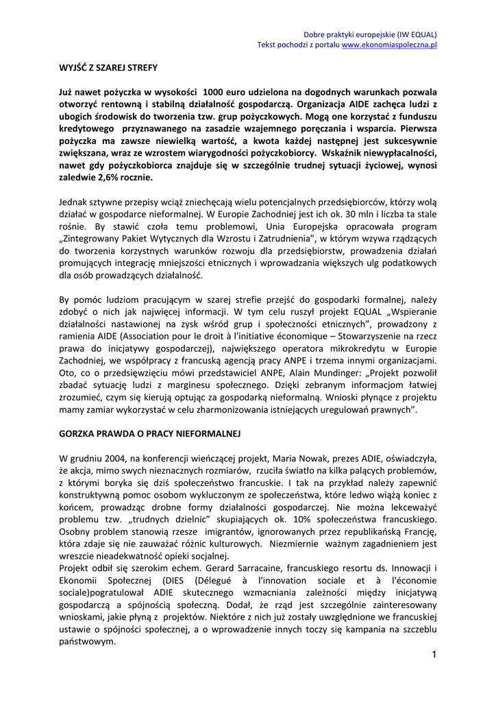 Dobre praktyki europejskie (IW EQUAL) Tekst pochodzi z portalu www.ekonomiaspoleczna.pl WYJŚĆ Z SZAREJ STREFY Już nawet pożyczka w wysokości 1000 euro udzielona na dogodnych warunkach pozwala otworzyć rentowną i stabilną działalność gospodarczą. Organizacja AIDE zachęca ludzi z ubogich środowisk do tworzenia tzw. grup pożyczkowych. Mogą one korzystać z funduszu kredytowego przyznawanego na zasadzie wzajemnego poręczania i wsparcia. Pierwsza pożyczka ma zawsze niewielką wartość, a kwota każdej następnej jest sukcesywnie zwiększana, wraz ze wzrostem wiarygodności pożyczkobiorcy. Wskaźnik niewypłacalności, nawet gdy pożyczkobiorca znajduje się w szczególnie trudnej sytuacji życiowej, wynosi zaledwie 2,6% rocznie. Jednak sztywne przepisy wciąż zniechęcają wielu potencjalnych przedsiębiorców, którzy wolą działać w gospodarce nieformalnej. W Europie Zachodniej jest ich ok. 30 mln i liczba ta stale rośnie. By stawić czoła temu problemowi, Unia Europejska opracowała program „Zintegrowany Pakiet Wytycznych dla Wzrostu i Zatrudnienia”, w którym wzywa rządzących do tworzenia korzystnych warunków rozwoju dla przedsiębiorstw, prowadzenia działań promujących integrację mniejszości etnicznych i wprowadzania większych ulg podatkowych dla osób prowadzących działalność. By pomóc ludziom pracującym w szarej strefie przejść do gospodarki formalnej, należy zdobyć o nich jak najwięcej informacji. W tym celu ruszył projekt EQUAL „Wspieranie działalności nastawionej na zysk wśród grup i społeczności etnicznych”, prowadzony z ramienia AIDE (Association pour le droit à l'initiative économique – Stowarzyszenie na rzecz prawa do inicjatywy gospodarczej), największego operatora mikrokredytu w Europie Zachodniej, we współpracy z francuską agencją pracy ANPE i trzema innymi organizacjami. Oto, co o przedsięwzięciu mówi przedstawiciel ANPE, Alain Mundinger: „Projekt pozwolił zbadać sytuację ludzi z marginesu społecznego. Dzięki zebranym informacjom łatwiej zrozumieć, czym się kierują optując za gospodarką nieformalną. Wnioski płynące z projektu mamy zamiar wykorzystać w celu zharmonizowania istniejących uregulowań prawnych”. GORZKA PRAWDA O PRACY NIEFORMALNEJ W grudniu 2004, na konferencji wieńczącej projekt, Maria Nowak, prezes ADIE, oświadczyła, że akcja, mimo swych nieznacznych rozmiarów, rzuciła światło na kilka palących problemów, z którymi boryka się dziś społeczeństwo francuskie. I tak na przykład należy zapewnić konstruktywną pomoc osobom wykluczonym ze społeczeństwa, które ledwo wiążą koniec z końcem, prowadząc drobne formy działalności gospodarczej. Nie można lekceważyć problemu tzw. „trudnych dzielnic” skupiających ok. 10% społeczeństwa francuskiego. Osobny problem stanowią rzesze imigrantów, ignorowanych przez republikańską Francję, która zdaje się nie zauważać różnic kulturowych. Niezmiernie ważnym zagadnieniem jest wreszcie nieadekwatność opieki socjalnej. Projekt odbił się szerokim echem. Gerard Sarracaine, francuskiego resortu ds. Innowacji i Ekonomii Społecznej (DIES (Délegué à l'innovation sociale et à l'économie sociale)pogratulował ADIE skutecznego wzmacniania zależności między inicjatywą gospodarczą a spójnością społeczną. Dodał, że rząd jest szczególnie zainteresowany wnioskami, jakie płyną z projektów. Niektóre z nich już zostały uwzględnione we francuskiej ustawie o spójności społecznej, a o wprowadzenie innych toczy się kampania na szczeblu państwowym. 1 Dobre praktyki europejskie (IW EQUAL) Tekst pochodzi z portalu www.ekonomiaspoleczna.pl PROJEKT PRZYSŁUŻYŁ SIĘ W TRZECH SPRAWACH Po pierwsze dostarczył informacji na temat grup społecznych zwykle ignorowanych przez politykę zatrudnienia. Po drugie uzmysłowił potrzebę wprowadzenia innowacji w systemie mikrokredytowania i metodologii dzięki wspieraniu przedsiębiorczości. I wreszcie po trzecie rezultaty badań zostały wykorzystane do wywierania nacisku o wdrożenie zmian legislacyjnych. Uczestników projektu celowo wybrano spośród osób znacznie odbiegających od stereotypowego wizerunku przedsiębiorcy: 86% z nich stanowili imigranci z krajów afrykańskich leżących na południe od Sahary, 76% - kobiety samotnie wychowujące dzieci, 35% - analfabeci i wreszcie 30% ludzie potrafiący jedynie pisać i czytać. Projekt rozpoczął się w 2002r. pilotażowym badaniem w czterech ubogich dzielnicach Paryża. Pozwoliło to organizacji ADIE położyć kres niektórym z powszechnym mitom na temat ludzi pracujących w nieformalnej strefie gospodarki. I tak na przykład, wbrew temu czego by się można spodziewać, większość z nich ma silne poczucie etyki pracy. By się o tym przekonać, wystarczy posłuchać Arachidy, 21-letniej sprzedawczyni z Clichy sur Bois: „Życiu trzeba nadać sens, robić coś każdego dnia. Nie rozumiem, co to znaczy pracować w szarej strefie. Ja po prostu pracuję!” Podobnie dla większości badanych działalność w gospodarce nieformalnej to nie kwestia wyłamywania się spod prawa, ale przetrwania. 40% uczestników projektu miało pracę, ale ich zarobki były bardzo niskie. Okazało się również, że nie trzeba zachęcać ludzi do otwierania działalności, gdyż większość z nich ma już jakieś zajęcie. Wszystkie te spostrzeżenia uwzględniono przy opracowywaniu innowacyjnych mechanizmów wsparcia wdrażanych na całym obszarze aglomeracji paryskiej. Ich nadrzędnym celem jest pomoc uczestnikom projektu w gospodarowaniu zyskami i przekonanie ich, że opuszczenie szarej strefy się opłaca. TRZY RODZAJE PRACY NIEFORMALNEJ Pierwsza tak wnikliwie przeprowadzona analiza społeczności zwykle uważanej za wykluczoną z rynku pracy, a co za tym idzie z przedsiębiorczości, pozwoliła ADIE wyodrębnić, z niespotykaną wcześniej precyzją, kilka trzy rodzaje pracy nieformalnej. Do pierwszej gru