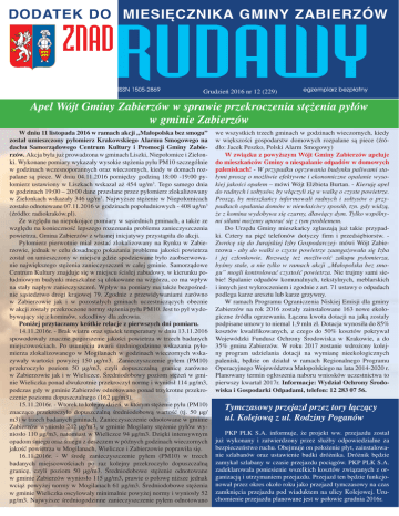 DODATEK DO MIESIĘCZNIKA GMINY ZABIERZÓW Grudzień 2016 nr 12 (229) Apel Wójt Gminy Zabierzów w sprawie przekroczenia stężenia pyłów w gminie Zabierzów W dniu 11 listopada 2016 w ramach akcji „Małopolska bez smogu” został umieszczony pyłomierz Krakowskiego Alarmu Smogowego na dachu Samorządowego Centrum Kultury i Promocji Gminy Zabierzów. Akcja była już prowadzona w gminach Liszki, Niepołomice i Zielonki. Wykonane pomiary wykazały wysokie stężenia pyłu PM10 szczególnie w godzinach wczesnoporannych oraz wieczornych, kiedy w domach rozpalane są piece. W dniu 04.11.2016 pomiędzy godziną 18:00 -19:00 pyłomierz ustawiony w Liszkach wskazał aż 454 ug/m3. Tego samego dnia w godzinach 19:00 – 20:00 dane przesłane przez pyłomierz zlokalizowany w Zielonkach wskazały 346 ug/m3. Najwyższe stężenie w Niepołomicach zostało odnotowane 07.11.2016 w godzinach popołudniowych - 408 ug/m3 (źródło: radiokraków.pl). Ze względu na niepokojące pomiary w sąsiednich gminach, a także ze względu na konieczność lepszego rozeznania problemu zanieczyszczenia powietrza, Gmina Zabierzów z własnej inicjatywy przystąpiła do akcji. Pyłomierz pierwotnie miał zostać zlokalizowany na Rynku w Zabierzowie, jednak w celu dosadnego pokazania problemu jakości powietrza został on umieszczony w miejscu gdzie spodziewane było zaobserwowanie największego stężenia zanieczyszczeń w całej gminie. Samorządowe Centrum Kultury znajduje się w miejscu ścisłej zabudowy, w kierunku południowym budynki mieszkalne są ulokowane na wzgórzu, co ma wpływ na stały napływ zanieczyszczeń. Wpływ na pomiary ma także bezpośrednie sąsiedztwo drogi krajowej 79. Zgodnie z przewidywaniami zarówno w Zabierzowie jak i w pozostałych gminach uczestniczących obecnie w akcji zostały przekroczone normy stężenia pyłu PM10. Jest to pył wydobywający się z kominów, szkodliwy dla zdrowia. Poniżej przytaczamy krótkie relacje z pierwszych dni pomiaru. 14.11.2016r. - Brak wiatru oraz spadek temperatury w dniu 13.11.2016 spowodowały znaczne pogorszenie jakości powietrza w trzech badanych miejscowościach. Po usunięciu awarii średniogodzinne wskazania pyłomierza zlokalizowanego w Mogilanach w godzinach wieczornych wskazywały wartości powyżej 150 μg/m3. Zanieczyszczenie pyłem (PM10) przekroczyło poziom 50 μg/m3, czyli dopuszczalną granicę zarówno w Zabierzowie jak i w Wieliczce. Średniodobowy poziom stężeń w gminie Wieliczka ponad dwukrotnie przekroczył normę i wyniósł 114 μg/m3, podczas gdy w gminie Zabierzów odnotowano ponad trzykrotne przekroczenie poziomu dopuszczalnego (162 μg/m3). 15.11.2016r. - Wtorek to kolejny dzień, w którym stężenie pyłu (PM10) znacząco przekroczyło dopuszczalną średniodobową wartość (tj. 50 μg/ m3) w trzech badanych gminach. Zanieczyszczenie odnotowane w gminie Zabierzów wyniosło 242 μg/m3, w gminie Mogilany stężenie pyłów wyniosło 110 μg/m3, natomiast w Wieliczce 94 μg/m3. Dzięki intensywnym opadom śniegu oraz śniegu z deszczem w późnych godzinach wieczornych jakość powietrza w Mogilanach, Wieliczce i Zabierzowie poprawiła się. 16.11.2016r. - W środę zanieczyszczenie pyłem (PM10) w trzech badanych miejscowościach po raz kolejny przekroczyło dopuszczalną granicę, czyli poziom 50 μg/m3. Średniodobowe stężenie odnotowane w gminie Zabierzów wyniosło 115 μg/m3, prawie o połowę niższe jednak wciąż powyżej normy w Mogilanach 61 μg/m3. Średniodobowe stężenia w gminie Wieliczka oscylowały minimalnie powyżej normy i wyniosły 52 μg/m3. Najwyższe średniogodzinne zanieczyszczenie pyłem odnotowano we wszystkich trzech gminach w godzinach wieczornych, kiedy w większości gospodarstw domowych rozpalane są piece (źródło: Jacek Peszko, Polski Alarm Smogowy) W związku z powyższym Wójt Gminy Zabierzów apeluje do mieszkańców Gminy o niespalanie odpadów w domowych paleniskach! - W przypadku ogrzewania budynku paliwami stałymi proszę o możliwie efektywne i ekonomiczne opalanie wysokiej jakości opałem – mówi Wójt Elżbieta Burtan. - Kieruję apel do radnych i sołtysów, by włączyli się w walkę o czyste powietrze. Proszę, by mieszkańcy informowali radnych i sołtysów o przypadkach opalania domów w niewłaściwy sposób, tzn. gdy widzą, że z komina wydobywa się czarny, dławiący dym. Tylko wspólnymi siłami możemy uporać się z tym problemem. Do Urzędu Gminy mieszkańcy zgłaszają już takie przypadki. Cztery na pięć telefonów dotyczy firm i przedsiębiorstw. Zwrócę się do Jurajskiej Izby Gospodarczej- mówi Wójt Zabierzowa - aby do walki o czyste powietrze zaangażowała się Izba i jej członkowie. Rozważę też możliwość zakupu pyłomierza, byśmy stale, a nie tylko w ramach akcji „Małopolska bez smogu” mogli kontrolować czystość powietrza. Nie trujmy sami siebie! Spalanie odpadów komunalnych, tekstylnych, meblarskich i innych jest wykroczeniem i zgodnie z art. 71 ustawy o odpadach podlega karze aresztu lub karze grzywny. W ramach Programu Ograniczenia Niskiej Emisji dla gminy Zabierzów na rok 2016 zostały zainstalowane 163 nowe ekologiczne źródła ogrzewania. Łączna kwota dotacji na jaką zostały podpisane umowy to niemal 1,9 mln zł. Dotacja wynosiła do 85% kosztów kwalifikowanych, z czego do 50% kosztów pokrywał Wojewódzki Fundusz Ochrony Środowiska w Krakowie, a do 35% gmina Zabierzów. W roku 2017 zostanie wdrożony kolejny program udzielania dotacji na wymianę nieekologicznych palenisk, będzie on działał w ramach Regionalnego Programu Operacyjnego Województwa Małopolskiego na lata 2014-2020 r. Planowany termin ogłoszenia naboru wniosków uczestnictwa to pierwszy kwartał 2017r. Informacje: Wydział Ochrony Środowiska i Gospodarki Odpadami, telefon: 12 283 07 56. Tymczasowy przejazd przez tory łączący ul. Kolejową z ul. Rodziny Poganów PKP PLK S.A. informuje, że projekt ww. przejazdu został już wyk
