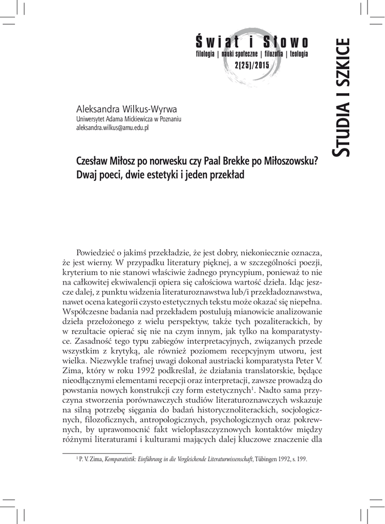 filologia | nauki społeczne | filozofia | teologia 2(25)/2015 Aleksandra Wilkus-Wyrwa Uniwersytet Adama Mickiewicza w Poznaniu [email protected] Czesław Miłosz po norwesku czy Paal Brekke po Miłoszowsku? Dwaj poeci, dwie estetyki i jeden przekład Powiedzieć o jakimś przekładzie, że jest dobry, niekoniecznie oznacza, że jest wierny. W przypadku literatury pięknej, a w szczególności poezji, kryterium to nie stanowi właściwie żadnego pryncypium, ponieważ to nie na całkowitej ekwiwalencji opiera się całościowa wartość dzieła. Idąc jeszcze dalej, z punktu widzenia literaturoznawstwa lub/i przekładoznawstwa, nawet ocena kategorii czysto estetycznych tekstu może okazać się niepełna. Współczesne badania nad przekładem postulują mianowicie analizowanie dzieła przełożonego z wielu perspektyw, także tych pozaliterackich, by w rezultacie opierać się nie na czym innym, jak tylko na komparatystyce. Zasadność tego typu zabiegów interpretacyjnych, związanych przede wszystkim z krytyką, ale również poziomem recepcyjnym utworu, jest wielka. Niezwykle trafnej uwagi dokonał austriacki komparatysta Peter V. Zima, który w roku 1992 podkreślał, że działania translatorskie, będące nieodłącznymi elementami recepcji oraz interpretacji, zawsze prowadzą do powstania nowych konstrukcji czy form estetycznych1. Nadto sama przyczyna stworzenia porównawczych studiów literaturoznawczych wskazuje na silną potrzebę sięgania do badań historycznoliterackich, socjologicznych, filozoficznych, antropologicznych, psychologicznych oraz pokrewnych, by uprawomocnić fakt wielopłaszczyznowych kontaktów między różnymi literaturami i kulturami mających dalej kluczowe znaczenie dla 1 P. V. Zima, Komparatistik: Einführung in die Vergleichende Literaturwissenschaft, Tübingen 1992, s. 199. Studia i szkice Świat i Słowo 200 Aleksandra Wilkus-Wyrwa przekładu2. Komparatystyka wprost nazywana jest nauką pomocniczą Translation Studies, o czym wspominają m.in. Susan Bassnett, Brigitte Schultze, Maria Krysztofiak, Bożena Tokarz3. Nie dziwi zatem chęć doszukiwania się w przełożonym dziele wszelakich pozajęzykowych elementów, które obok intencjonalnych (nierzadko podyktowanych teorią) strategii tłumaczeniowych, wyraźnie przyczyniły się do ostatecznego wyglądu tłumaczonego dzieła. Tekst docelowy zdaje się zatem być wypadkową kontekstów wyjściowych, nadanych oryginalnie przez autora, a także tych, które zostają nań nadbudowane w procesie tłumaczenia – bez względu na obecnie panujące w języku normy estetyczne, wizję końcową dzieła czy wreszcie osobiste inklinacje drugiego autora. Pod pojęciem drugiego autora należy na dobrą sprawę rozumieć każdą osobę, która podjęła się przełożenia dzieła literackiego4.Choć z pozoru postulat ten wydaje się być nader daleko idącym uogólnieniem, zwrócenie bacznej uwagi na postać tłumacza oraz jego rolę w procesie transferu kultur odgrywa w interpretacji opartej o komparatystykę kluczową rolę. Nietrudno bowiem odnieść wrażenie, że nazwisko drugiego autora jest w dzisiejszych czasach marginalizowane nie tylko ze względu na brutalną politykę rynku wydawniczego, ale też odchodzące do historii wielkie nazwiska tłumaczy literatury z najwyższych półek (choćby zmarły w zeszłym roku Stanisław Barańczak), z których dorobkiem trudno dziś konkurować. Nadziei na zmianę tego stanu rzeczy Jerzy Jarniewicz upatruje z kolei w tzw. comming oucie tłumaczy, przyglądając się okładkom polskich książek, na których coraz częściej widnieją (mimo małej czcionki) nazwiska tych, którzy podjęli się karkołomnego, by nie powiedzieć niemożliwego zadania, jakim jest dekodowanie znaków językowo-kulturowych zawartych w oryginale5. Powyższe uwagi nie są jednak wywodami czysto teoretycznymi, choć na to wskazywać może tytuł niniejszych rozważań. Okazuje się bowiem, że już tacy twórcy, jak Johan Gottfried Herder czy Johan Wolfgang von Goethe upatrywali równowagi między oryginałem a przekładem właśnie w osobie tłumacza. Obaj stawiali na indywidualizowanie obu stron „konfliktu», zwłaszcza że przekładem zajmowali się przede wszystkim literaci. Zdaniem Goethego dobry przekład opiera się w istocie na przekazaniu elementu 2 B. Tokarz, „Światło” między językami, czyli o potrzebie komparatystyki, [w:] Komparatystyka literacka a przekład, red. P. Fast, K. Żemła, Katowice 2000, s. 7; P. Bukowski, M. Heydel, Współczesne teorie przekładu. Antologia. Kraków 2009, s. 5. 3 A. Hejmej, Komparatystyka. Studia literackie - studia kulturowe, Kraków 2013, s. 6–21. 4 Określenia tego używa m.in. Anna Legeżyńska w znamienitym kompendium pt. Tłumacz i jego kompetencje autorskie, Warszawa 1999. W pełni świadomie unikam tutaj ponadto określenia „tekst”, by nie wchodzić w paradygmat takich badań tekstów użytkowych. 5 J. Jarniewicz, Gościnność słowa. Szkice o przekładzie literackim, Kraków 2012, s. 7–14. Czesław Miłosz po norwesku czy Paal Brekke po Miłoszowsku?… 201 obcego w sposób interesujący i dostępny (dostosowany do danego kręgu kulturowego) dla przeciętnego odbiorcy, ale przy, paradoksalnie, jednoczesnym zachowaniu wyjątkowości twórcy tłumaczenia. W tym miejscu dochodzimy do komentarzy istotnych dla istnienia poezji Miłosza na gruncie norweskim. Biorąc pod uwagę, że Paal Brekke był jednym z najważniejszych pisarzy i poetów współczesnej literatury norweskojęzycznej, należy spodziewać się starcia dwóch twórców naznaczonych własnymi kontekstami. Brigitte Schultze wprowadza do dyskursu przekładoznawczego pojęcie kontekstów, które uzależnia od gustu tłumacza, panującej epoki, hermetycznego grona odbiorców itd.6 Nazywa je wręcz nieodłącznymi elementami indywidualnej estetyki każdego tłumacza, objawiającej się przede wszystkim w konkretnych konstrukcjach tekstowych, tj. zarówno na poziomie s