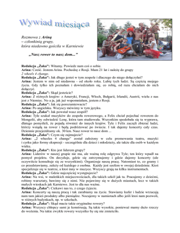 Rozmowa z Ariną – członkinią grupy, która niedawno gościła w Karniewie „Nasz rower to nasz dom...” Redakcja „Żaka”: Witamy. Powiedz nam coś o sobie. Arina: Cześć. Jestem Arina. Pochodzę z Rosji. Mam 21 lat i należę do grupy 2 wheels 4 change. Redakcja „Żaka”: Jak długo jesteś w tym zespole i dlaczego do niego dołączyłaś? Arina: Jestem w nim od niedawna - od około roku. Lubię tych ludzi. Są częścią mojego życia. Gdy tylko ich poznałam i dowiedziałam się, co robią, od razu chciałam do nich dołączyć. Redakcja „Żaka”: Skąd jesteście? Arina: Z różnych krajów: z Ameryki, Francji, Włoch, Bułgarii, Irlandii, Austrii, wielu z nas jest z Niemiec. No a ja, jak już wspomniałam, jestem z Rosji. Redakcja „Żaka”: Jak się porozumiewacie? Arina: Po angielsku. Wszyscy mówimy w tym języku. Redakcja „Żaka”: Jak powstał wasz zespół? Arina: Tyle szukał muzyków do zespołu rowerowego, a Felix chciał pojechać rowerem do Mongolii, aby odwiedzić Lenę, która tam studiowała. Wszystkim spodobała się ta wyprawa, dlatego pomyśleli, że pojadą również do innych krajów. Tyle i Felix zaczęli zbierać ludzi, którzy wsiądą na rower i będą podróżować po świecie. I tak dajemy koncerty cały czas. Dziennie przejeżdżamy ok. 30 km. Nasz rower to nasz dom ... Redakcja „Żaka”: Czym się zajmujecie? Arina: „2 wheeles 4 change” został założony w celu promowania teatru, muzyki i cyrku jako formy ekspresji - szczególnie dla dzieci i młodzieży, ale także dla osób w każdym wieku. Redakcja „Żaka”: Kto jest liderem grupy? Arina: Liderów w naszej grupie nie ma, ale ważną rolę odgrywa Tyle; ten który wpadł na pomysł projektu. On decyduje, gdzie się zatrzymujemy i gdzie dajemy koncerty (ale oczywiście konsultuje się ze wszystkimi). Organizuje naszą pracę. Natomiast to, co gramy i co przedstawiamy, zależy od każdego z osobna. Każdy jest szefem w swojej dziedzinie. Ktoś specjalizuje się w teatrze, a ktoś inny w muzyce. Wszyscy grają na kilku instrumentach. Redakcja „Żaka”: Gdzie najczęściej występujecie? Arina: Na wsi, w maleńkich miejscowościach, dla takich szkół jak ta. Pracujemy z dziećmi, robimy warsztaty, bawimy się z nimi. Nie pojawimy się w dużych miastach, lecz w takich małych wioskach jak Karniewo. Jest to dla nas ważne. Redakcja „Żaka”: Ciekawi nas to, z czego żyjecie. Arina: Koncerty są naszą pracą i tak zarabiamy na życie. Stawiamy kufer i ludzie wrzucają nam tam jakieś produkty albo pieniądze. Nocujemy w namiotach albo jeśli ktoś nam pozwoli, w różnych budynkach, np. w szkołach. Redakcja „Żaka”: Skąd macie takie oryginalne rowery? Arina: Wszyscy chłopcy sami je konstruują. Są takie wysokie, ponieważ mamy dużo rzeczy do wożenia. Na takie zwykłe rowery wszystko by się nie zmieściło. Redakcja „Żaka”: Jak długo chcesz zostać w tej grupie? Arina: Na razie nie myślę o odejściu. Chcę być z tymi ludźmi. Kocham ich za to, co robią i jacy są. Są to moi najlepsi przyjaciele, a takich się nie opuszcza. Redakcja „Żaka”: Bardzo dziękujemy za rozmowę i życzymy powodzenia w dalszych podróżach. Anna Buta, Wioleta Jasińska, Paulina Karcze wska Harmonogram roku szkolnego 2012/2013 Początek roku szkolnego: 3 września 2012 r. Dzień Chłopaka: 30 września 2012r. Dzień Nauczyciela: 14 października 2012r. Wszystkich Świętych: 1 listopada 2012r. (dzień wolny) Święto Niepodległości: 11 listopada 2012r. Andrzejki: 30 listopada 2012r. Mikołajki: 6 grudnia 2012r. Zimowa przerwa świąteczna: 23 grudnia 2012r. - 1 stycznia 2013r. Trzech Króli: 6 stycznia 2012r. (dzień wolny) Ferie zimowe: 28 stycznia - 10 lutego 2013 r. Dzień Kobiet: 8 marca 2013r. Wiosenna przerwa świąteczna: 28 marca – 2 kwietnia 2013 r. Egzamin gimnazjalny: część humanistyczna - 23 kwietnia 2013 r. część matematyczno-przyrodnicza - 24 kwietnia 2013 r. część językowa - 25 kwietnia 2013 r. Majówka: 1-5 maja 2013 r. (1 maja – Święto Pracy, 3 maja – Święto Konstytucji) Dzień Matki: 26 maja 2013r. Boże Ciało: 30 maja 2013r. (dzień wolny) Dzień Dziecka: 1 czerwca 2013r. Dzień Ojca: 23 czerwca 2013r. Zakończenie roku szkolnego: 28 czerwca 2013 r. Wakacje: 29 czerwca - 1 września 2013 r.!!! W sumie do szkoły będziemy chodzić 171 dni. Mento$, ToŚka Rozpoczęcie roku szkolnego 2012/2013 3 września w poniedziałek odbyła się uroczystość rozpoczęcia roku szkolnego. Uczniowie i kadra nauczycielska udali się do kościoła na Mszę świętą o godzinie 800. Ksiądz proboszcz, jak co roku, życzył społeczności szkolnej owocnej pracy i nauki. Już w szkole pierwsze słowa na sali padły z ust Jakuba Przychodzkiego. Sztandar nieśli: Damian Żbikowski, Justyna Bartosiak i Monika Falba. Najpierw przemówił wicewójt pan Grzegorz Cesarski. Nasza nowa pani dyrektor - Małgorzata Bartosiewicz powitała uczniów, życzyła przyjemnej nauki i udanej współpracy. Później młodzież oglądała przedstawienie „Co ja tutaj robię?” przygotowane przez panią Justynę Sadowską i panią Danielę Wawrzonkowską. Oto obsada: mama - Izabela Krupińska, syn Ridge - Maciej Cesarski, koleżanka - Beata Kapusta, nauczycielka - Dominika Lustyk, uczniowie - Wiktoria Panfil, Dorota Dąbrowska, Faustyna Kozicka, Wioleta Jasińska, Maciej Twardowski i Michał Chrzanowski oraz Daniel Sieklucki. W poniedziałek 27 sierpnia aktorzy zapoznali się ze scenariuszem, następnego dnia dostali już role. Próby trwały cały tydzień, do 1 września. W środę było pierwsza spotkanie z nagłośnieniem, nad którym czuwał Kamil Majorkiewicz pod nadzorem pana Rafała Witkowskiego. W poniedziałek zaangażowani w przedstawienie nie uczestniczyli we Mszy Świętej, ponieważ mieli próbę generalną. Skecz to perypetie szkolne. Zakręcona mama przyprowadza swojego ukochanego synusia do szkoły, daje mu kilka rad . Następnie spotyka koleżankę, kt