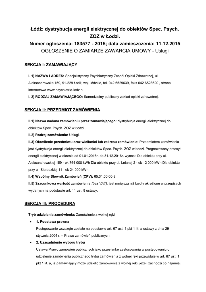 Łódź: dystrybucja energii elektrycznej do obiektów Spec. Psych. ZOZ w Łodzi. Numer ogłoszenia: 183577 - 2015; data zamieszczenia: 11.12.2015 OGŁOSZENIE O ZAMIARZE ZAWARCIA UMOWY - Usługi SEKCJA I: ZAMAWIAJĄCY I. 1) NAZWA I ADRES: Specjalistyczny Psychiatryczny Zespół Opieki Zdrowotnej, ul. Aleksandrowska 159, 91-229 Łódź, woj. łódzkie, tel. 042 6529639, faks 042 6528620 , strona internetowa www.psychiatria-lodz.pl I. 2) RODZAJ ZAMAWIAJĄCEGO: Samodzielny publiczny zakład opieki zdrowotnej. SEKCJA II: PRZEDMIOT ZAMÓWIENIA II.1) Nazwa nadana zamówieniu przez zamawiającego: dystrybucja energii elektrycznej do obiektów Spec. Psych. ZOZ w Łodzi.. II.2) Rodzaj zamówienia: Usługi. II.3) Określenie przedmiotu oraz wielkości lub zakresu zamówienia: Przedmiotem zamówienia jest dystrybucja energii elektrycznej do obiektów Spec. Psych. ZOZ w Łodzi. Prognozowany przesył energii elektrycznej w okresie od 01.01.2016r. do 31.12.2016r. wynosi: Dla obiektu przy ul. Aleksandrowskiej 159 - ok 764 000 kWh Dla obiektu przy ul. Lnianej 2 - ok 12 000 kWh Dla obiektu przy ul. Sieradzkiej 11 - ok 24 000 kWh. II.4) Wspólny Słownik Zamówień (CPV): 65.31.00.00-9. II.5) Szacunkowa wartość zamówienia (bez VAT): jest mniejsza niż kwoty określone w przepisach wydanych na podstawie art. 11 ust. 8 ustawy. SEKCJA III: PROCEDURA Tryb udzielenia zamówienia: Zamówienie z wolnej ręki 1. Podstawa prawna Postępowanie wszczęte zostało na podstawie art. 67 ust. 1 pkt 1 lit. a ustawy z dnia 29 stycznia 2004 r. – Prawo zamówień publicznych. 2. Uzasadnienie wyboru trybu Ustawa Prawo zamówień publicznych jako przesłankę zastosowania w postępowaniu o udzielenie zamówienia publicznego trybu zamówienia z wolnej ręki przewiduje w art. 67 ust. 1 pkt 1 lit. a, iż Zamawiający może udzielić zamówienia z wolnej ręki, jeżeli zachodzi co najmniej jedna z następujących okoliczności: 67.1.1 dostawy, usługi lub roboty budowlane mogą być świadczone tylko przez jednego wykonawcę a. z przyczyn technicznych o obiektywnym charakterze, b. z przyczyn związanych z ochroną praw wyłącznych, wynikających z odrębnych przepisów, c. w przypadku udzielania zamówienia w zakresie działalności twórczej lub artystycznej. W niniejszym zamówieniu mamy do czynienia z przypadkiem opisanym w podpunkcie a. co podyktowane jest następującą sytuacją: uzasadnienie faktyczne : Prawo energetyczne definiuje pojęcie przesyłanie jako transport energii elektrycznej sieciami przesyłowymi w celu ich dostarczenia do sieci dystrybucyjnych lub odbiorcom końcowym przyłączonym do sieci przesyłowych. Zgodnie z art. 3 pkt 5 wskazanej powyżej ustawy pod pojęciem dystrybucja należy natomiast rozumieć transport energii elektrycznej sieciami dystrybucyjnymi w celu ich dostarczenia odbiorcom, z wyłączeniem sprzedaży energii. Zgodnie z przepisami wybór sprzedawcy energii elektrycznej powinien zostać dokonany przez zamawiającego w sposób zapewniający konkurencję. Zamawiający zawarł osobną umowę na dostawę - w ramach zamówienia realizowanego w trybie przetargu nieograniczonego przez Łódzką Grupę Zakupową 2016 z ENEA S.A. Podmiotem świadczącym usługi przesyłania i dystrybucji energii elektrycznej powinien być podmiot, do którego sieci przyłączone są nieruchomości zamawiającego. O ile istnieje możliwość wyboru sprzedawcy energii o tyle brak jest możliwości wyboru przedsiębiorstwa energetycznego zajmującego się świadczeniem usług dystrybucji bądź przesyłania energii elektrycznej. Przedsiębiorstwa te działają w obszarze monopolu naturalnego i Zamawiający nie ma innej możliwości niż zawarcie umowy z Operatorem Sieci Dystrybucyjnej na danym terenie, którym jest w przypadku punktów poboru Zamawiającego PGE Dystrybucja S.A., Oddział Łódź-Miasto, 90-021 Łódź, ul. Tuwima 58. Przedmiotowy operator został wyznaczony do pełnienia funkcji OSD (Operatora Systemu Dystrybucyjnego) w dniu 31 sierpnia 2010 r. decyzją Prezesa Urzędu Regulacji Energetyki na okres od 1 sierpnia 2010 r. do 31 grudnia 2025 r. Obszar działania operatora systemu dystrybucyjnego wynikający z udzielonej temu Przedsiębiorcy koncesji na dystrybucję energii elektrycznej z dnia 31 sierpnia 2010r. nr DEE/42D/19029/W/2/2010/BT ustala, że obszar miasta Łódź objęty jest dystrybucją energii elektrycznej sieciami własnymi Przedsiębiorcy. Należy zauważyć również, że wysokość stawek za przesył energii jest regulowana przez Urząd Regulacji Energetyki i nie podlega negocjacjom. W związku z powyższym uzasadnione jest zastosowanie zamówienia z wolnej ręki na podstawie art. 67 ust. 1 pkt 1 lit. a ustawy Prawo zamówień publicznych. Na poparcie niniejszego uzasadnienia należy przytoczyć wspólną Prezesa Urzędu Zamówień Publicznych i Prezesa Urzędu Regulacji Energetyki zawartą we wspólnym komunikacie z dnia 24.04.2008 r. w sprawie stosowania przepisów ustawy Prawo zamówień publicznych w zakresie dostaw energii elektrycznej. W komunikacie tym jednoznacznie stwierdzono, że o ile istnieje możliwość wyboru sprzedawcy energii brak jest możliwości wyboru przedsiębiorstwa energetycznego zajmującego się świadczeniem usług dystrybucji bądź przesyłania energii elektrycznej. Przedsiębiorstwa te działają w obszarze monopolu naturalnego. W takiej sytuacji, podmioty objęte obowiązkiem udzielenia zamówień publicznych na dostarczenie energii elektrycznej mają następujące możliwości: zamawiający stosując tryby podstawowe udzielania zamówień wybiera przedsiębiorstwo zajmujące się obrotem energią elektryczną, a następnie udziela zamówienia z wolnej ręki na usługi dystrybucji lub przesyłania energii elektrycznej. Przedstawione argumenty uzasadniają przyjęcie trybu zamówienia z wolnej ręki. SEKCJA IV: UDZIELENIE ZAMÓWIENIA NAZWA I ADRES WYKONAWCY KTÓREMU ZAMAWIAJĄCY ZAMIERZA UDZIELIĆ ZAMÓWIENIA PGE Dystrybucja S.A. z siedzibą w Lubli