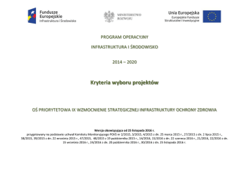 PROGRAM OPERACYJNY INFRASTRUKTURA I ŚRODOWISKO 2014 – 2020 Kryteria wyboru projektów OŚ PRIORYTETOWA IX WZMOCNIENIE STRATEGICZNEJ INFRASTRUKTURY OCHRONY ZDROWIA Wersja obowiązująca od 25 listopada 2016 r. przygotowany na podstawie uchwał Komitetu Monitorującego POIiŚ nr 2/2015, 3/2015, 4/2015 z dn. 25 marca 2015 r., 27/2015 z dn. 2 lipca 2015 r., 38/2015, 39/2015 z dn. 22 września 2015 r., 47/2015, 48/2015 z 19 października 2015 r., 14/2016, 15/2016 z dn. 22 czerwca 2016 r., 21/2016, 22/2016 z dn. 15 września 2016 r., 24/2016 z dn. 20 października 2016 r., 30/2016 z dn. 25 listopada 2016 r. OŚ IX Wzmocnienie strategicznej infrastruktury ochrony zdrowia wersja obowiązująca od 25 listopada 2016 r. W ramach Programu Operacyjnego Infrastruktura i Środowisko przewidziano następujące tryby wyboru projektów: tryb konkursowy; tryb pozakonkursowy. W przypadku projektów „dużych”1, niezależnie od trybu wyboru dofinansowanie projektu wymaga potwierdzenia przez Komisję Europejską (po spełnieniu wymogów opisanych w art. 100-103 rozporządzenia ogólnego). Niezależnie od trybu wyboru projektu projekty oceniane są: kryteriami formalnymi - ocena zerojedynkowa, niespełnienie kryterium powoduje wykluczenie projektu z (dalszej) oceny, oraz kryteriami merytorycznymi, tj. o kryteriami merytorycznymi I stopnia – ocena punktowa (premia w postaci określonej liczby punktów), niespełnienie kryterium nie powoduje wykluczenia projektu z (dalszej) oceny, lub o kryteriami merytorycznymi II stopnia - ocena zerojedynkowa, niespełnienie kryterium powoduje wykluczenie projektu z (dalszej) oceny. Procedury wyboru i zatwierdzania operacji (projektów) są szczegółowo określone w dokumencie System oceny i wyboru projektów w ramach Programu Operacyjnego Infrastruktura i Środowisko 2014-2020, stanowiącym załącznik nr 6 do Szczegółowego opisu osi priorytetowych POIiŚ 2014-2020. Zgodnie z art. 43 ust. 1 ustawy wdrożeniowej2 w razie stwierdzenia we wniosku o dofinansowanie braków formalnych (np. brak podpisu, brak pieczęci) lub oczywistych omyłek (np. błąd rachunkowy, błąd pisarski), właściwa instytucja wzywa wnioskodawcę do uzupełnienia wniosku lub poprawienia w nim oczywistej omyłki w wyznaczonym terminie nie krótszym niż 7 dni, pod rygorem pozostawienia wniosku bez rozpatrzenia i w konsekwencji niedopuszczenie projektu do oceny lub dalszej oceny Instytucja organizująca konkurs może określić w regulaminie konkursu sposób i tryb uzupełniania/modyfikacji wniosku aplikacyjnego na etapie jego oceny, z zastrzeżeniem, że modyfikacja ta nie spowoduje nierównego traktowania wnioskodawców. Wszystkie projekty w ramach osi I-IX POIiŚ oceniane będą kryteriami horyzontalnymi oraz kryteriami sektorowymi przyjętymi dla danego działania /poddziałania / typu projektu. Wszystkie projekty w ramach osi X POIiŚ oceniane będą wyłącznie kryteriami przyjętymi dla danego działania. 1 o których mowa w art. 100. Rozporządzenia Parlamentu Europejskiego i Rady (UE) nr 1303/2013 z dnia 17 grudnia 2013 r. ustanawiającego wspólne przepisy dotyczące Europejskiego Funduszu Rozwoju Regionalnego, Europejskiego Funduszu Społecznego, Funduszu Spójności, Europejskiego Funduszu Rolnego na rzecz Rozwoju Obszarów Wiejskich oraz Europejskiego Funduszu Morskiego i Rybackiego objętych zakresem wspólnych ram strategicznych oraz ustanawiającego przepisy ogólne dotyczące Europejskiego Funduszu Rozwoju Regionalnego, Europejskiego Funduszu Społecznego i Funduszu Spójności oraz uchylającego rozporządzenie Rady (WE) nr 1083/2006 (dalej rozporządzenie ogólne). 2 ustawa z dnia 11 lipca 2014 r. o zasadach realizacji programów w zakresie polityki spójności finansowanych w perspektywie finansowej 2014-2020 (Dz.U. z 2016 r. poz. 217) 2 OŚ IX Wzmocnienie strategicznej infrastruktury ochrony zdrowia wersja obowiązująca od 25 listopada 2016 r. Spis treści Horyzontalne kryteria formalne ................................................................................................................................................................................................................................ 4 Horyzontalne kryteria merytoryczne I stopnia. ........................................................................................................................................................................................................ 6 Horyzontalne kryteria merytoryczne II stopnia ........................................................................................................................................................................................................ 8 DZIAŁANIE 9.2. Infrastruktura ponadregionalnych podmiotów leczniczych ........................................................................................................................................................... 12 Typ projektu: ........................................................................................................................................................................................................................................................... 12 Wsparcie oddziałów oraz innych jednostek organizacyjnych szpitali ponadregionalnych, udzielających świadczeń zdrowotnych stacjonarnych i całodobowych na rzecz osób dorosłych, dedykowanych chorobom, które są istotną przyczyną dezaktywizacji zawodowej, tj. chorobom układu krążenia, nowotworowym, chorobom układu kostno– stawowo–mięśniowego, chorobom układu oddechowego (roboty budowlane, doposażenie) ............................................................................................................................. 12 Wsparcie ponadregionalnych podmiotów leczniczych udzielających świadczeń zdrowotnych stacjonarnych i całodobowych w zakresie ginekologii, położnictwa, neonatologii, pediatrii oraz innych oddziałów zajmujących się leczeniem dzieci (robot