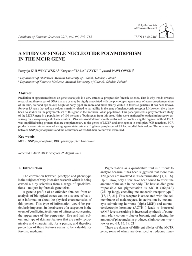 Problems of Forensic Sciences 2013, vol. 96, 702–715 A study of single nucleotide polymorphism in the mc1r gene Patrycja KulwiKowsKa1, Krzysztof TalarczyK2, ryszard Pawłowski2 DepartmentofObstetrics,MedicalUniversityofGdańsk,Gdańsk,Poland DepartmentofForensicMedicine,MedicalUniversityofGdańsk,Gdańsk,Poland 1 2 Abstract Prediction of appearance based on genetic analysis is a very attractive prospect for forensic science. That is why trends towards researching those areas of DNa that are or may be highly associated with the phenotypic appearance of a person (pigmentation of the skin, hair and eye colour, height or body type) are more and more clearly visible in forensic genetics. it has been known for over 15 years that red hair colour is mainly related to variability in the gene of melanocortin receptor i. However, there have been no studies on the polymorphism of this gene in the northern Polish population. This paper presents a polymorphism study of the Mc1r gene in a population of 100 persons of both sexes from this area. Hairs were analyzed by optical microscopy, assessing their morphological characteristics. DNa was isolated from mouth swabs and hair roots using the organic method. DNa was amplified using primers that are complementary to the genes of Mc1r and amelogenin in multiplex Pcr reactions. Pcr products were minisequenced using appropriate primers. Eighteen people out of 95 had reddish hair colour. The relationship between sNP polymorphisms and the occurrence of reddish hair colour was examined. Key words Mc1r; sNP polymorphism; rHc phenotype; red hair colour. Received 3 April 2013; accepted 26 August 2013 1. introduction The correlation between genotype and phenotype is the subject of very intensive research which is being carried out by scientists from a range of specializations – not just by forensic geneticists. a genetic profile of an offender obtained from an analysis of biological traces can be a source of valuable information about the physical characteristics of this person. This type of information would be particularly important in the absence of a suspect or in the event of conflicting testimony of witnesses concerning the appearance of the perpetrator. Eye and hair colour and type of skin are features that are easily recognizable and characteristic for a person, and therefore prediction of these features seems to be valuable for forensic medicine. Pigmentation as a quantitative trait is difficult to analyze because it has been suggested that more than 120 genes are involved in its determination [3, 4, 16]. up till now, only a few have been found to affect the amount of melanin in the body. The best studied gene responsible for pigmentation is Mc1r (16q24.3) (951 bp long), encoding melanocortin receptor type i [17, 18, 21]. This receptor is associated with the cell membrane of melanocytes. its activation by melanocyte stimulating hormone (alpha-MsH) and adrenocorticotropic hormone (acTH ) leads to increased caMP levels, resulting in increased synthesis of eumelanin (dark colour – blue or brown), and reducing the amount of phaeomelanin produced (light colour – yellow or red) [3, 15, 19, 21]. There are dozens of different alleles of the Mc1r gene, some of which are described as reducing func- 703 A study of single nucleotide polymorphism in the MC1R gene tionality or affecting the expression of the membrane receptor of melanocytes, and are linked with overproduction of phaeomelanin, which manifests itself in the rHc (red hair colour) phenotype. individuals with the rHc phenotype are characterized by reddish-brown hair colour, pale skin, sensitivity to ultraviolet light (Type i skin according to the Fitzpatrick scale) and the presence of freckles [8, 10, 11, 19]. alleles of the Mc1r gene have been divided into two groups: those strongly predisposing to the rHc phenotype, denoted r, and those with a lower degree of correlation with this phenotype – r [3, 6, 8, 9, 10]. originally, the first group included four sNP mutations: c252, c451T, c478T and G880c, and later it was extended by G425 and missense mutations – 89insa. The r category includes: G178T, G274a, G488a, and T464c. Functional studies have confirmed that the mutations: G425 c451T, c478T and G880c significantly lower the efficiency of the receptor [2, 3], but the mechanism of action of these mutations is not fully understood and may vary significantly depending on the polymorphism. The rHc phenotype is inherited as recessive, but the effect of mutation is quantitative, which means that heterozygous individuals carrying one mutant allele and one normal one can have light skin, reddish hair and freckles, and additionally in men this system of alleles may manifest in a reddish beard. Homozygotes with two mutated alleles r or complex heterozygous r/r usually have the rHc phenotype. The most numerous in the population are c451T and c478T mutations, and these two polymorphic sites have the greatest impact on the occurrence of the rHc phenotype in populations of northern Europe. However, in the italian population, homozygotes having two mutant alleles r with no rHc phenotype were observed [11], which is probably associated with the masking effect of the other genes. The aim of this study was to determine the frequency of occurrence of polymorphisms of the Mc1r gene responsible for the red colour of hair in a sample of the northern Polish population and their usefulness in determining reddish hair colour. 2. materials and methods 2.1. samples Hairs and mouth swabs were collected from 100 people of both sexes living in northern Poland. Persons were selected to represent men and women with maximum possible hair colours occurring in the analyzed population. Hair colour evaluation was carried out by macroscopic and microscopic observations, and colour was divided into six categories (red, reddish strawberry blond, blond, dark blond, brown and black hair), based on archetypes of colours described in the 