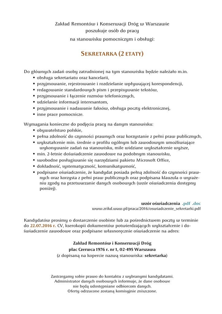 Zakład Remontów i Konserwacji Dróg w Warszawie poszukuje osób do pracy na stanowisku pomocniczym i obsługi: SEKRETARKA (2 ETATY) Do głównych zadań osoby zatrudnionej na tym stanowisku będzie należało m.in. obsługa sekretariatu oraz kancelarii, przyjmowanie, rejestrowanie i rozdzielanie wpływającej korespondencji, redagowanie standardowych pism i przepisywanie tekstów, przyjmowanie i łączenie rozmów telefonicznych, udzielanie informacji interesantom, przyjmowanie i nadawanie faksów, obsługa poczty elektronicznej, inne prace pomocnicze. Wymagania konieczne do podjęcia pracy na danym stanowisku: obywatelstwo polskie, pełna zdolność do czynności prawnych oraz korzystanie z pełni praw publicznych, wykształcenie min. średnie o profilu ogólnym lub zawodowym umożliwiające wykonywanie zadań na stanowisku, mile widziane wykształcenie wyższe, min. 2-letnie doświadczenie zawodowe na podobnym stanowisku, swobodne posługiwanie się narzędziami pakietu Microsoft Office, dokładność, systematyczność, komunikatywność, podpisane oświadczenie, że kandydat posiada pełną zdolność do czynności prawnych oraz korzysta z pełni praw publicznych oraz podpisana klauzula o wyrażeniu zgody na przetwarzanie danych osobowych (wzór oświadczenia dostępny poniżej). wzór oświadczenia .pdf .doc www.zrikd.waw.pl/praca/2016/oswiadczenie_sekretarki.pdf Kandydatów prosimy o dostarczenie osobiste lub za pośrednictwem poczty w terminie do 22.07.2016 r. CV, kserokopii dokumentów potwierdzających wykształcenie i doświadczenie zawodowe oraz podpisane własnoręcznie oświadczenie na adres: Zakład Remontów i Konserwacji Dróg plac Czerwca 1976 r. nr 1, 02-495 Warszawa (z dopisaną na kopercie nazwą stanowiska: sekretarka) Zastrzegamy sobie prawo do kontaktu z wybranymi kandydatami. Administrator danych osobowych informuje, że dane osobowe nie będą udostępniane odbiorcom danych. Oferty odrzucone zostaną komisyjnie zniszczone.