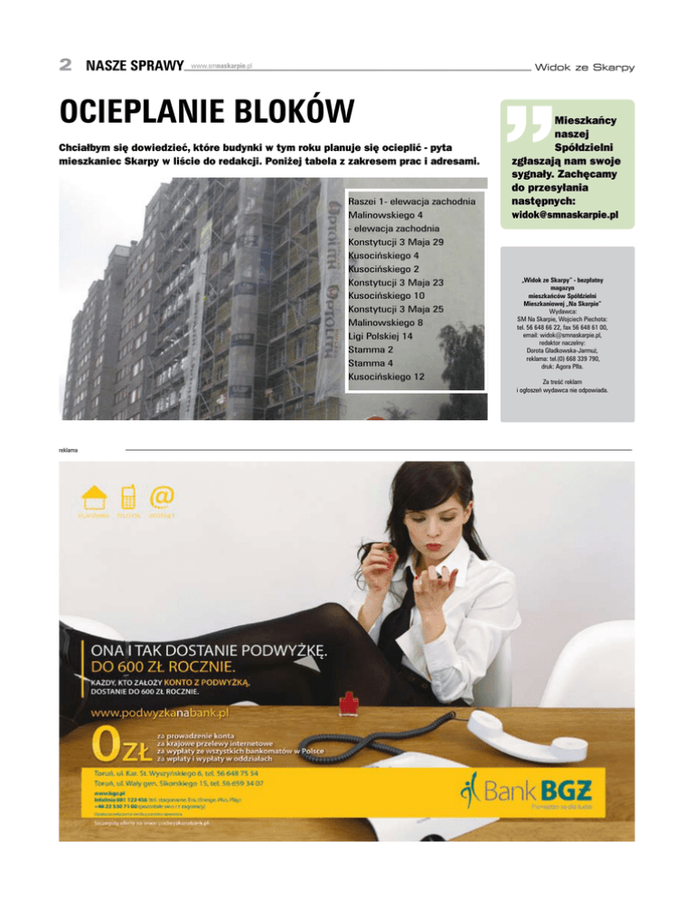 2 nasze sprawy www.smnaskarpie.pl Widok ze Skarpy Ocieplanie bloków Chciałbym się dowiedzieć, które budynki w tym roku planuje się ocieplić - pyta mieszkaniec Skarpy w liście do redakcji. Poniżej tabela z zakresem prac i adresami. Raszei 1- elewacja zachodnia Malinowskiego 4 - elewacja zachodnia Konstytucji 3 Maja 29 Kusocińskiego 4 Kusocińskiego 2 Konstytucji 3 Maja 23 Kusocińskiego 10 Konstytucji 3 Maja 25 Malinowskiego 8 Ligi Polskiej 14 Stamma 2 Stamma 4 Kusocińskiego 12 reklama Mieszkańcy naszej Spółdzielni zgłaszają nam swoje sygnały. Zachęcamy do przesyłania następnych: [email protected] „Widok ze Skarpy” - bezpłatny magazyn mieszkańców Spółdzielni Mieszkaniowej „Na Skarpie” Wydawca: SM Na Skarpie, Wojciech Piechota: tel. 56 648 66 22, fax 56 648 61 00, email: [email protected], redaktor naczelny: Dorota Gładkowska-Jarmuż, reklama: tel.(0) 668 339 790, druk: Agora PIła. Za treść reklam i ogłoszeń wydawca nie odpowiada.