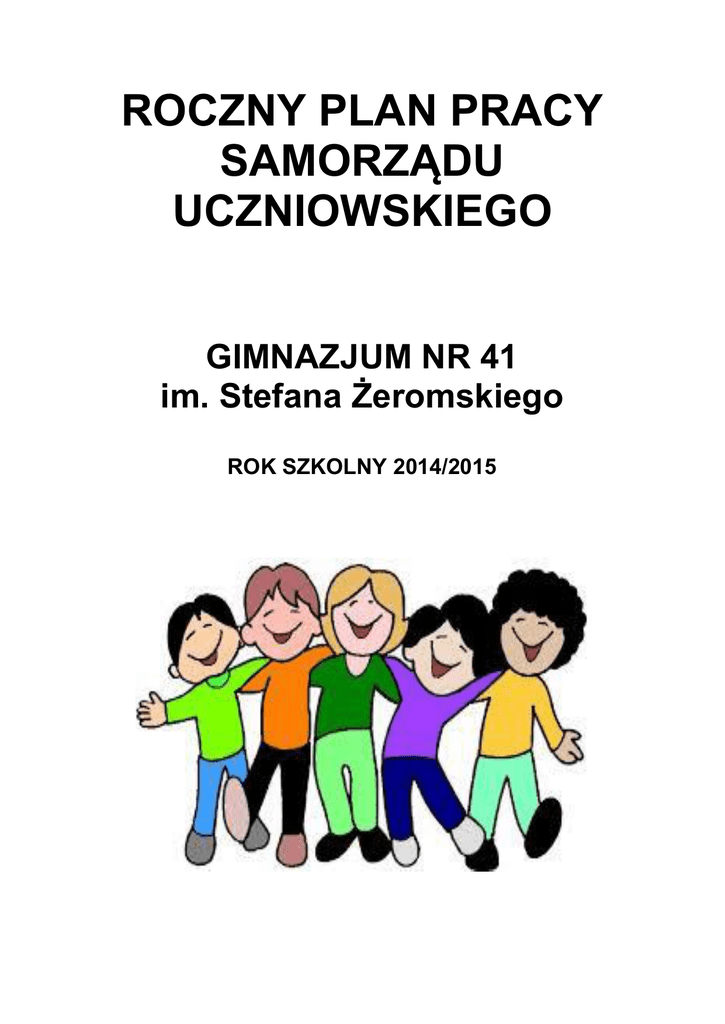 ROCZNY PLAN PRACY SAMORZĄDU UCZNIOWSKIEGO GIMNAZJUM NR 41 im. Stefana Żeromskiego ROK SZKOLNY 2014/2015 SAMORZĄD UCZNIOWSKI W PLANIE PRACY KŁADZIE SZCZEGÓLNY NACISK NA: • tworzenie warunków do rozwoju samodzielności i samorządności uczniów poprzez wyrabianie poczucia odpowiedzialności za podjęte zadania, • budowanie pozytywnego, sprzyjającego uczeniu się klimatu w szkole, • rozwój zainteresowań naukowych, sportowych i artystycznych, • tworzenie warunków indywidualnego i grupowego działania na rzecz innych, • tworzenie silnej więzi między wszystkimi uczniami, • dbanie o mienie szkolne i dobre imię szkoły, budowanie poczucia odpowiedzialności i szacunku SPOTKANIA, APELE PORZĄDKOWE, DYSKOTEKI, WYDARZENIA CYKLICZNE : Zebrania Rady Samorządu Uczniowskiego: pierwszy poniedziałek lub wtorek miesiąca oraz zgodnie z potrzebami. Apele porządkowe: 17 października, 12 grudnia,27 lutego, 17 kwietnia, 12 czerwca Terminy dyskotek szkolnych: 17 października, 28 listopada, 9 stycznia, Losowanie szczęśliwego numerka: każdy czwartek tygodnia. Konkurs na : - zaprojektowanie maskotki szkoły, - najlepszy film promujący szkołę - kółko międzynarodowe (polegało to będzie na tym, że na kółku między narodowym będą osoby zainteresowane dowiadywać się o różnych kulturach innych państw + do wydania gazetki szkolnej dodawany będzie krótki teks o kulturze danego kraju) OPIEKUNOWIE SAMORZĄDU: p. Ewa Doliwa - Walczak, p. Dorota Jastrzębska PRZEDSTAWICIELE SAMORZADU UCZNIOWSKIEGO: Patrycja Gościmińska Karolina Derlatka Przewodniczący klas : IA Jakub Ignaczak IB Kacper Oset IC Albert Piątkowski ID Wiktor Duś IIA Paloma Brzostowicz IIB Jagoda Bonecka IIC Zuzanna Bakalarz IID Martyna Michalska IIE Agnieszka Polemberska IIIA Karol Suchorzewski IIIB Justyna Nocoń IIIC Mateusz Oleczek IIID Ewelina Stark IIIE Paulina Osińska ROCZNY PLAN PRACY SAMORZĄDU UCZNIOWSKIEGO NA ROK SZKOLNY 2011/12 TERMI N W R Z E Ś I E Ń P A Ź D Z I E R N I K ZADANIA FORMY REALIZACJI 1. Rozwijanie przypomnienie trybu ordynacji wyborczej, samorządności, wybory wybory przedstawicieli do samorządu przez poszczególne samorządu uczniowskiego klasy, wypełnienie kart zgłoszeniowych przez kandydatów, każdy kandydat: -wykonuje plakat informacyjny o swoim programie wyborczym, -komitety wyborcze wykonują ulotki, plakaty wyborcze swojego kandydata i rozwieszają na korytarzach szkolnych. 1. Wybory do Młodzieżowej Rady Miejskiej organizacja komitetów wyborczych, przeprowadzenie wyborów do Młodzieżowej Rady Miejskiej, 2. Uroczyste obchody Dnia Nauczyciela wykonanie kartek z życzeniami dla nauczycieli 3. Spotkanie organizacyjne podział samorządu na sekcje: dekoracyjną, porządkową, redakcyjną, rozrywkową, określenie zadań każdej z nich, 4. Opracowanie rocznego planu pracy samorządu ustalenie harmonogramu zadań i określenie terminów ich realizacji oraz osób odpowiedzialnych za ich wykonanie, ustalenie harmonogramu spotkań Rady S.U. z przewodniczącymi klas. 5. Ślubowanie klas I i dyskoteka szkolna Udział SU w ślubowaniu, zorganizowanie dyskoteki szkolnej 17.10.2014r. 6. Apel SU Podsumowanie wyborów do SU, sprawy bieżące 7. Dzień tematyczny: Halloween Uczniowie 31.10 przychodzą przebrani w postaci halloween L I S T O P A D 1. Dzień tematyczny: 21.XI niebieski kolor 2. Andrzejki w naszej szkole „Trzynastkowe wróżby i …......”, dyskoteka andrzejkowa organizacja: wróżb, zabaw Andrzejkowych, -organizacja dyskoteki 28.11.2014r. pieniądze przeznaczone na zakup artykułów papierniczych -sprzedaż biletów, -organizacja szatni, 3. „I ty możesz zostać Św. Mikołajem”wspólnie z Wolontariatem szkolnym uczniowie przebrani na niebiesko każda klasa oddaje 7 kartek świątecznych do 10.12 i przynosi ciasto 17.12.14. Na wywiadówce 17.12.14 odbędzie się ich sprzedaż. Uzyskane pieniądze zostaną przeznaczone na zakup paczek świątecznych dla potrzebujących uczniów naszej szkoły. 4. Rozpoczęcie konkursu na maskotkę szkoły Ogłoszenie konkursu na maskotkę szkoły G R U D Z I E Ń 1. Dzień tematyczny: czapki mikołajkowe 5 XII 2. W Świątecznym nastroju dla uczniów w mikołajkowych czapkach, opracowanie regulaminu i ogłoszenie konkursu „ Na najładniej udekorowaną klasę”, gazetki ścienne o tematyce świątecznej w każdej sali, wszystkie klasy wykonują plakaty do 12.12.14, będące kartkami z życzeniami świątecznymi dla Rady Pedagogicznej, pracowników szkoły, kolegów i koleżanek i zawieszają je 12.12.14 na drzwiach swoich sal, dekoracja świąteczna szkoły, na wywiadówce 17.12.14 odbędzie się sprzedaż kartek świątecznych i ciast. Uzyskane pieniądze zostaną przeznaczone na paczki świąteczne dla potrzebujących uczniów naszej szkoły, 3. Świąteczny kiermasz kartek i ciast przygotowanie paczek wraz z wolontariuszami i przekazanie ich uczniom, 4. „Konkurs na najładniej udekorowaną klasę” S T Y C Z E Ń 1. Dzień tematyczny: ogłoszenie konkursu na początku miesiąca, -przygotowanie dokumentacji fotograficznej i umieszczenie jej na gazetce samorządu, -OCENIANIE DEKORACJI 16.12.14 i rozstrzygnięcie konkursu 18.12.14, dla uczniów w pidżamach organizacja dyskoteki zgodnie z regulaminem: -opieka nad sprzętem grającym, -dyżury przy wejściu do szkoły, -sprzedaż biletów, -organizacja szatni, -konkurs „Na najlepszego tancerza, tancerki” -konkurs „Na najciekawszy ubiór” - przeznaczenie pieniędzy z dyskoteki na WOŚP Pidżamy 16.I 2. Dyskoteka karnawałowa 9 stycznia WOŚP 3. Ferie zimowe każda klasa omawia zasady bezpieczeństwa na feriach na godzinach wychowawczych i sporządza „Komiks z zasadami bezpiecznych ferii” - za najciekawszy NAGODA. L U T Y 1. 18.02.2015 dzień tematyczny: kolor czerwony 2. Dzień tematyczny27.02.15 -Dzień pluszowego misia Dzień 18.02.2015r. dniem na czerwono, osoby ubrane na czerwono zwolnione z pytania i kartkówek. 27.02.15 – Dzień pluszowego misia-z p