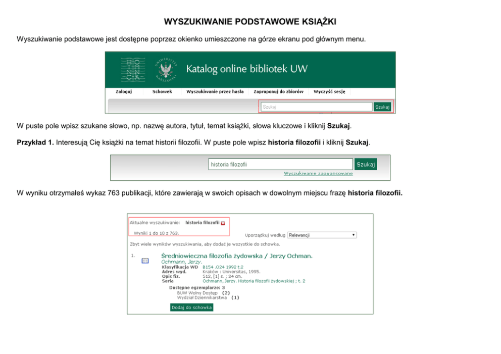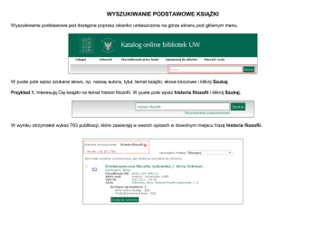 WYSZUKIWANIE PODSTAWOWE KSIĄŻKI Wyszukiwanie podstawowe jest dostępne poprzez okienko umieszczone na górze ekranu pod głównym menu. W puste pole wpisz szukane słowo, np. nazwę autora, tytuł, temat książki, słowa kluczowe i kliknij Szukaj. Przykład 1. Interesują Cię książki na temat historii filozofii. W puste pole wpisz historia filozofii i kliknij Szukaj. W wyniku otrzymałeś wykaz 763 publikacji, które zawierają w swoich opisach w dowolnym miejscu frazę historia filozofii. Powyższe wyniki wyszukiwania porządkowane są wg relewancji, czyli trafności. Jako pierwsze wyświetlane są opisy, w których wyrażenie historia filozofii występuje w polach takich jak tytuł, autor, temat, a następnie w pozostałych polach opisu. Jeśli chcesz inaczej uporządkować wyniki wyszukiwania, skorzystaj z opcji Uporządkuj według, znajdującej się na górze ekranu po prawej stronie i zaznacz odpowiadający Ci sposób. Wśród wyników wyszukiwania dotyczących historii filozofii są 752 książki, 10 czasopism, jedno nagranie dźwiękowe (jeden audiobook). Jeśli interesują Cię tylko książki, spośród opcji dostępnych w fasecie Typ publikacji, znajdującej się w dolnym lewym rogu ekranu, wybierz Książka (752). Otrzymasz wówczas tylko opisy 752 książek zawierających w swoich opisach frazę historia filozofii. Dodatkowo możesz listę wyników zawęzić, zaznaczając odpowiednie pola z innych faset, znajdujących się w lewym pasku ekranu – Autor, Autor (instytucja), Rok wydania, Klasyfikacja Biblioteki Kongresu, Temat polski, Miejsce wydania, Lokalizacja, Język. Przykład 2. Szukasz publikacji, których autorem jest Janusz Tazbir. W puste okienko wpisz Janusz Tazbir i kliknij Szukaj. W wyniku wyszukiwania otrzymałeś wykaz 137 publikacji, których Janusz Tazbir jest autorem, redaktorem, tłumaczem itd. Powyższe wyniki wyszukiwania porządkowane są wg relewancji, czyli trafności. Jeśli chcesz je uporządkować, np. według tytułu, skorzystaj z opcji Uporządkuj według i zaznacz Tytułu. Jeśli interesują Cię tylko publikacje, których Janusz Tazbir jest autorem i/lub współautorem, skorzystaj z fasety Autor, znajdującej się w lewym pasku ekranu i zaznacz Tazbir, Janusz (1927- ). (134) Otrzymasz wówczas opisy 134 publikacji, które spełniają ten warunek.