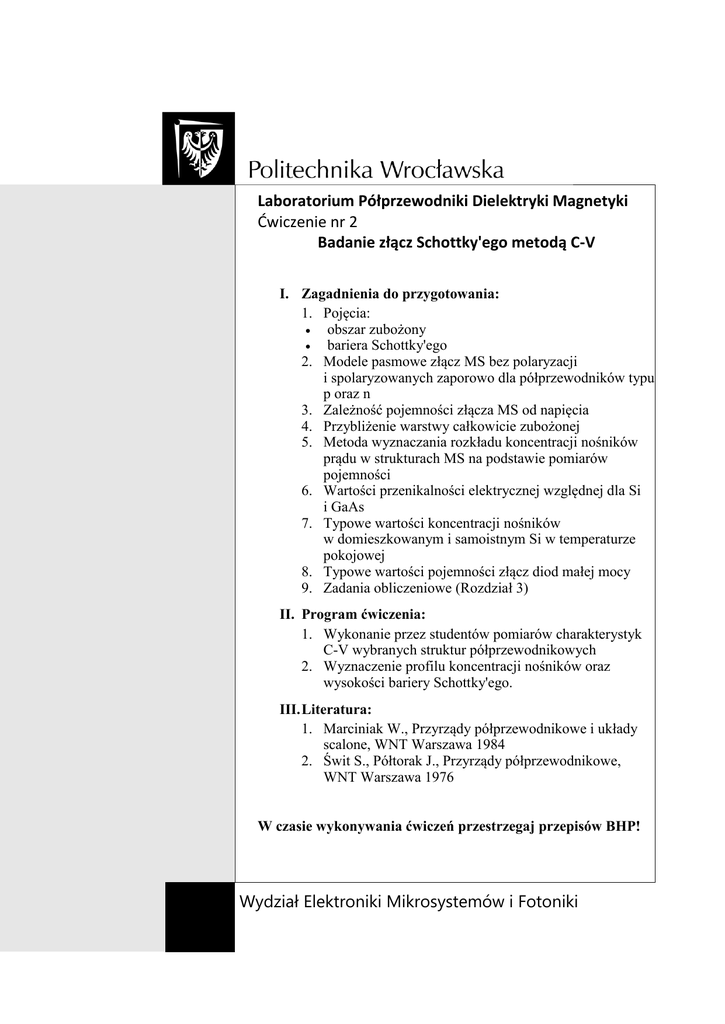 Laboratorium Półprzewodniki Dielektryki Magnetyki Ćwiczenie nr 2 Badanie złącz Schottky'ego metodą C-V I. Zagadnienia do przygotowania: 1. Pojęcia: obszar zubożony bariera Schottky'ego 2. Modele pasmowe złącz MS bez polaryzacji i spolaryzowanych zaporowo dla półprzewodników typu p oraz n 3. Zależność pojemności złącza MS od napięcia 4. Przybliżenie warstwy całkowicie zubożonej 5. Metoda wyznaczania rozkładu koncentracji nośników prądu w strukturach MS na podstawie pomiarów pojemności 6. Wartości przenikalności elektrycznej względnej dla Si i GaAs 7. Typowe wartości koncentracji nośników w domieszkowanym i samoistnym Si w temperaturze pokojowej 8. Typowe wartości pojemności złącz diod małej mocy 9. Zadania obliczeniowe (Rozdział 3) II. Program ćwiczenia: 1. Wykonanie przez studentów pomiarów charakterystyk C-V wybranych struktur półprzewodnikowych 2. Wyznaczenie profilu koncentracji nośników oraz wysokości bariery Schottky'ego. III. Literatura: 1. Marciniak W., Przyrządy półprzewodnikowe i układy scalone, WNT Warszawa 1984 2. Świt S., Półtorak J., Przyrządy półprzewodnikowe, WNT Warszawa 1976 W czasie wykonywania ćwiczeń przestrzegaj przepisów BHP! Wydział Elektroniki Mikrosystemów i Fotoniki 1. Wstęp 1.1. Cel ćwiczenia W ćwiczeniu przedstawiona jest metoda pomiaru parametrów struktur półprzewodnikowych techniką C-V. Część praktyczna ćwiczenia obejmuje wyznaczenie charakterystyk C-V struktur półprzewodnikowych i wyznaczenie z nich profilu koncentracji nośników oraz wysokości bariery Schottky'ego. 1.2. Złącze Schottky'ego metal 1,5 0,5 17 10 16 10 15 EF 0,0 10 14 10 13 10 12 -3 EC n [cm ] energia [eV] 10 półprzewodnik 1,0 głębokość półprzewodnik 0 metal Złącze metal – półprzewodnik (rysunek 1a) jest złączem Schottky'ego [Marciniak, Świt Półtorak] gdy praca wyjścia elektronów z metalu m i z półprzewodnika s spełniają zależność: m s dla półprzewodnika typu p m s dla półprzewodnika typu n W półprzewodniku przy złączu Schottky'ego tworzy się warstwa zubożona (rysunek 1c), której grubość zależy od napięcia polaryzującego złącze. Przykładowy diagram pasmowy półprzewodnika w pobliżu złącza przedstawiono na rysunku 1b: a) b) c) U 0V -1,0 V U -0,5 EV -1,0 0,0 0,2 0,4 0,6 0,8 1,0 głębokość [m] 0,0 0,2 0,4 0,6 0,8 1,0 głębokość [m] Rysunek 1: a) schemat złącza metal-półprzewodnik, b) model pasmowy złącza Schottky'ego dla różnych napięć polaryzacji złącza, c) logarytm koncentracji elektronów w obszarze złącza Schottky'ego dla różnych napięć polaryzacji złącza. W złączu takim występują zatem dwa obszary przewodzące: metal i niezubożona część półprzewodnika, oddzielone obszarem nieprzewodzącym o zmiennej grubości, jakim jest warstwa zubożona. Należy się zatem spodziewać, że będzie się ono cechowało pojemnością elektryczną, zmieniającą się w zależności od przyłożonego napięcia tak, jak zmienia się pojemność kondensatora płaskiego przy zmianie odległości między jego okładkami. Właściwość ta jest wykorzystywana w jednej z ważniejszych metod badania rozkładu koncentracji nośników i domieszki w półprzewodniku jest pomiar charakterystyk pojemnościowo-napięciowych struktur metal-półprzewodnik. W rzeczywistości problem jest bardziej złożony, niż to dotąd przedstawiono. Gra rolę większa ilość efektów, niż tylko zmiana grubości warstwy zubożonej wywołana zmianą potencjału kontaktu Schottky'ego. Rozważmy bilans ładunku po obu stronach mierzonego „kondensatora”: Qm Qit A q p( x) n( x) N D ( x) N A ( x) nT ( x)dx 1 0 gdzie: Qm – ładunek zgromadzony w metalu, Qit – ładunek zgromadzony w warstwie przejściowej metal-półprzewodnik, A – pole kontaktu, q – ładunek elementarny, (1) l – długość próbki, p(x) – koncentracja dziur, n(x) – koncentracja elektronów, ND(x) – koncentracja zjonizowanych donorów, NA(x) – koncentracja zjonizowanych akceptorów, nT(x) – koncentracja zjonizowanych głębokich poziomów pułapkowych. Na bilans ładunku składa sie z jednej strony ładunek zgromadzony na metalowej elektrodzie, a z drugiej strony oprócz ładunku w warstwie przejściowej metal-półprzewodnik, bierze się pod uwagę całkowity ładunek zgromadzony w objętości półprzewodnika (całka koncentracji ładunków przemnożona przez powierzchnię próbki). Dla uproszczenia zagadnienia stosuje się tzw. przybliżenie warstwy całkowicie zubożonej, w którym wprowadza się pojęcie granicy warstwy zubożonej W, oraz, że: N ( x) N A ( x) dla x W p ( x ) n( x ) D 0 dla x W (2) E(x) = 0 dla x>W (3) gdzie W – granica warstwy zubożonej, E(x) – natężenie pola elektrycznego. Założenia te oznaczają, że na głębokości mniejszej niż grubość warstwy zubożonej występuje zupełny brak nośników, a poza nią koncentracja ta wynika wprost z koncentracji domieszek (2), jak również zakłada się całkowity brak pola elektrycznego poza warstwą zubożoną (3). Jak widać na rysunku 1, założenia te stanowią dość duże uproszczenie rzeczywistej sytuacji. Zakładając również, że ładunek zgromadzony w warstwie przejściowej metal-półprzewodnik i na głębokich poziomach w warstwie zubożonej nie zależy od napięcia polaryzującego, można powiązać liczbowo zmiany ładunku przestrzennego opisanego zależnością (1) z wywołanym zmianami napięcia polaryzującego złącze przesuwaniem granicy warstwy zubożonej: dQm A q p( x) n( x)dW (4) Jak już napisano, badaną strukturę MS można traktować jako kondensator płaski o pojemności C. W kondensatorze płaskim prawdziwe są zależności: C A W (5) dQ dU (6) i C gdzie: C – mierzona pojemność struktury U – napięcie polaryzujące =0r – przenikalność dielektryczna półprzewodnika Łącząc wyrażenia (4), (5) i (6) można uzyskać zależność: p ( x ) n( x ) 2dU q w 0 A2 d C 2 (7) gdzie: x