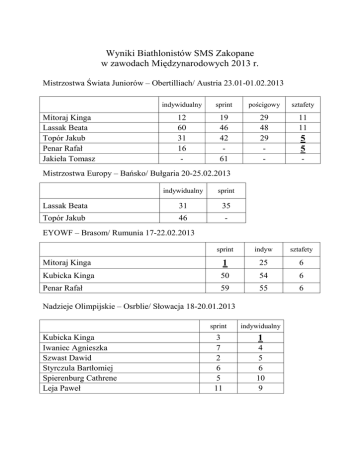 Wyniki Biathlonistów SMS Zakopane w zawodach Międzynarodowych 2013 r. Mistrzostwa Świata Juniorów – Obertilliach/ Austria 23.01-01.02.2013 indywidualny sprint pościgowy sztafety 12 60 31 16 - 19 46 42 61 29 48 29 - 11 11 sprint indyw sztafety Mitoraj Kinga 1 25 6 Kubicka Kinga 50 54 6 Penar Rafał 59 55 6 Mitoraj Kinga Lassak Beata Topór Jakub Penar Rafał Jakieła Tomasz 5 5 - Mistrzostwa Europy – Bańsko/ Bułgaria 20-25.02.2013 indywidualny sprint Lassak Beata 31 35 Topór Jakub 46 - EYOWF – Brasom/ Rumunia 17-22.02.2013 Nadzieje Olimpijskie – Osrblie/ Słowacja 18-20.01.2013 Kubicka Kinga Iwaniec Agnieszka Szwast Dawid Styrczula Bartłomiej Spierenburg Cathrene Leja Paweł sprint indywidualny 3 7 2 6 5 11 1 4 5 6 10 9 Medaliści XIX Ogólnopolskiej Olimpiady Młodzieży i Mistrzostw Polski Juniorów 2013 w biathlonie Uzyskane klasy sportowe: M–1 I – 12 II – 6 1. Mitoraj Kinga 4 medale – 3 x złoty, złoty sztafeta 2. Szwast Dawid 4 medale – 3 x srebrny, srebrny sztafeta 3. Kubicka Kinga 3 medale – 2 x srebrny, 1 x brązowy 4. Penar Rafał 3 medale – 2 x złoty, srebrny sztafeta 5. Lassak Beata 3 medale – 2 x brązowy, złoty sztafeta 6. Ciszek Monika 2 medale – 1 x brązowy, złoty sztafeta 7. Jakieła Tomasz 2 medale – 1 brązowy, złoty sztafeta 8. Topór Jakub 1 medal – 1 x srebrny 9. Iwaniec Agnieszka 1 medal – złoty sztafeta 10. Mniszak Ewa 1 medal – złoty sztafeta 11. Zięba Tomasz 1 medal – złoty sztafeta 12. Bachleda Karol 1 medal – złoty sztafeta Mistrzostwa Polski Młodzików 1. Spierenburg Catherine 2. Leja Paweł 3. Jakieła Joanna 2 medale – 1 x złoty, 1 x srebrny 2 medale – 1 x złoty, 1 x srebrny 2 medale – 2 x srebrny Razem 32 medale