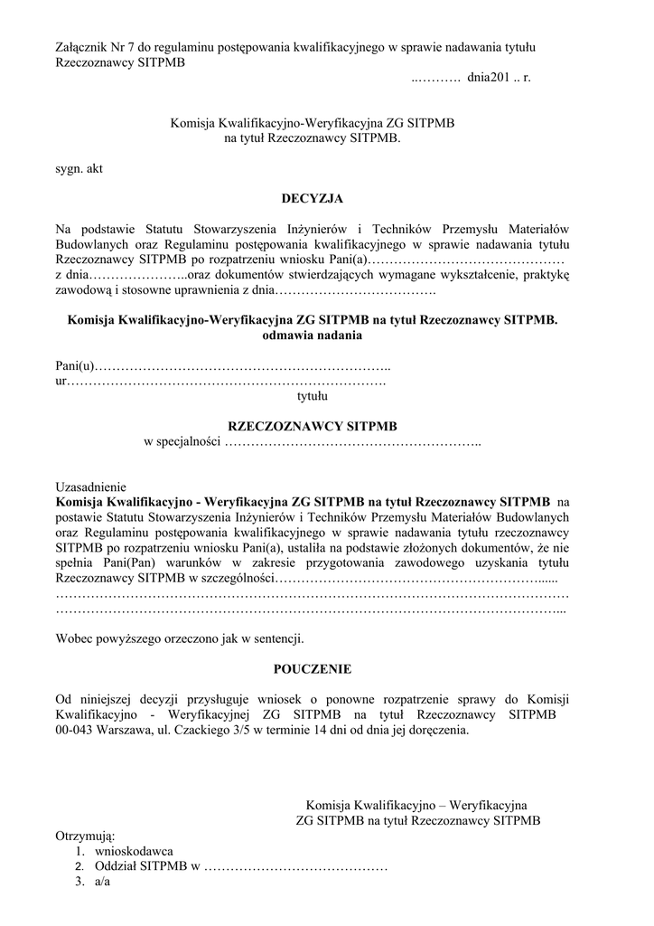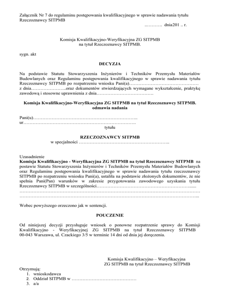 Załącznik Nr 7 do regulaminu postępowania kwalifikacyjnego w sprawie nadawania tytułu Rzeczoznawcy SITPMB ..………. dnia201 .. r. Komisja Kwalifikacyjno-Weryfikacyjna ZG SITPMB na tytuł Rzeczoznawcy SITPMB. sygn. akt DECYZJA Na podstawie Statutu Stowarzyszenia Inżynierów i Techników Przemysłu Materiałów Budowlanych oraz Regulaminu postępowania kwalifikacyjnego w sprawie nadawania tytułu Rzeczoznawcy SITPMB po rozpatrzeniu wniosku Pani(a)……………………………………… z dnia…………………..oraz dokumentów stwierdzających wymagane wykształcenie, praktykę zawodową i stosowne uprawnienia z dnia………………………………. Komisja Kwalifikacyjno-Weryfikacyjna ZG SITPMB na tytuł Rzeczoznawcy SITPMB. odmawia nadania Pani(u)………………………………………………………….. ur………………………………………………………………. tytułu RZECZOZNAWCY SITPMB w specjalności ………………………………………………….. Uzasadnienie Komisja Kwalifikacyjno - Weryfikacyjna ZG SITPMB na tytuł Rzeczoznawcy SITPMB na postawie Statutu Stowarzyszenia Inżynierów i Techników Przemysłu Materiałów Budowlanych oraz Regulaminu postępowania kwalifikacyjnego w sprawie nadawania tytułu rzeczoznawcy SITPMB po rozpatrzeniu wniosku Pani(a), ustaliła na podstawie złożonych dokumentów, że nie spełnia Pani(Pan) warunków w zakresie przygotowania zawodowego uzyskania tytułu Rzeczoznawcy SITPMB w szczególności……………………………………………………...... ……………………………………………………………………………………………………… ……………………………………………………………………………………………………... Wobec powyższego orzeczono jak w sentencji. POUCZENIE Od niniejszej decyzji przysługuje wniosek o ponowne rozpatrzenie sprawy do Komisji Kwalifikacyjno - Weryfikacyjnej ZG SITPMB na tytuł Rzeczoznawcy SITPMB 00-043 Warszawa, ul. Czackiego 3/5 w terminie 14 dni od dnia jej doręczenia. Komisja Kwalifikacyjno – Weryfikacyjna ZG SITPMB na tytuł Rzeczoznawcy SITPMB Otrzymują: 1. wnioskodawca 2. Oddział SITPMB w …………………………………… 3. a/a