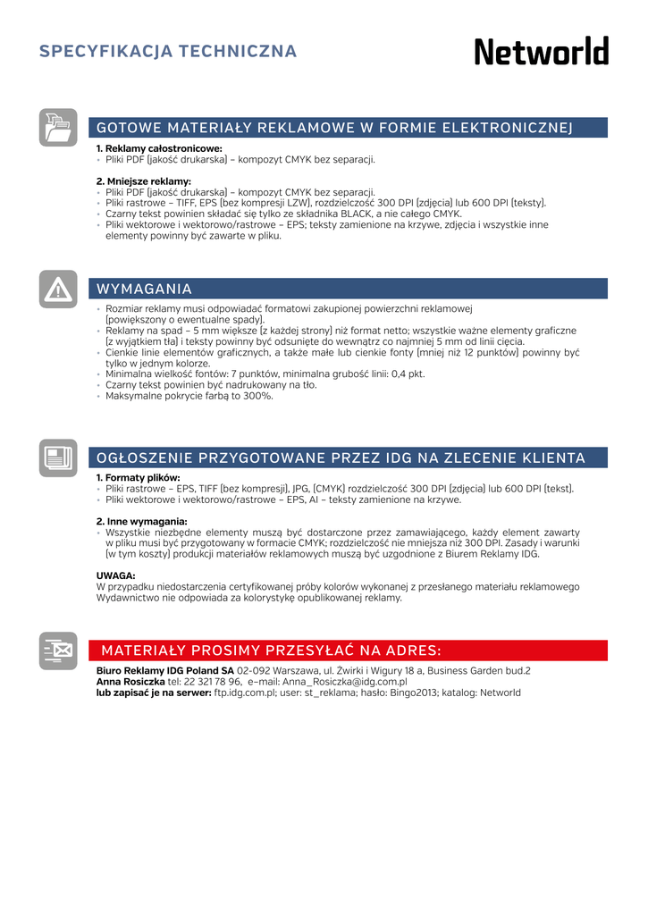 SPECYFIKACJA TECHNICZNA GOTOWE MATERIAŁY REKLAMOWE W FORMIE ELEKTRONICZNEJ 1. Reklamy całostronicowe: • Pliki PDF (jakość drukarska) – kompozyt CMYK bez separacji. 2. Mniejsze reklamy: • Pliki PDF (jakość drukarska) – kompozyt CMYK bez separacji. • Pliki rastrowe – TIFF, EPS (bez kompresji LZW), rozdzielczość 300 DPI (zdjęcia) lub 600 DPI (teksty). • Czarny tekst powinien składać się tylko ze składnika BLACK, a nie całego CMYK. • Pliki wektorowe i wektorowo/rastrowe – EPS; teksty zamienione na krzywe, zdjęcia i wszystkie inne elementy powinny być zawarte w pliku. WYMAGANIA • Rozmiar reklamy musi odpowiadać formatowi zakupionej powierzchni reklamowej (powiększony o ewentualne spady). • Reklamy na spad – 5 mm większe (z każdej strony) niż format netto; wszystkie ważne elementy graficzne (z wyjątkiem tła) i teksty powinny być odsunięte do wewnątrz co najmniej 5 mm od linii cięcia. • Cienkie linie elementów graficznych, a także małe lub cienkie fonty (mniej niż 12 punktów) powinny być tylko w jednym kolorze. • Minimalna wielkość fontów: 7 punktów, minimalna grubość linii: 0,4 pkt. • Czarny tekst powinien być nadrukowany na tło. • Maksymalne pokrycie farbą to 300%. OGŁOSZENIE PRZYGOTOWANE PRZEZ IDG NA ZLECENIE KLIENTA 1. Formaty plików: • Pliki rastrowe – EPS, TIFF (bez kompresji), JPG, (CMYK) rozdzielczość 300 DPI (zdjęcia) lub 600 DPI (tekst). • Pliki wektorowe i wektorowo/rastrowe – EPS, AI – teksty zamienione na krzywe. 2. Inne wymagania: •Wszystkie niezbędne elementy muszą być dostarczone przez zamawiającego, każdy element zawarty w pliku musi być przygotowany w formacie CMYK; rozdzielczość nie mniejsza niż 300 DPI. Zasady i warunki (w tym koszty) produkcji materiałów reklamowych muszą być uzgodnione z Biurem Reklamy IDG. UWAGA: W przypadku niedostarczenia certyfikowanej próby kolorów wykonanej z przesłanego materiału reklamowego Wydawnictwo nie odpowiada za kolorystykę opublikowanej reklamy. MATERIAŁY PROSIMY PRZESYŁAĆ NA ADRES: Biuro Reklamy IDG Poland SA 02-092 Warszawa, ul. Żwirki i Wigury 18 a, Business Garden bud.2 Anna Rosiczka tel: 22 321 78 96, e–mail: [email protected] lub zapisać je na serwer: ftp.idg.com.pl; user: st_reklama; hasło: Bingo2013; katalog: Networld