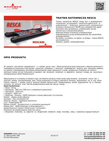 TRATWA RATOWNICZA RESCA Tratwy ratownicze RESCA mogą być z powodzeniem montowane na pojazdach ratowniczo-gaśniczych, w podnośnikach i drabinach pożarniczych, stacjonarnych punktach ratowniczych WOPR oraz wszędzie tam gdzie potrzebny jest sprawdzony, profesjonalny sprzęt ratowniczy o niezawodnej jakości. Nagroda Fińskie Innowacje w Ratownictwie! Zaprojektowane przez profesjonalistów dla ratowników profesjonalistów. Na lodzie, na wodzie, na lądzie i w śniegu – tratwa RESCA jest bezpieczna, stabilna, szybka i wielozadaniowa! OPIS PRODUKTU W każdych warunkach pogodowych i o każdej porze roku, lekka konstrukcja typu katamaran z dwoma pontonami i rozkładanymi poręczami oraz bardzo sztywnym pokładzie z otworami ułatwiającymi wejście jest niezwykle stabilna na wodzie i niezatapialna. Umożliwia podejmowanie osób ratowanych z wody, bezpieczne chodzenie po cienkim, łamliwym lodzie czy też holowanie za quadem lub skuterem śnieżnym w głębokim, kopnym śniegu po wysunięciu zintegrowanych dyszli holowniczych. Wyposażona w 4 uchwyty w każdym rogu, po złożeniu poręczy może służyć jako drabina, przenośne nosze lub z użyciem wózka transportowego jako nosze przewoźne w miejscu zdarzenia. Pontony wyposażone są w liny które można chwycić z każdej pozycji podczas działań ratowniczych. Opatentowane wiosła wyposażone są w linkowe uchwyty na piórach oraz hak do podejmowania osób lub rzeczy z wody. Dane techniczne: • Masa: 40 kg • Wysokość: 300 mm (700 mm z rozłożonymi poręczami) • Szerokość: 1020 mm • Długość: 3000 mm • Materiały: Pontony - HDPE Polietylen o dużej odporności na ścieranie Pokład – sklejka wodo-odporna Zaczepy – Stal nierdzewna A4 Poręcze i dyszle – malowane aluminium Liny – Polipropylen PP Wiosła trzonek – Duraluminium z uchwytami gumowymi Wiosła lotki – HDPE Polietylen o dużej gęstości z opatentowanym hakiem ratowniczym i uchwytami linkowymi do podejmowania osób lub rzeczy • Wszystkie materiały są odporne na długotrwałe działanie wody morskiej, oleju i substancji ropopochodnych KADIMEX Spóka Akcyjna ul. Wólczyńska 290 01-919 Warszawa 02.03.17 tel. (+48) 22 864 99 66 fax. (+48) 22 835 57 85 [email protected] [email protected]