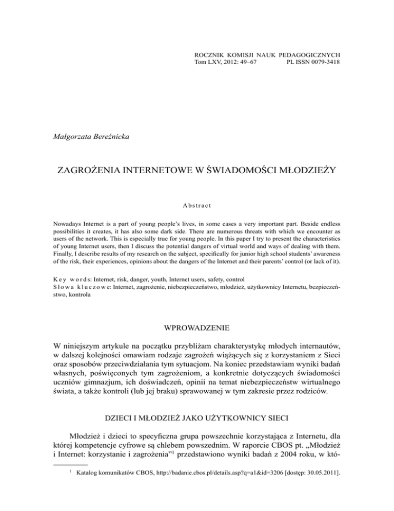 ROCZNIK KOMISJI NAUK PEDAGOGICZNYCH Tom LXV, 2012: 49–67 PL ISSN 0079-3418 Małgorzata Bereźnicka ZAGROŻENIA INTERNETOWE W ŚWIADOMOŚCI MŁODZIEŻY Abstract Nowadays Internet is a part of young people’s lives, in some cases a very important part. Beside endless possibilities it creates, it has also some dark side. There are numerous threats with which we encounter as users of the network. This is especially true for young people. In this paper I try to present the characteristics of young Internet users, then I discuss the potential dangers of virtual world and ways of dealing with them. Finally, I describe results of my research on the subject, specifically for junior high school students’ awareness of the risk, their experiences, opinions about the dangers of the Internet and their parents’ control (or lack of it). K e y w o r d s: Internet, risk, danger, youth, Internet users, safety, control S ł o w a k l u c z o w e: Internet, zagrożenie, niebezpieczeństwo, młodzież, użytkownicy Internetu, bezpieczeństwo, kontrola WPROWADZENIE W niniejszym artykule na początku przybliżam charakterystykę młodych internautów, w dalszej kolejności omawiam rodzaje zagrożeń wiążących się z korzystaniem z Sieci oraz sposobów przeciwdziałania tym sytuacjom. Na koniec przedstawiam wyniki badań własnych, poświęconych tym zagrożeniom, a konkretnie dotyczących świadomości uczniów gimnazjum, ich doświadczeń, opinii na temat niebezpieczeństw wirtualnego świata, a także kontroli (lub jej braku) sprawowanej w tym zakresie przez rodziców. DZIECI I MŁODZIEŻ JAKO UŻYTKOWNICY SIECI Młodzież i dzieci to specyficzna grupa powszechnie korzystająca z Internetu, dla której kompetencje cyfrowe są chlebem powszednim. W raporcie CBOS pt. „Młodzież i Internet: korzystanie i zagrożenia”1 przedstawiono wyniki badań z 2004 roku, w któ1 Katalog komunikatów CBOS, http://badanie.cbos.pl/details.asp?q=a1&id=3206 [dostęp: 30.05.2011]. 50 Małgorzata Bereźnicka rych udział wzięło prawie tysiąc Polaków2. Osoby dorosłe pytano o żyjące w ich gospodarstwach domowych dzieci i młodzież w wieku szkolnym, czyli mające od 7 do 19 lat (respondenci w wieku 18–19 lat odpowiadali sami o sobie). W ponad połowie gospodarstw domowych objętych badaniem, młodzi ludzie korzystają z Internetu (przy czym jedynie 26% dorosłych Polaków używa Internetu, a więc ponad dwukrotnie mniej). W jednej trzeciej gospodarstw domowych osoby małoletnie nie mają takiej możliwości. Im starsze są dzieci, tym liczniejsza grupa korzystających z Internetu; kolejno w przedziale wiekowym 7 do 12 lat — 48%, 13–15 — 69%, 16–19 — 71%. Młodzi internauci zazwyczaj logują się online kilka razy w tygodniu lub nawet codziennie — 59% wskazań (częściej użytkownicy w wieku 13–19 lat); w 39% gospodarstw domowych jest to raz w tygodniu lub rzadziej. Wchodzą do Sieci przede wszystkim w szkole (76% wskazań), a także w domu (50%), nieco rzadziej u znajomych lub krewnych (34%) czy w kawiarence internetowej (27%). Zaledwie 6% łączy się online przez telefon komórkowy, a 5% korzysta z innych źródeł. Cele odwiedzania Internetu wśród dzieci i młodzieży są następujące: przygotowywanie się do lekcji oraz wyszukiwanie ciekawych wiadomości z różnych dziedzin (po 79%), uczestniczenie w grach, słuchanie muzyki lub jej ściąganie — 57%, korzystanie z poczty elektronicznej — 53%. Nieco mniej rozpowszechnione są tu: udział w czatach, ściąganie programów komputerowych, oglądanie filmów lub ich ściąganie (39–32%). Przy czym im dzieci są starsze, tym wszechstronniej wykorzystują Internet. Należy tu zaznaczyć, iż powyższe dane pochodzą głównie z wypowiedzi osób dorosłych, więc mogą nie pokrywać się całkowicie ze stanem faktycznym i interesujące byłoby tu porównanie odpowiedzi dzieci ankietowanych. Można podejrzewać, że niektórzy rodzice nie są świadomi wszystkich rodzajów działalności, jaką podejmują osoby małoletnie w Sieci. Gdyby tak nie było, niepotrzebne okazałyby się wszystkie kampanie społeczne ukierunkowane m.in. na bezpieczne i rozsądne korzystanie z Internetu, o czym wspomnę w dalszej części. Zresztą także w omawianym badaniu część dorosłych (17%) przyznaje, że ma słabą lub żadną orientację dotyczącą tego, w jakich celach ich dzieci używają Internetu (38% ocenia własną orientację w tej kwestii jako bardzo dobrą, a 45% enigmatycznie stwierdza, że raczej się orientują). Wydaje się więc, że przeświadczenie rodziców o tym, że ich dzieci będąc online przede wszystkim przygotowują się do szkoły, to raczej ich pobożne życzenia, aniżeli fakty. Potwierdzają to przykładowo wyniki badań przeprowadzonych w grupie ponad 4 tysięcy nastolatków, regularnie korzystających z Sieci. Aż 67% przyznało się do włamań na konta swoich znajomych z portali społecznościowych oraz do przejmowania kontroli nad komunikatorami internetowymi. Co piąty respondent przynajmniej raz rozpropagował w Internecie kompromitujące zdjęcia/filmy z udziałem swoich znajomych lub opublikował je na popularnych portalach (tzw. seksting). Ponad połowa badanych internautów korzysta z Sieci średnio 18,5 godzin w tygodniu, jednak na naukę przeznaczają tylko 1/3 spędzonego tam czasu, resztę spędzając na rozrywce: grach online, oglądaniu filmów, słuchaniu muzyki, czatowaniu ze znajomymi itd., a także na hakowaniu i innych nielegalnych działaniach w Internecie3. 2 Badanie „Aktualne problemy i wydarzenia” (172) zrealizowano w dniach 3–6 września 2004 roku na liczącej 969 osób reprezentatywnej próbie losowej dorosłych mieszkańców Polski. Skonsultowano je z dr Katarzyną Staszyńską. 3 M.in. K. G r z e n k o w i c z, Młodzież hakuje dla rozrywki, http://www.pcworld.pl/news/345343/ Mlodziez.hakuje.dla.rozrywki.html [dostęp: 03.07.2012]. Zagrożenia internetowe w świadomości młodzieży 51 