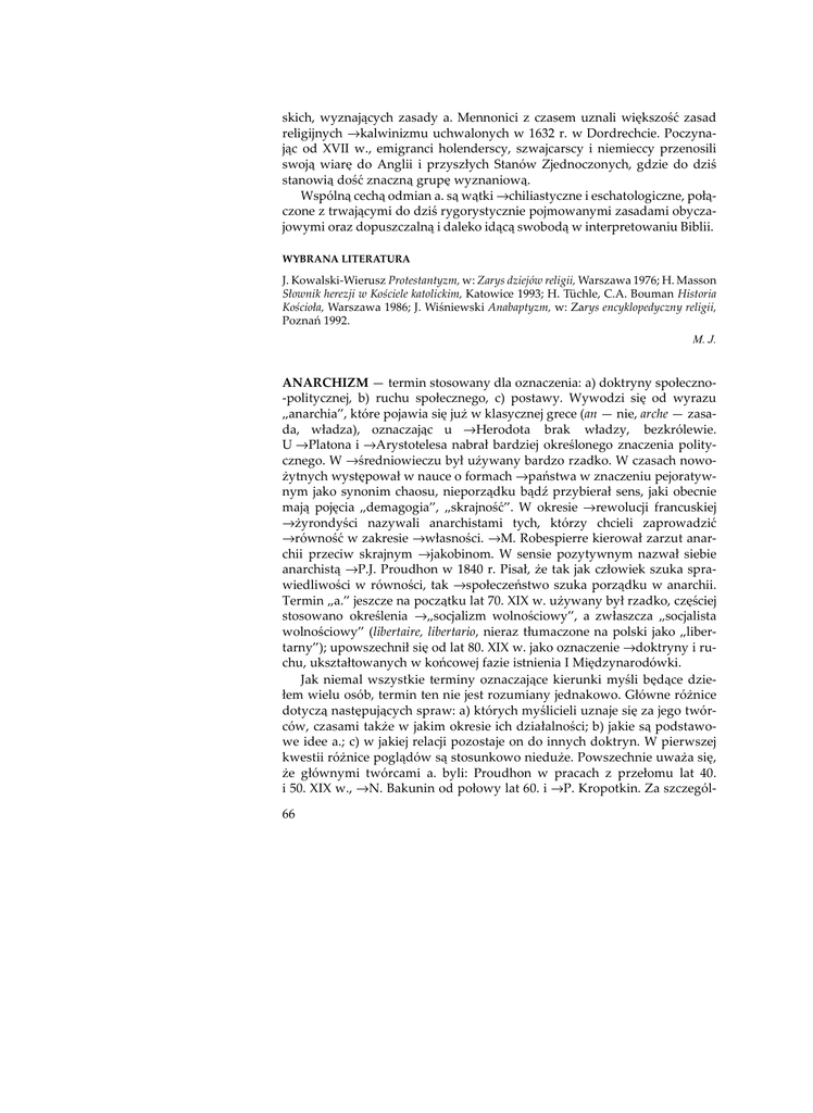 skich, wyznaja˛cych zasady a. Mennonici z czasem uznali wie˛kszość zasad religijnych →kalwinizmu uchwalonych w 1632 r. w Dordrechcie. Poczynaja˛c od XVII w., emigranci holenderscy, szwajcarscy i niemieccy przenosili swoja˛ wiare˛ do Anglii i przyszłych Stanów Zjednoczonych, gdzie do dziś stanowia˛ dość znaczna˛ grupe˛ wyznaniowa˛. Wspólna˛ cecha˛ odmian a. sa˛ wa˛tki →chiliastyczne i eschatologiczne, poła˛czone z trwaja˛cymi do dziś rygorystycznie pojmowanymi zasadami obyczajowymi oraz dopuszczalna˛ i daleko ida˛ca˛ swoboda˛ w interpretowaniu Biblii. WYBRANA LITERATURA J. Kowalski-Wierusz Protestantyzm, w: Zarys dziejów religii, Warszawa 1976; H. Masson Słownik herezji w Kościele katolickim, Katowice 1993; H. Tüchle, C.A. Bouman Historia Kościoła, Warszawa 1986; J. Wiśniewski Anabaptyzm, w: Zarys encyklopedyczny religii, Poznań 1992. M. J. ANARCHIZM — termin stosowany dla oznaczenia: a) doktryny społeczno-politycznej, b) ruchu społecznego, c) postawy. Wywodzi sie˛ od wyrazu „anarchia”, które pojawia sie˛ już w klasycznej grece (an — nie, arche — zasada, władza), oznaczaja˛c u →Herodota brak władzy, bezkrólewie. U →Platona i →Arystotelesa nabrał bardziej określonego znaczenia politycznego. W →średniowieczu był używany bardzo rzadko. W czasach nowożytnych wyste˛pował w nauce o formach →państwa w znaczeniu pejoratywnym jako synonim chaosu, nieporza˛dku ba˛dź przybierał sens, jaki obecnie maja˛ poje˛cia „demagogia”, „skrajność”. W okresie →rewolucji francuskiej →żyrondyści nazywali anarchistami tych, którzy chcieli zaprowadzić →równość w zakresie →własności. →M. Robespierre kierował zarzut anarchii przeciw skrajnym →jakobinom. W sensie pozytywnym nazwał siebie anarchista˛ →P.J. Proudhon w 1840 r. Pisał, że tak jak człowiek szuka sprawiedliwości w równości, tak →społeczeństwo szuka porza˛dku w anarchii. Termin „a.” jeszcze na pocza˛tku lat 70. XIX w. używany był rzadko, cze˛ściej stosowano określenia →„socjalizm wolnościowy”, a zwłaszcza „socjalista wolnościowy” (libertaire, libertario, nieraz tłumaczone na polski jako „libertarny”); upowszechnił sie˛ od lat 80. XIX w. jako oznaczenie →doktryny i ruchu, ukształtowanych w końcowej fazie istnienia I Mie˛dzynarodówki. Jak niemal wszystkie terminy oznaczaja˛ce kierunki myśli be˛da˛ce dziełem wielu osób, termin ten nie jest rozumiany jednakowo. Główne różnice dotycza˛ naste˛puja˛cych spraw: a) których myślicieli uznaje sie˛ za jego twórców, czasami także w jakim okresie ich działalności; b) jakie sa˛ podstawowe idee a.; c) w jakiej relacji pozostaje on do innych doktryn. W pierwszej kwestii różnice pogla˛dów sa˛ stosunkowo nieduże. Powszechnie uważa sie˛, że głównymi twórcami a. byli: Proudhon w pracach z przełomu lat 40. i 50. XIX w., →N. Bakunin od połowy lat 60. i →P. Kropotkin. Za szczegól66 nie aktywnych popularyzatorów i w pewnym stopniu współtwórców a. uważani sa˛ we Francji: E. Reclus, S. Faure, J. Grave; we Włoszech: C. Cafiero, A. Costa, L. Fabri, E. Malatesta, F.S. Merlino, w Szwajcarii J. Guillaume, w Niemczech G. Landauer, w Holandii F.D. Nieuwenhuis. W Rosji chrześcijański a. →L. Tołstoja można sytuować na obrzeżu tej doktryny. Jej podstawowe idee podzielał w pewnym okresie →E. Abramowski, choć sie˛ z nia˛ nie identyfikował. →W. Godwin jest uważany ba˛dź za pierwszego twórce˛, ba˛dź — cze˛ściej i zasadnie — za prekursora a. Cze˛sto przyjmuje sie˛, że prekursorem skrajnie indywidualistycznego pra˛du a. był →M. Stirner. Niekiedy poprzedników a. dopatruje sie˛ już w czasach antycznych i w średniowieczu; niektórzy widza˛ w nim ucieleśniaja˛ca˛ sie˛ w dziejach tendencje˛ do zniesienia wszelkiego panowania i ucisku, co spowodowałoby spontaniczny rozwój całkowicie nowych, wolnościowych form życia społecznego. Biora˛c pod uwage˛ przede wszystkim pogla˛dy wspomnianych autorów, a. można określić jako doktryne˛, która za najwyższa˛ wartość uważa →wolność każdej jednostki, niemożliwa˛ bez ekonomicznej równości, i zakłada, że naste˛pstwem urzeczywistnienia pełnej wolności be˛da˛ →sprawiedliwość i braterstwo. Całkowita wolność jednostek zostanie poła˛czona z harmonia˛ społeczna˛. Warunkiem ustanowienia pełnej wolności jest zniesienie władzy, tj. →państwa, kapitału i organizacji religijnych. W doktrynie a. najbardziej rozbudowana jest radykalna krytyka wszystkich form państwa — instytucji wykluczaja˛cej wolność i równość. Ze wzgle˛dów polemicznych anarchiści cze˛sto podkreślali, że również w →demokracji wyste˛puja˛ podstawowe negatywne właściwości państwa. Daje to niekiedy asumpt do przypisywania a. antydemokratycznego charakteru. Państwo jest niepotrzebne, aby funkcjonowało wszystko, co jest ważne w społeczeństwie. A. opiera sie˛ na optymistycznej wizji natury ludzkiej. Uwypukla wprawdzie takie jej negatywne skłonności, jak da˛żenie do utrwalenia posiadanej władzy i jej nadużywania oraz do posiadania przywilejów, ale zakłada, że znikna˛ one wraz ze zniesieniem państwa. Postulat likwidacji organizacji kościelnej szedł z reguły w parze z radykalna˛ krytyka˛ wierzeń religijnych. Wyja˛tkiem były tendencje odwołuja˛ce sie˛ także do religii (a. chrześcijański L. Tołstoja). Istotna˛ cecha˛ a. jest →internacjonalizm, jednak w pogla˛dach niektórych anarchistów wyste˛powały przejawy silnej ksenofobii, uprzedzeń narodowościowych. Podejmowano niekiedy (zwłaszcza Kropotkin) wysiłki filozoficznego uzasadnienia a., uczynienia go światopogla˛dem. W pracach poświe˛conych a. proponowano różne jego klasyfikacje. Najcze˛ściej wyróżniano a. indywidualistyczny, kolektywistyczny i komunistyczny. Określenia te moga˛ powodować nieporozumienia, ponieważ orientacja indywiduali