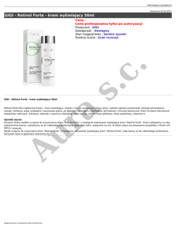 Informacje o produkcie Utworzono 02-03-2017 GIGI - Retinol Forte - krem wybielający 50ml Cena : Cena profesjonalna tylko po autoryzacji GIGI - Retinol Forte - krem wybielający 50ml s. c. Producent : GIGI Dostępność : Dostępny Stan magazynowy : bardzo wysoki Średnia ocena : brak recenzji a Retinol Forte Skin Lightening Cream - krem wybielający. Szybko i mocno wyrównuje koloryt skóry, wybiela ogniska przebarwień różnego pochodzenia: ostuda, melasma, piegi, pozapalne i pourazowe plamy, po głębokich zabiegach z peelingów, dermabrazji i chirurgii plastycznej. Krem na bazie naturalnych składników roślinnych. Arbutyna, ekstrakt z mącznicy lekarskiej, kwas kojowy, retinol, kwas glikolowy, kwas azalainowy, witamina E. Au r Sposób użycia: Oczyścić skórę mydłem w płynie do oczyszczenia skóry "Retinol Forte", a następnie zastosować wybielający krem "Retinol Forte". Krem nakłądamy na całą powierzchnie twarzy, zostawiamy aż do całkowitego wchłonięcia. Aplikować tylko i wyłącznie na noc. W dzień zaleca się stosowanie produktów z filtrem UV: SPF15 i powyżej. Mydło w płynie do czyszczenia skóry "Retinol Forte", a następnie zastosować wybielający krem "Retinol Forte" całej twarzy aż do całkowitego wchłonięcia. Korzystać tylko w godzinach wieczornych! Wygenerowano w programie www.oscGold.com