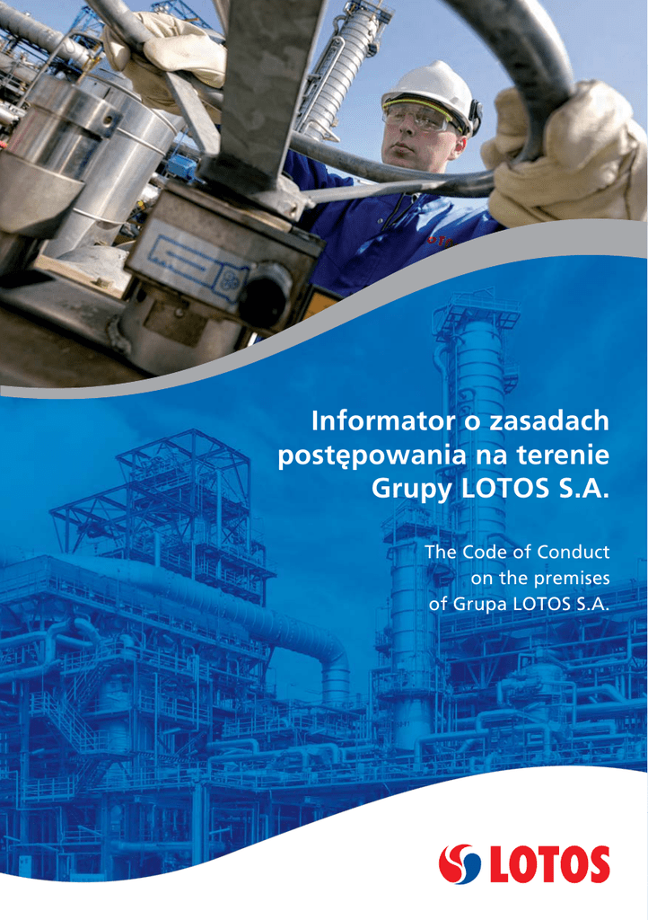 Informator o zasadach postępowania na terenie Grupy LOTOS S.A. The Code of Conduct on the premises of Grupa LOTOS S.A. Polski ............... 5 Informator opracowano w Biurze Bezpieczeństwa Pracy i Ochrony Zdrowia Zaakceptował Dyrektor ds. Rozwoju Technologii Wojciech Blew Zatwierdził Dyrektor ds. Produkcji i Rozwoju Marek Sokołowski Wydanie nr 7, czerwiec 2010 r. English ............... 57 The Code of Conduct has been developed by the Health and Safety Office Accepted by Technology Development & HSE Director Wojciech Blew Approved by Chief Operation Officer Marek Sokołowski Edition no. 7, June 2010 SPIS TREŚCI 1. WAŻNE NUMERY TELEFONÓW................................................................................................... 7 2. ZAGROŻENIA NA TERENIE GRUPY LOTOS ................................................................................ 8 3. SZKOLENIA ................................................................................................................................ 11 4. CZYNY ZABRONIONE ............................................................................................................... 11 4.1 Zakaz używania otwartego ognia i palenia tytoniu ..................................................... 11 4.2 Zakaz wnoszenia i spożywania alkoholu i środków odurzających ................................ 12 4.3 Zakaz fotografowania i filmowania ................................................................................ 12 4.4 Zakaz wnoszenia broni i narzędzi niebezpiecznych ...................................................... 12 4.5 Zakaz korzystania z telefonów komórkowych i innego elektronicznego sprzętu nadawczego......................................................................................................... 13 4.6 Zakaz przewożenia osób i urządzeń na nieprzystosowanych do transportu pojazdach .......................................................................................................................... 14 4.7 Zakaz blokowania dostępu do budynków, dróg i infrastruktury przeciwpożarowej ..... 14 4.8 Zakaz poruszania się w obszarze ochrony obwodowej ................................................. 15 5. ZASADY PORUSZANIA SIĘ ....................................................................................................... 15 5.1 Wejście na teren zakładu ................................................................................................ 15 5.2 Wjazd na teren i wyjazd z zakładu ................................................................................. 16 5.3 Przepływ składników majątkowych na terenie Grupy LOTOS ...................................... 17 5.4 Poruszanie się po terenie zakładu ................................................................................... 17 6. ORGANIZACJA ZAPLECZA, PLACU BUDOWY I ROBÓT ............................................................ 20 7. ZASADY PRZEWOZU, SKŁADOWANIA, NAPEŁNIANIA ZBIORNIKÓW POJAZDÓW, MASZYN PALIWEM Z POJEMNIKÓW ........................................................................................ 22 7.1 Przewóz paliw w pojemnikach ........................................................................................ 23 7.2 Magazynowanie paliw w pojemnikach .......................................................................... 23 7.3 Napełnianie zbiornika pojazdu lub maszyny paliwem z pojemników .......................... 23 8. BEZPIECZEŃSTWO WYKONYWANIA PRAC .............................................................................. 24 8.1 Środki ochrony indywidualnej i odzież ochronna .......................................................... 24 8.2 Niebezpieczne substancje i preparaty chemiczne ......................................................... 26 8.3 Pisemne zezwolenia ......................................................................................................... 27 8.4 Prace w przestrzeniach zamkniętych .............................................................................. 29 8.5 Prace na wysokości ........................................................................................................... 31 8.6 Prace ziemne ..................................................................................................................... 36 8.7 Prace pożarowo niebezpieczne ....................................................................................... 38 8.8 Maszyny i urządzenia techniczne .................................................................................... 41 8.9 Elektryczność ..................................................................................................................... 41 8.10 Ochrona radiologiczna .................................................................................................... 42 9. OCHRONA PRZECIWPOŻAROWA ............................................................................................. 44 9.1 Alarm chemiczny............................................................................................................... 45 9.2 Punkty zborne i wiatrowskazy ......................................................................................... 47 9.3 Postępowanie w sytuacjach awaryjnych ......................................................................... 47 9.4 Ćwiczenia .......................................................................................................................... 49 9.5 Ewakuacja z budynków i pomieszczeń ........................................................................... 50 10. ZDARZENIA NIEBEZPIECZNE...................................................................................................... 51 11. BEZPIECZEŃSTWO FIZYCZNE .................................................................................................... 52 12. OCHRONA ŚRODOWISKA ..................................................................