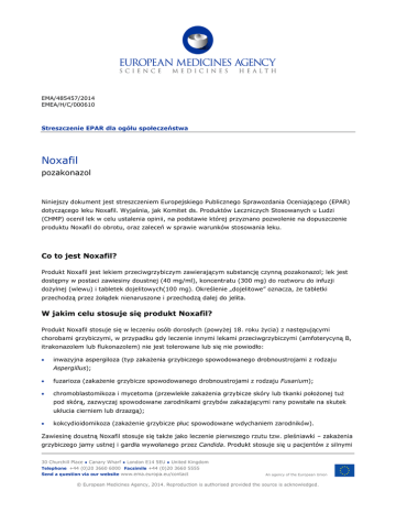EMA/485457/2014 EMEA/H/C/000610 Streszczenie EPAR dla ogółu społeczeństwa Noxafil pozakonazol Niniejszy dokument jest streszczeniem Europejskiego Publicznego Sprawozdania Oceniającego (EPAR) dotyczącego leku Noxafil. Wyjaśnia, jak Komitet ds. Produktów Leczniczych Stosowanych u Ludzi (CHMP) ocenił lek w celu ustalenia opinii, na podstawie której przyznano pozwolenie na dopuszczenie produktu Noxafil do obrotu, oraz zaleceń w sprawie warunków stosowania leku. Co to jest Noxafil? Produkt Noxafil jest lekiem przeciwgrzybiczym zawierającym substancję czynną pozakonazol; lek jest dostępny w postaci zawiesiny doustnej (40 mg/ml), koncentratu (300 mg) do roztworu do infuzji dożylnej (wlewu) i tabletek dojelitowych(100 mg). Określenie „dojelitowe” oznacza, że tabletki przechodzą przez żołądek nienaruszone i przechodzą dalej do jelita. W jakim celu stosuje się produkt Noxafil? Produkt Noxafil stosuje się w leczeniu osób dorosłych (powyżej 18. roku życia) z następującymi chorobami grzybiczymi, w przypadku gdy leczenie innymi lekami przeciwgrzybiczymi (amfoterycyną B, itrakonazolem lub flukonazolem) nie jest tolerowane lub się nie powiodło: • inwazyjna aspergiloza (typ zakażenia grzybiczego spowodowanego drobnoustrojami z rodzaju Aspergillus); • fuzarioza (zakażenie grzybicze spowodowanego drobnoustrojami z rodzaju Fusarium); • chromoblastomikoza i mycetoma (przewlekłe zakażenia grzybicze skóry lub tkanki położonej tuż pod skórą, zazwyczaj spowodowane zarodnikami grzybów zakażającymi rany powstałe na skutek ukłucia cierniem lub drzazgą); • kokcydioidomikoza (zakażenie grzybicze płuc spowodowane wdychaniem zarodników). Zawiesinę doustną Noxafil stosuje się także jako leczenie pierwszego rzutu tzw. pleśniawki – zakażenia grzybiczego jamy ustnej i gardła wywołanego przez Candida. Produkt stosuje się u pacjentów z silnymi 30 Churchill Place ● Canary Wharf ● London E14 5EU ● United Kingdom Telephone +44 (0)20 3660 6000 Facsimile +44 (0)20 3660 5555 Send a question via our website www.ema.europa.eu/contact An agency of the European Union © European Medicines Agency, 2014. Reproduction is authorised provided the source is acknowledged. objawami zakażenia lub u pacjentów z osłabionym układem odpornościowym, w przypadku gdy istnieje małe prawdopodobieństwo, że leki stosowane zewnętrznie (bezpośrednio na pleśniawkę) będą skuteczne. Zawiesinę doustną, roztwór do infuzji i tabletki dojelitowe Noxafil stosuje się także w celu zapobiegania występowaniu inwazyjnych zakażeń grzybiczych u pacjentów z układem odpornościowym osłabionym z powodu leczenia nowotworu krwi lub szpiku kostnego lub leków stosowanych przy przeszczepie komórek pnia układu krwiotwórczego (przeszczep komórek wytwarzających krwinki). Lek wydaje się wyłącznie z przepisu lekarza. Jak stosować produkt Noxafil? Leczenie produktem Noxafil powinien rozpoczynać lekarz mający doświadczenie w leczeniu zakażeń grzybiczych lub w leczeniu pacjentów z grupy wysokiego ryzyka inwazyjnych zakażeń grzybiczych. Zawiesina doustna i tabletki Noxafil różnią się systemem dawkowania i nie powinny być stosowane wymiennie. • Tabletki Noxafil można przyjmować z posiłkiem lub bez posiłku oraz należy połykać w całości, popijając wodą; nie należy ich rozgniatać, żuć, przełamywać ani rozpuszczać. • Zawiesinę doustną Noxafil przyjmuje się z posiłkiem lub suplementem żywieniowym; zawiesinę należy dobrze wstrząsnąć przed użyciem. W leczeniu zakażeń grzybiczych z wyjątkiem kandydozy zawiesinę doustną Noxafil podaje się w dawce 400 mg (10 ml) dwa razy na dobę lub 200 mg (5 ml) cztery razy na dobę u pacjentów, którzy nie są w stanie przyjmować pokarmów. Czas trwania leczenia zależy od stopnia ciężkości choroby oraz odpowiedzi pacjenta na leczenie. W przypadku kandydozy jamy ustnej zawiesinę doustną Noxafil podaje się w dawce 200 mg (5 ml) w pierwszym dniu, a następnie 100 mg (2,5 ml) raz na dobę przez kolejne 13 dni. W celu zapobiegania inwazyjnym zakażeniom grzybiczym zawiesinę doustną Noxafil podaje się w dawce 200 mg (5 ml) trzy razy na dobę. Czas trwania leczenia zależy od stanu pacjenta. W celu leczenia zakażeń grzybiczych i zapobiegania im zalecana dawka produktu Noxafil w tabletkach lub roztworze do infuzji wynosi 300 mg dwa razy na dobę pierwszego dnia, a następnie 300 mg raz na dobę; czas leczenia zależy od stopnia nasilenia choroby i odpowiedzi pacjenta na leczenie. Produktu Noxafil w tabletkach i roztworze do infuzji nie wolno stosować do leczenia pleśniawki. Pacjenci, którzy przyjmują roztwór do infuzji, powinni przestawić się na produkt Noxafil w tabletkach lub zawiesinie doustnej, jak tylko stan pacjenta na to pozwoli. Więcej informacji znajduje się w ulotce informacyjnej. Jak działa produkt Noxafil? Substancja czynna produktu Noxafil, pozakonazol, jest lekiem przeciwgrzybiczym z grupy triazoli. Działanie tej substancji polega na zapobieganiu powstawaniu ergosterolu, który jest ważnym elementem ściany komórkowej grzybów. Bez ergosterolu grzyb ginie lub nie może się rozprzestrzeniać. Wykaz grzybów, przeciwko którym produkt Noxafil wykazuje aktywność, znajduje się w charakterystyce produktu leczniczego (także część EPAR). Noxafil EMA/485457/2014 Strona 2/4 Jak badano produkt Noxafil? W jednym badaniu głównym zawiesinę doustną Noxafil badano u 238 pacjentów z inwazyjnymi zakażeniami grzybiczymi, u których nie wystąpiła odpowiedź na standardowe leczenie przeciwgrzybicze. Badaniem objęto 107 pacjentów z aspergilozą, 18 pacjentów z fuzariozą, 11 z chromoblastomikozą lub mycetomą, a także 16 z kokcydioidomikozą. Wyniki leczenia produktem Noxafil porównywano z wynikami uzyskanymi u 218 pacjentów, którzy byli leczeni innymi lekami przeciwgrzybiczymi. W innym badaniu głównym z udziałem 350 pacjentów zarażonych wirusem HIV z ka