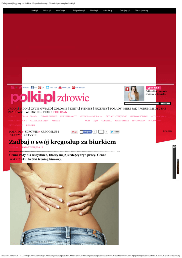 Zadbaj o swój kręgosłup za biurkiem -Kręgosłup i stawy - Zdrowie i psychologia - Polki.pl JA Polki.pl FORUM FB Wizaz.pl G+ We-Dwoje.pl TWITTER YOUTUBE Babyonline.pl Niania.pl AfterParty.pl Gotujmy.pl Ciasta przepisy Typ redakcji PINTEREST Pobierz listę badań do zrobienia w tym roku! zdrowie Szukaj URODA MODA ŻYCIE GWIAZD ZDROWIE DIETA FITNESS PRZEPISY PORADY WIESZ JAK FORUM MEDYCZNE PLACÓWKI WE DWOJE VIDEO POLECAMY CHOROBY PORADY LEKARZA OBLICZ DNI PŁODNE Z ŻYCIA WZIĘTE ZDROWE DZIECKO KALKULATOR CIĄŻY ALERGIA LEKI I PREPARATY MEDYCYNA NATURALNA KRĘGOSŁUP I STAWY OCZY ZĘBY GRYPA I PRZEZIĘBIENIE CUKRZYCA ZDROWE SERCE CHOROBY KOBIECE PSYCHOLOGIA ANTYKONCEPCJA PSYCHOTESTY BIORYTM POLKI.PL ZDROWIE STAWY ARTYKUŁ KRĘGOSŁUP I Lubię to! 3 0 Tweet REKLAMA Zadbaj o swój kręgosłup za biurkiem SPOSOBY NA ZDROWY KRĘGOSŁUP Cenne rady dla wszystkich, którzy mają siedzący tryb pracy. Cenne wskazówki i krótki trening biurowy. file:///D|/...oktorek/HTML/Zadbaj%20o%20sw%F3j%20kr%EAgos%B3up%20za%20biurkiem%20-Kr%EAgos%B3up%20i%20stawy%20-%20Zdrowie%20i%20psychologia%20-%20Polki.pl.html[2015-04-23 13:36:38] Zadbaj o swój kręgosłup za biurkiem -Kręgosłup i stawy - Zdrowie i psychologia - Polki.pl fot. Panthermedia Choć co czwarty Polak boi się chorób kręgosłupa, obawa ta nie przekłada się na właściwe traktowanie osi i podpory naszego ciała. Od najmłodszych lat dźwigamy ciężary w postaci szkolnych plecaków, spędzamy od kilku do kilkunastu godzin w pozycji siedzącej i unikamy aktywności fizycznej. W konsekwencji większość z nas nie tylko ma wady postawy, ale także odczuwa związane z nimi dolegliwości bólowe. Co robić, aby mimo kilkunastogodzinnej nieraz pracy za biurkiem utrzymać kręgosłup w jak najlepszej kondycji? Porad udziela dr Adrian Rymarczyk, ortopeda i traumatolog z Centrum Medycznego ENEL-MED, Kierownik Medyczny Szpitala Centrum. Zmiany cywilizacyjne i społeczne wpływają na wzrost zatrudnienia w sektorze usługowym – powszechna staje się więc siedząca, biurowa praca i coraz więcej z nas skarży się na problemy z kręgosłupem. Badania dotyczące ergonomii miejsc pracy jednoznacznie pokazują, że prawidłowe stanowiska pracy stanowią zdecydowaną mniejszość w polskich firmach. Z tego powodu schorzenia kręgosłupa, urazy i inne choroby układu ruchu dawno wyparły typowe choroby zawodowe, będące konsekwencją pracy fizycznej (np. w górnictwie, metalurgii czy przemyśle). Zachowaniu odpowiedniej postawy nie pomaga także nasz tryb życia „po godzinach”, czyli brak ruchu. Jak pokazują wyniki badania przeprowadzonego przez TNS OBOP na zlecenie Centrum Medycznego ENEL-MED wśród aktywnych zawodowo mieszkańców największych polskich miast (Warszawy, Krakowa, Łodzi, Wrocławia i Poznania), aż 16 proc. nie uprawia żadnego sportu, kolejne 14 proc. uprawia go nie częściej niż raz na 2-3 miesiące. Zaledwie 1/3 badanych rusza się codziennie lub kilka razy w tygodniu. Wszystko to przekłada się na zapotrzebowanie na opiekę medyczną – wizyty ortopedyczne są w pierwszej dziesiątce najczęściej wybieranych płatnych usług medycznych. Na siedząco – ani wygodnie, ani zdrowo Pozycja siedząca nie jest dla człowieka pozycją naturalną i – co się z tym bezpośrednio wiąże – nie może być zdrowa dla kręgosłupa. Tymczasem szkodzimy sobie dodatkowo, siedząc w nieprawidłowy sposób na niewygodnym siedzisku. Zła pozycja siedząca (zgarbione plecy, niedostateczne podparcie lędźwiowej części kręgosłupa) skutkuje napięciem i obciążeniem kręgosłupa, karku i mięśni ramion, ale także wpływa niekorzystnie na układ trawienny i hamuje pełny oddech, przez co powoduje redukcję zapasów tlenu w krwioobiegu. Prowadzi to do ogólnego zmęczenia nie tylko ciała, ale i umysłu. Ogromne znaczenie ma także ułożenie rąk – opieranie się łokciem o blat biurka powoduje ucisk na nerw łokciowy Z życia wzięte i drętwienie palców, z kolei opieranie się nadgarstkiem może powodować tzw. zespół cieśni nadgarstka. Dlatego aby Za szybko się poddaliśmy... OPOWIADANIA Z ŻYCIA WZIĘTE PRAWDZIWE HISTORIE MIŁOSNE sobie nie szkodzić, należy pamiętać o kilku elementach. Pierwszym z nich są proste plecy, ale nie w pozycji pionowej, tylko podczas podpierania się o blat – dzięki temu siedzimy pod katem 20-30 stopni i nasze mięśnie grzbietu są odciążone (podparcie na kończynach górnych zdejmuje z pleców obciążenie). To tzw. proste plecy z zachowaniem naturalnych krzywizn – trzeba pamiętać, że pozycja ta wyklucza korzystania z oparcia krzesła. Niemniej ważne są odpowiednia pozycja głowy, która nie powinna się przechylać w żadną stronę, ustawienie Nie znają prawdy OPOWIADANIA Z ŻYCIA WZIĘTE PRAWDZIWE HISTORIE monitora komputera na wysokości oczu oraz dbałość o higienę kręgosłupa – krótkie, regularne przerwy w pracy czy gimnastyka. Jak prawidłowo siedzieć przy biurku, czytaj dalej... Lubię to! 3 Musiałam ustąpić OPOWIADANIA Z ŻYCIA WZIĘTE PRAWDZIWE HISTORIE materiały prasowe 0 1 2 Oceń artykuł głosy 2 Wyślij znajomym Nasza miłość zniszczyła jej życie... Drukuj OPOWIADANIA Z ŻYCIA WZIĘTE PRAWDZIWE HISTORIE Redakcja poleca Znajdź nas na Facebooku Polki.pl Lubię to! Polki.pl 3 godz. Jesteście ciekawe, co wydarzy się w nadchodzącym tygodniu? Zapraszamy do poznawania waszej przyszłości #polkipl | #horoskop | file:///D|/...oktorek/HTML/Zadbaj%20o%20sw%F3j%20kr%EAgos%B3up%20za%20biurkiem%20-Kr%EAgos%B3up%20i%20stawy%20-%20Zdrowie%20i%20psychologia%20-%20Polki.pl.html[2015-04-23 13:36:38] Zadbaj o swój kręgosłup za biurkiem -Kręgosłup i stawy - Zdrowie i psychologia - Polki.pl #horoskoptygodniowy Redakcja poleca 76 365 osób lubi obiekt Polki.pl. Ulga dla kręgosłupa Na ratunek kręgosłupowi Bóle pleców, krzyża czy szyi to jedne z częściej zgłaszanych... Wystarczy jeden nagły ruch i czujesz w plecach ostry ból. To... Wtyczka sp