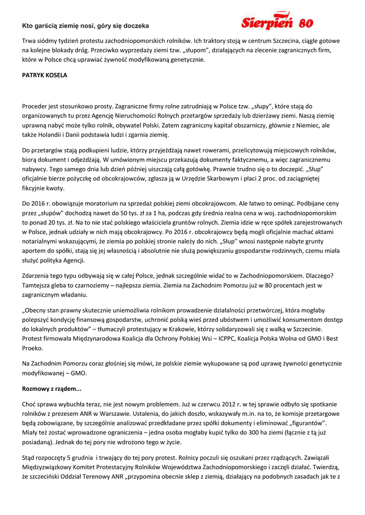 Kto garścią ziemię nosi, góry się doczeka Trwa siódmy tydzień protestu zachodniopomorskich rolników. Ich traktory stoją w centrum Szczecina, ciągle gotowe na kolejne blokady dróg. Przeciwko wyprzedaży ziemi tzw. „słupom”, działających na zlecenie zagranicznych firm, które w Polsce chcą uprawiać żywność modyfikowaną genetycznie. PATRYK KOSELA Proceder jest stosunkowo prosty. Zagraniczne firmy rolne zatrudniają w Polsce tzw. „słupy”, które stają do organizowanych tu przez Agencję Nieruchomości Rolnych przetargów sprzedaży lub dzierżawy ziemi. Naszą ziemię uprawną nabyć może tylko rolnik, obywatel Polski. Zatem zagraniczny kapitał obszarniczy, głównie z Niemiec, ale także Holandii i Danii podstawia ludzi i zgarnia ziemię. Do przetargów stają podkupieni ludzie, którzy przyjeżdżają nawet rowerami, przelicytowują miejscowych rolników, biorą dokument i odjeżdżają. W umówionym miejscu przekazują dokumenty faktycznemu, a więc zagranicznemu nabywcy. Tego samego dnia lub dzień później uiszczają całą gotówkę. Prawnie trudno się o to doczepić. „Słup” oficjalnie bierze pożyczkę od obcokrajowców, zgłasza ją w Urzędzie Skarbowym i płaci 2 proc. od zaciągniętej fikcyjnie kwoty. Do 2016 r. obowiązuje moratorium na sprzedaż polskiej ziemi obcokrajowcom. Ale łatwo to ominąć. Podbijane ceny przez „słupów” dochodzą nawet do 50 tys. zł za 1 ha, podczas gdy średnia realna cena w woj. zachodniopomorskim to ponad 20 tys. zł. Na to nie stać polskiego właściciela gruntów rolnych. Ziemia idzie w ręce spółek zarejestrowanych w Polsce, jednak udziały w nich mają obcokrajowcy. Po 2016 r. obcokrajowcy będą mogli oficjalnie machać aktami notarialnymi wskazującymi, że ziemia po polskiej stronie należy do nich. „Słup” wnosi następnie nabyte grunty aportem do spółki, stają się jej własnością i absolutnie nie służą powiększaniu gospodarstw rodzinnych, czemu miała służyć polityka Agencji. Zdarzenia tego typu odbywają się w całej Polsce, jednak szczególnie widać to w Zachodniopomorskiem. Dlaczego? Tamtejsza gleba to czarnoziemy – najlepsza ziemia. Ziemia na Zachodnim Pomorzu już w 80 procentach jest w zagranicznym władaniu. „Obecny stan prawny skutecznie uniemożliwia rolnikom prowadzenie działalności przetwórczej, która mogłaby polepszyć kondycję finansową gospodarstw, uchronić polską wieś przed ubóstwem i umożliwić konsumentom dostęp do lokalnych produktów” – tłumaczyli protestujący w Krakowie, którzy solidaryzowali się z walką w Szczecinie. Protest firmowała Międzynarodowa Koalicja dla Ochrony Polskiej Wsi – ICPPC, Koalicja Polska Wolna od GMO i Best Proeko. Na Zachodnim Pomorzu coraz głośniej się mówi, że polskie ziemie wykupowane są pod uprawę żywności genetycznie modyfikowanej – GMO. Rozmowy z rządem... Choć sprawa wybuchła teraz, nie jest nowym problemem. Już w czerwcu 2012 r. w tej sprawie odbyło się spotkanie rolników z prezesem ANR w Warszawie. Ustalenia, do jakich doszło, wskazywały m.in. na to, że komisje przetargowe będą zobowiązane, by szczególnie analizować przedkładane przez spółki dokumenty i eliminować „figurantów”. Miały też zostać wprowadzone ograniczenia – jedna osoba mogłaby kupić tylko do 300 ha ziemi (łącznie z tą już posiadaną). Jednak do tej pory nie wdrożono tego w życie. Stąd rozpoczęty 5 grudnia i trwający do tej pory protest. Rolnicy poczuli się oszukani przez rządzących. Zawiązali Międzyzwiązkowy Komitet Protestacyjny Rolników Województwa Zachodniopomorskiego i zaczęli działać. Twierdzą, że szczeciński Oddział Terenowy ANR „przypomina obecnie sklep z ziemią, działający na podobnych zasadach jak te z obuwiem”. Swoje zastrzeżenia ma Agencja Bezpieczeństwa Wewnętrznego, jednak żadne śledztwo w sprawie nieuczciwych praktyk w ANR nie zostało wszczęte. Zdesperowani rolnicy od 5 grudnia non stop pikietują przed szczecińskim oddziałem ANR. Blokowali ulice miasta, a także drogi wojewódzkie. Przed budynkiem chcieli wylać gnojówkę, jednak beczkowóz zatrzymała policja. Na proteście spędzili święta Bożego Narodzenia, Sylwestra i Nowy Rok. Po tym, gdy sformułowali zarzuty, że przetargi na sprzedaż ziemi, które organizowała szczecińska Agencja, były przeprowadzane niezgodnie z prawem, dyrektor oddziału, Adam Poniewski, zażądał przeprosin od liderów Międzyzwiązkowego Komitetu Protestacyjnego. Zagroził skierowanie pozwu do sądu. Na niepokoje zareagował minister rolnictwa i rozwoju wsi, Stanisław Kalemba. Jeszcze w grudniu zapowiedział przygotowanie propozycji rozwiązań prawnych i organizacyjnych dotyczących eliminowania nieprawidłowości polegających przede wszystkim na występowaniu tzw. słupów w przetargach. – W województwie zachodniopomorskim od kilkunastu lat znaczna część gruntów jest w gospodarowaniu spółek i podmiotów z udziałem kapitału zagranicznego. To ma miejsce i nie ulega wątpliwości – przyznał Kalemba. – Skala tego jest dosyć duża i zgadzam się, że polscy rolnicy powinni mieć możliwość w pierwszej kolejności powiększenia swoich gospodarstw. Jego propozycje protestujący określili jako „bleblanie” bez konkretów i rozwiązań. Rolnicy mają swoje wizje znalezienia drogi wyjścia z problemu. Gdy minister na spotkaniu z rolnikami w Szczecinie wygłaszał monolog (m.in. na temat eksportu żywności na rynek unijny, 200 ton nadwyżki produkcji mięsa wołowego i świetnej kondycji mleczarni!) – ci buczeli. Niektórzy wychodzili z sali. Co ciekawe, rolniczy opór poparł szef PSL w powiecie słupskim. Protestujący nie wierzą i nie ufają jednak politykom. – Apeluję do rolników, nie wierzcie ślepo w obietnice polityków, którzy nas stale łudzą obietnicą bez pokrycia – zaapelował Artur Mackiewicz z Rady Krajowej NSZZ Rolników Indywidualnych ,,Solidarność'”. 