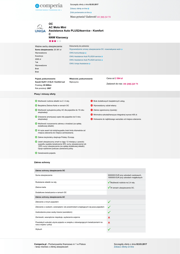 Szczegóły oferty z dnia 02.03.2017 Zobacz ofertę on-line Zrób porównanie on-line Masz pytania? Zadzwoń! 22 395 52 72 OC AC Moto Mini Assistance Auto PLUS24service - Komfort C NNW Kierowcy Ważne cechy ubezpieczenia: Dokumenty do pobrania: Suma ubezpieczenia: 20 381 zł Wypowiedzenie umowy ubezpieczenia OC- nowonabywca wzór Wprowadzona OWU komunikacja Kosztorys OWU Assistance Auto PLUS24 service 2000 zł OWU Assistance Auto PLUS24 service Tak Wprowadzona OWU Uniqa Assistance Brak Brak Pojazd, podsumowanie: Właściciel, podsumowanie: Suzuki Swift 1.5 GLX / Comfort aut Mężczyzna Cena od 2 564 zł Zadzwoń do nas: 22 395 52 71 Przebieg: 65 000km Rok produkcji: 2007 Plusy i minusy oferty Możliwość rozbicia składki na 2 i 4 raty. Brak dodatkowych bezpłatnnych usług. Bezpłatna Zielona Karta w ramach OC Wprowadzony udział własny Możliwość wykupienia polisy AC dla pojazdów do 15 roku eksploatacji Zakres ograniczony (żywioły) Minimalna szkoda(franszyza integralna) wynosi 400 zł. Zniesienie amortyzacji części dla pojazdów do 5 roku eksploatacji Holowanie do najbliższego warsztatu od miejsca zdarzenia. Możliwość rozszerzenia zakresu o kradzież (za opłatą dodatkowej składki) W razie awarii lub kolizji/wypadku brak limitu kilometrów od miejsca zdarzenia do miejsca zamieszkania. Zakres terytorialny obejmuje Polskę i Europę. Jeżeli ubezpieczony zmarł w ciągu 12 miesięcy z powodu wypadku wypłata świadczenia 50% sumy ubezpieczenia lub 100% sumy ubezpieczenia (za opłatą dodatkowej składki). Opcje wybierane podczas zawierania polisy Garażowanie pojazdu Zakres ochrony Zakres ochrony ubezpieczenia OC Suma ubezpieczenia 5000000 EUR przy szkodach osobowych, 1000000 EUR przy szkodach majątkowych Rozłożenie składki na raty Możliwość rozbicia na 2,4 raty. Zielona karta W ramach ubezpieczenia OC. Dodatkowe świadczenia w ramach OC Zakres ochrony ubezpieczenia AC Zderzenie z innym pojazdem Zderzenie z osobami, zwierzętami, lub przedmiotami znajdującymi się poza pojazdem Uszkodzenie przez osoby trzecie (wandalizm) Zamieszki, wewnętrzne niepokoje, wydarzenia wojenne Powstałych wskutek użycia pojazdu w związku z obowiązującymi świadczeniami na rzecz wojska i policji Wybuch Comperia.pl - Porównywarka finansowa nr 1 w Polsce - teraz również z ofertą ubezpieczeń Szczegóły oferty z dnia 02.03.2017 Zobacz ofertę on-line Szczegóły oferty z dnia 02.03.2017 Zobacz ofertę on-line Zrób porównanie on-line Masz pytania? Zadzwoń! 22 395 52 72 Nagłe działanie czynnika termicznego lub chemicznego pochodzącego z zewnątrz pojazdu Powódź Lawina Osunięcie i zapadanie się ziemi Grad Uderzenie pioruna Huragan Trzęsienie ziemi Kradzież pojazdu Tylko w zakresie pełnym. Rabunek/Rozbój Tylko w zakresie pełnym. Upadek statku powietrznego Pożar Zakres ochrony Assistance Suma ubezpieczenia Brak. Zakres terytorialny Polska i Europa. Wiek pojazdu do którego można wykupić ubezpieczenie W razie awarii do 10 lat, w razie wypadku do 15 lat. Rodzaj pojazdu na który można wykupić ubezpieczenie Osobowe, dostawcze i ciężarowe. Ograniczenia ze względu na sposób użytkowania pojazdu (np. taxi, nauka jazdy, rent a car) W przypadku samochodów ciężarowych o DMC powyżej 3,5t. przysługuje tylko pomoc informacyjna, wyłączone są pojazdy taxi, nauki jazdy, rent a car. Opcje zawarcia Jako rozszerzenie wariantu Standard i Komfort. Z AC. Usprawnienie pojazdu na miejscu zdarzenia Tak, do 100 EUR (z wyjątkiem aut o DMC ponad 3,5t. Pomoc w razie awarii Tak, do 100 EUR (z wyjątkiem aut o DMC ponad 3,5t). Pomoc w razie wypadku Tak, do 100 EUR (z wyjątkiem aut o DMC ponad 3,5t. Limit odległości od miejsca zamieszkania Brak limitu. Miejsce holowania Dla zdarzeń w Polsce do najbliższego warsztatu lub miejsca zamieszkania (limit 100 EUR), dla zdarzeń za granicą do najbliższego warsztatu lub do miejsca zamieszkania w Polsce do 1000 EUR (pod warunkiem, że szkoda nie przekracza 50 proc. wartości auta). Samochód zastępczy Tylko na terenie Polski; w wariancie B1 do 5 dni w razie wypadku i kradzieży i do 3 dni w razie awarii; w wariancie B2 do do 7 dni w razie wypadku i kradzieży i do 3 dni w razie awarii. Złomowanie pojazdu Parkowanie pojazdu Tak, do 3 dni (limit 60 EUR). Transport zastępczy/przewóz osób Tak, w przypadku unieruchomienia pojazdu na ponad 12 godzin w odległości powyżej 50 km od miejsca zamieszkania w Polsce i za granicą. Nocleg/zakwaterowanie Tak, do 3 dób (limit 60 EUR za osobę na dobę). Dodatkowe informacje Zgodnie z wariantem Standard + Komfort A + Komfort B, informacja i pomoc medyczna, transport medyczny, przewóz dzieci, kierowca zastępczy, tylko na terenie Polski. Comperia.pl - Porównywarka finansowa nr 1 w Polsce - teraz również z ofertą ubezpieczeń Szczegóły oferty z dnia 02.03.2017 Zobacz ofertę on-line Szczegóły oferty z dnia 02.03.2017 Zobacz ofertę on-line Zrób porównanie on-line Masz pytania? Zadzwoń! 22 395 52 72 Zakres ochrony NNW Suma ubezpieczenia 20000 zł Wypłata świadczenia w razie śmierci Za opłatą dodatkowej składki w razie zgonu w ciągu 365 dni licząc od daty nieszczęśliwego wypadku w wysokości (do wyboru przy zawieraniu umowy): a) 50 proc. sumy ubezpieczenia lub b) 100 proc. sumy ubezpieczenia. Wsiadanie i wysiadanie z pojazdu Załadowanie lub wyładowanie pojazdu Pożar, wybuch pojazdu Zatrzymanie, postój, naprawa pojazdu Podwójne świadczenie w przypadku 90% trwałego uszczerbku na zdrowiu Garażowanie pojazdu Terytorium ochrony Terytorium ochrony ubezpieczenia AC Kraje Unii Europejskiej Algeria Albania Libia Maroko Mołdawia Białoruś Tak, z wyłączeniami (możliwość rozszerzenia). Rosja (część europejska) Tak, z wyłączeniami (możliwość rozszerzenia). Czarnogóra Serbia Bośnia i Hercegowina Tunezja Iran Turcja Izrael Ukraina Tak, z wyłączeniami (możliwość rozszerzenia). Wyłączenia Wyłączenia ubezpieczenia AC Udział własny w szkodzie Wprowadzony. Możli