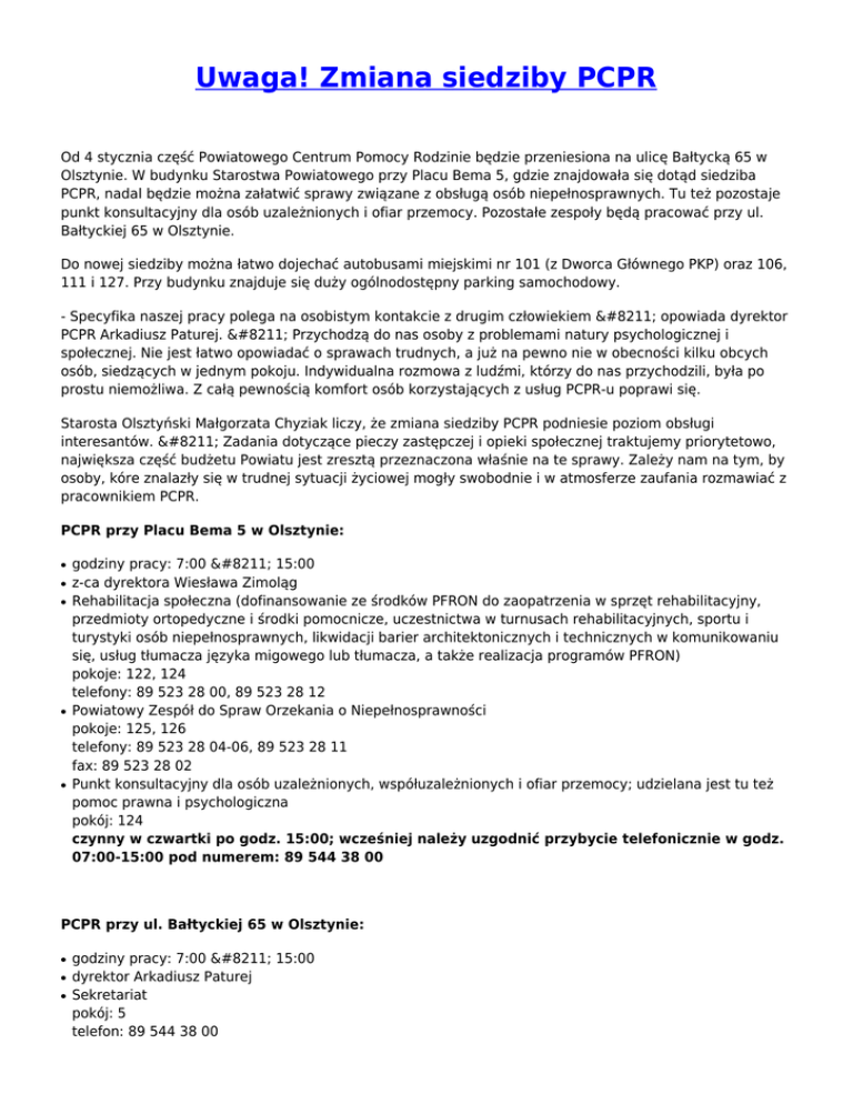 Uwaga! Zmiana siedziby PCPR Od 4 stycznia część Powiatowego Centrum Pomocy Rodzinie będzie przeniesiona na ulicę Bałtycką 65 w Olsztynie. W budynku Starostwa Powiatowego przy Placu Bema 5, gdzie znajdowała się dotąd siedziba PCPR, nadal będzie można załatwić sprawy związane z obsługą osób niepełnosprawnych. Tu też pozostaje punkt konsultacyjny dla osób uzależnionych i ofiar przemocy. Pozostałe zespoły będą pracować przy ul. Bałtyckiej 65 w Olsztynie. Do nowej siedziby można łatwo dojechać autobusami miejskimi nr 101 (z Dworca Głównego PKP) oraz 106, 111 i 127. Przy budynku znajduje się duży ogólnodostępny parking samochodowy. - Specyfika naszej pracy polega na osobistym kontakcie z drugim człowiekiem – opowiada dyrektor PCPR Arkadiusz Paturej. – Przychodzą do nas osoby z problemami natury psychologicznej i społecznej. Nie jest łatwo opowiadać o sprawach trudnych, a już na pewno nie w obecności kilku obcych osób, siedzących w jednym pokoju. Indywidualna rozmowa z ludźmi, którzy do nas przychodzili, była po prostu niemożliwa. Z całą pewnością komfort osób korzystających z usług PCPR-u poprawi się. Starosta Olsztyński Małgorzata Chyziak liczy, że zmiana siedziby PCPR podniesie poziom obsługi interesantów. – Zadania dotyczące pieczy zastępczej i opieki społecznej traktujemy priorytetowo, największa część budżetu Powiatu jest zresztą przeznaczona właśnie na te sprawy. Zależy nam na tym, by osoby, kóre znalazły się w trudnej sytuacji życiowej mogły swobodnie i w atmosferze zaufania rozmawiać z pracownikiem PCPR. PCPR przy Placu Bema 5 w Olsztynie: ● ● ● ● ● godziny pracy: 7:00 – 15:00 z-ca dyrektora Wiesława Zimoląg Rehabilitacja społeczna (dofinansowanie ze środków PFRON do zaopatrzenia w sprzęt rehabilitacyjny, przedmioty ortopedyczne i środki pomocnicze, uczestnictwa w turnusach rehabilitacyjnych, sportu i turystyki osób niepełnosprawnych, likwidacji barier architektonicznych i technicznych w komunikowaniu się, usług tłumacza języka migowego lub tłumacza, a także realizacja programów PFRON) pokoje: 122, 124 telefony: 89 523 28 00, 89 523 28 12 Powiatowy Zespół do Spraw Orzekania o Niepełnosprawności pokoje: 125, 126 telefony: 89 523 28 04-06, 89 523 28 11 fax: 89 523 28 02 Punkt konsultacyjny dla osób uzależnionych, współuzależnionych i ofiar przemocy; udzielana jest tu też pomoc prawna i psychologiczna pokój: 124 czynny w czwartki po godz. 15:00; wcześniej należy uzgodnić przybycie telefonicznie w godz. 07:00-15:00 pod numerem: 89 544 38 00 PCPR przy ul. Bałtyckiej 65 w Olsztynie: ● ● ● godziny pracy: 7:00 – 15:00 dyrektor Arkadiusz Paturej Sekretariat pokój: 5 telefon: 89 544 38 00 ● ● ● ● fax: 89 544 38 11 e-mail: [email protected] Powiatowy Ośrodek Interwencji Kryzysowej pokój: 3 telefon: 89 544 38 03 Zespół ds. Domów Opieki Społecznej pokój: 6 telefon: 89 544 38 06 Zespół ds. placówek opiekuńczo-wychowawczych pokój: 8 telefon: 89 544 38 08 Zespół ds. rodzin zastępczych i usamodzielnienia pokój: 9 telefon: 89 544 38 09 Zobacz miejsce na mapie. Drukuj
