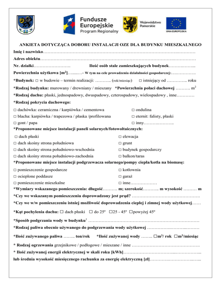 ANKIETA DOTYCZĄCA DOBORU INSTALACJI OZE DLA BUDYNKU MIESZKALNEGO Imię i nazwisko……………………………………………………………………………….………… Adres obiektu………………...…………………………………………………………….…………… Nr. działki……………………. Ilość osób stale zamieszkujących budynek……….……... Powierzchnia użytkowa [m2]….....…- W tym na cele prowadzenia działalności gospodarczej:….…………. *Budynek: □ w budowie – termin realizacji: ……….. (rok/miesiąc) □ istniejący od ………….. roku *Rodzaj budynku: murowany / drewniany / mieszany *Powierzchnia połaci dachowej ………. m2 *Rodzaj dachu: płaski, jednospadowy, dwuspadowy, czterospadowy, wielospadowy , inne………… *Rodzaj pokrycia dachowego: □ dachówka: ceramiczna / karpiówka / cementowa □ blacha: karpiówka / trapezowa / płaska /profilowana □ gont / papa □ ondulina □ eternit: falisty, płaski □ inny……….……….. *Proponowane miejsce instalacji paneli solarnych/fotowoltaicznych: □ dach płaski □ dach skośny strona południowa □ dach skośny strona południowo-wschodnia □ dach skośny strona południowo-zachodnia □ elewacja □ grunt □ budynek gospodarczy □ balkon/taras *Proponowane miejsce instalacji podgrzewacza solarnego/pompy ciepła/kotła na biomasę: □ pomieszczenie gospodarcze □ ocieplone poddasze □ pomieszczenie mieszkalne □ kotłownia □ garaż □ inne……………… *Wymiary wskazanego pomieszczenia: długość………. m; szerokość……….. m wysokość ……… m *Czy we wskazanym pomieszczeniu doprowadzony jest prąd? ………………………………………. *Czy we w/w pomieszczeniu istniej możliwość doprowadzenia ciepłej i zimnej wody użytkowej…… *Kąt pochylenia dachu: □ dach płaski □ do 25º □25 - 45º □powyżej 45º *Sposób podgrzania wody w budynku1 ………………………………………………………………… *Rodzaj paliwa obecnie używanego do podgrzewania wody użytkowej …………….………..……… *Ilość zużywanego paliwa …….. ton/rok *Ilość zużywanej wody …….. □m3/ rok □m3/miesiąc * Rodzaj ogrzewania grzejnikowe / podłogowe / mieszane / inne ………………………………………. * Ilość zużywanej energii elektrycznej w skali roku [kWh]……………………………...……………... lub średnia wysokość miesięcznego rachunku za energię elektryczną [zł]………….……………..…... * Moc umowna (przyłączeniowa) wynikająca z podpisanej umowy z operatorem systemu dystrybucyjnego[kW] ………………………………………………….………………...……………... * Sposób zasilania budynku w ciepło1……………………………………………………………………… * Moc istniejącego kotła:………………kW * Rodzaj paliwa obecnie używanego do ogrzewania budynku:……………………………………….… Twoje preferencje2 □ kolektory słoneczne □ pompa ciepła (cwu / co+cwu) □ panele fotowoltaiczne □ piec na biomasę NR TELEFONU DO KONTAKTU:…………………………………………………………. Adres e-mail:…………………………………………………………………………………… Adres do korespondencji (jeśli inny niż zamieszkania): …………………………………………………………………………………………………... Osoby zainteresowane prosimy, o dostarczenie uzupełnionej ankiety do Urzędu Gminy Żukowo pok. 13 lub wysłanie jej na adres mailowy: Niniejszym oświadczam, że wyrażam zgodę na przetwarzanie moich danych osobowych, zawartych w ankiecie na potrzeby realizacji projektu wynikającego z RPO 2014-2020 Działanie 10.3.Odnawialne źródła energii (zgodnie z ustawą z dnia 29.08.1997r. o ochronie danych osobowych (Dz.U. 2015, poz. 2135.) ……………………………………. (Miejscowość i data) ..…………………………………. (Czytelny podpis) np. kocioł gazowy 1-funkcyjny z wolnostojącym zasobnikiem; kocioł gazowy 2-funkcyjny, kocioł gazowy 1-funkcyjny ze zintegrowanym zasobnikiem, kocioł gazowy gaz ziemny / płynny, kocioł na paliwo stałe opalany węgiel/biomasą, kocioł olejowy, przepływowy podgrzewacz wody, pojemnościowy podgrzewacz wody, inne - jakie 2 Wybór ten ma charakter poglądowy i nie jest wiążący – Gmina informuje, że do projektu mogą zostać włączone tylko niektóre rodzaje OZE, o czym zainteresowani zostaną poinformowani na spotkaniu informacyjnym z mieszkańcami 1