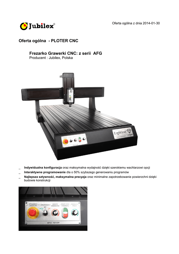 Oferta ogólna z dnia 2014-01-30 Oferta ogólna - PLOTER CNC Frezarko Grawerki CNC: z serii AFG Producent : Jubilex, Polska _ Indywidualna konfiguracja oraz maksymalna wydajność dzięki szerokiemu wachlarzowi opcji _ Interaktywne programowanie dla o 50% szybszego generowaniu programów _ Najlepsza sztywność, maksymalna precyzja oraz minimalne zapotrzebowanie powierzchni dzięki budowie konstrukcji Oferta ogólna z dnia 2014-01-30 Strona 2 z 7 AFG Specyfikacja cenowa Opcje podstawowe Długość (mm) 500, 700, 800, 1000, 1200, 1500, 2000, 2500, 3000 Szerokość (mm) 624, 832, 1040, 1248, 1664, 2080, 2288, 2496 Zakres osi Z (mm) 150, 220 Wrzeciona 24 000 obr/min 40 000 obr/min 0.8kW, 1.0kW 2.2kW, 3.3kW 1.4kW, 2.0kW, 2.2kW System steowania Typ stołu 50 000 obr/min 2.2kW Silniki krokowe, Serwonapędy cyfrowe Stół T-rowkowy, Stół próżniowy Wymiary obszaru roboczego [mm] Opcje dodatkowe Chłodzenie mglą olejową Ręczne, Automatyczne Dysza chłodząca powietrzem Chłodzenie czynnikiem chłodzącym Aktywna z nożem oscylacyjnym. Głowice Nożyk do cięcia folii Skaner Dotykowy, Laserowy Automatyczna wymiana narzędzi (Wymagany System sterowania - Serwonapędy cyfrowe) Szafa sterująca z komputerem Stopa dociskowa Odciąg wiórów Głowica pisząca Głowica nalewająca Plotery z serii AFG CNC są najlepsze z grupy ekonomicznych ploterów frezujących CNC. Duży obszar roboczy pozwala na wycinanie prosto z handlowych formatów bez wstępnego docinania. Pozwala to na wydajną pracę w pleksi, poliwęglanie i blachach aluminiowych. Możliwość wyposażenia maszyny w układ chłodzenia co pozwala na szybszą pracę w materiałach mających tendencję do zaklejania frezów. Automatyczny pomiar narzędzia niweluje czas tracony na ustawianie kolejnych narzędzi podczas wymiany. Prosta i solidna konstrukcja oraz intuicyjny system sterowania CNC czynią tą maszynę idealną dla firm branży reklamowej. Plotery AFG występują w kolorze czarnym za to w kilku wersjach jeśli chodzi o wyposażenie. Plotery frezujące serii AFG CNC produkujemy w zakresie obszarów roboczych 624x500mm do 2496 x 3000mm. Zakres roboczy osi Z wynosi 150mm lub 220mm. Oferta ogólna z dnia 2014-01-30 Strona 3 z 7 Maszyna podstawowa Ploter AFG0605P – pole pracy 624x500x150mm - prowadnice prostokątne (Bosch Rexroth) - silniki krokowe Sanyo Denki 3Nm - Sterowanie CNC CSMIO LPT+RS232 - Czujnik pomiaru wysokości narzędzia Podniesienie zakresu ruchu osi Z ze 150mm do 220mm 21 000,00 zł 2 500,00 zł Inne przykładowe ceny różnej wielkości maszyn na dole oferty Dodatkowe opcje Wrzeciona bez wymiany narzędzia Wrzeciono o większej mocy Firmy ELTE 2,2 kW 24 tys. Obr/min, ERG25, łożyska ceramiczne + Falownik wektorowy Wrzeciono o większej mocy Firmy ELTE 3,3 kW 24 tys. Obr/min, ERG25, łożyska ceramiczne + Falownik wektorowy Wrzeciono o większej mocy Firmy ELTE 0,8 kW 24 tys. Obr/min, ERG20, + Falownik wektorowy Wrzeciono o większej mocy Firmy HSD 1,0 kW, 24 tys. Obr/min, ERG25, łożyska ceramiczne + Falownik wektorowy Dopłata 4 200,00 zł 5 450,00 zł 3 000,00 zł 3 500,00 zł Wrzeciona z wymianą narzędzi ** ELTE ** AF80 9/2 CU (220V 670Hz, 1,40kW) 40 tys.Obr/min, ISO20, łożyska ceramiczne AF100 7/2 CU (220 lub 380V 670Hz, 2,20kW) 40 tys.Obr/min, ISO20, łożyska ceramiczne Wymiennik – chłodzenie do wrzecion ELTE 24 550,00 zł 26 150,00 zł 7 680,00 zł Wrzeciona z wymianą narzędzi ** HSD ** Wrzeciono ES325 HSK E25 2kW 40 tys. Obr/min, Wymiana narzędzi - stożek ISO30 Wrzeciono ES325 HSK E25 2 kW 50 tys. Obr/min, Wymiana narzędzi – pneumatyczna Chłodzenie do wrzecion HSD/IDEA 16S Falownik do wrzecion HSD DPL 040 3-fazowy 20 400,00 zł 24 000,00 zł 7 680,00 zł 3 200,00 zł Wrzeciona z wymianą narzędzi ** ISEL ** Wrzeciono ISEL - 2,2 kW (220V) - 300/15 tys. Obr/min - Wymiana narzędzi -stożek ISO30 Inne wrzeciona również dostępne. Przy montażu dużych ciężkich wrzecion w osi Z trzeba zamontować siłownik pneumatyczny wspomagający napęd. 12 000,00 zł 1 800,00 zł Oferta ogólna z dnia 2014-01-30 Strona 4 z 7 Osprzęt do wrzecion Komplet tulejek zaciskowych ER32 od 2mm do 20mm bicie promieniowe do 5m W drewnianym pudełku 18szt 1 328,00 zł Komplet tulejek zaciskowych ER25 od 2mm do 16mm bicie promieniowe do 5m W drewnianym pudełku 15szt 1 060,00 zł Komplet tulejek zaciskowych ER20 od 2mm do 13mm bicie promieniowe do 5m W drewnianym pudełku 12szt Oprawka Narzędziowa ISO20do wrzeciona Elte 836,00 zł Oprawka Narzędziowa ISO30 ER32 do wrzeciona HSD Oprawka Narzędziowa ISO30 ER32 do wrzeciona ISEL Magazyn narzędzi - cena za 1 poz. nie mniej niż 4.000,- 600,00 zł 640,00 zł 684,00 zł 800,00 zł Napędy Napęd za pomocą serwosilników AC 200W (3 sztuki) Dopłata do serwosilników AC 400W (3 sztuki) 8 500,00 zł 2 250,00 zł Napęd za pomocą serwosilników BLDC 1,0Nm (zalecane) 6 500,00 zł Napęd za pomocą serwosilników BLDC 1,9Nm 8 000,00 zł UWAGA!!! W niektórych maszynach z uwagi na ich wielkość (powyżej 1664mm szerokości) w osi Y trzeba zastosować dwa serwosilniki zamiast jednego – w całej maszynie stosujemy wtedy cztery serwosilniki zamiast trzech Dopłata do serwosilnika z hamulcem dla osi Z 2 600,00 zł Podniesienie dokładności obróbki Precyzyjny czujnik do pomiaru długości narzędzia (+-0,002mm) ISEL Czujnik wysokości materiału Precyzyjniejsze śruby napędowe dające większą dokładność pozycjonowania (wg PN-ISO 230-4:1999) Osie obrotowe Przygotowanie sterowania do obsługi osi obrotowej (4-oś) (cena bez osi obrotowej) Oś obrotowa (przekładnia pasowa D1 U1:16) 580,00 zł 1 600,00 zł 800,00 zł Cena zależna od wielkości maszyny 1 000,00 zł 5 000,00 zł Oś obrotowa (przekładnia pasowa D1 U1:40) 6 000,00 zł Podstawka i konik do osi obrotowej 2 400,00 zł Oś obrotowa (przekładnia pasowa U1:50) Erg-Wind 6 500,00 zł Wielkość i rodzaj uchwytu tokarskiego do uzgodnienia. Oferta ogólna z dnia 2014-01-30 Strona 5 z 7 Smarowanie Smarownica E47