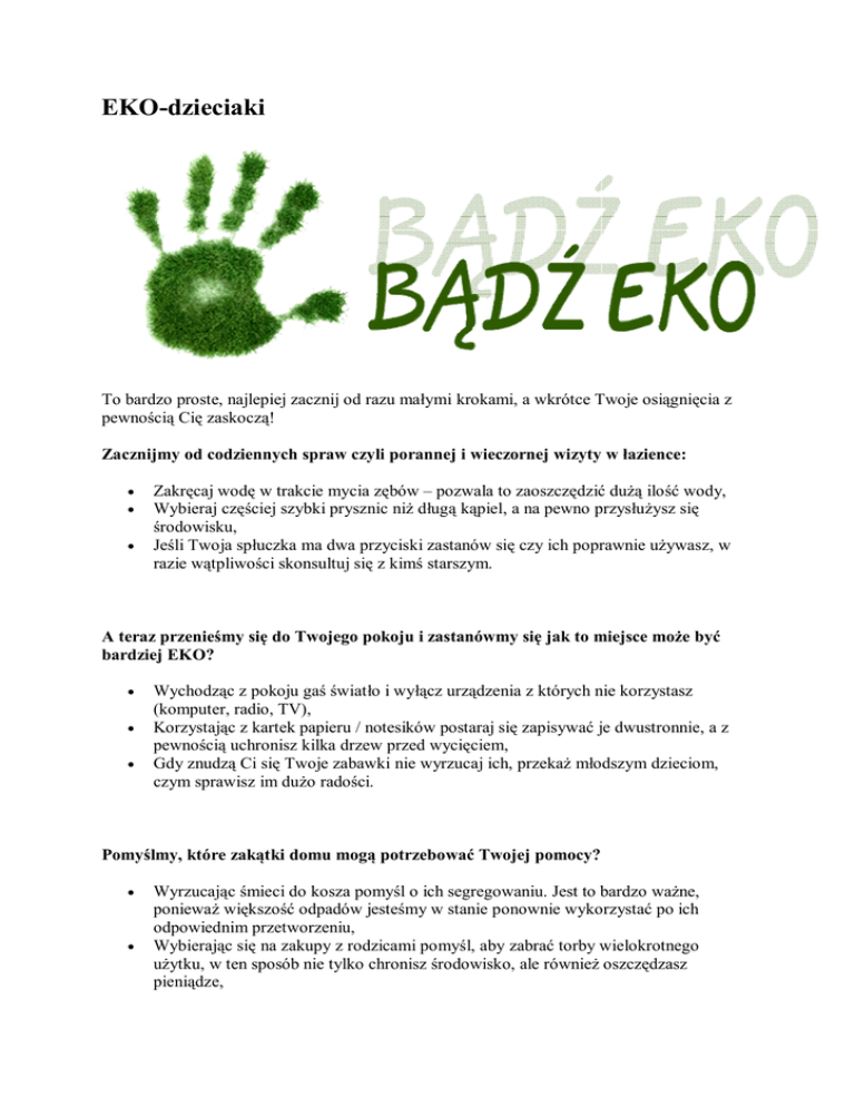 EKO-dzieciaki To bardzo proste, najlepiej zacznij od razu małymi krokami, a wkrótce Twoje osiągnięcia z pewnością Cię zaskoczą! Zacznijmy od codziennych spraw czyli porannej i wieczornej wizyty w łazience: Zakręcaj wodę w trakcie mycia zębów – pozwala to zaoszczędzić dużą ilość wody, Wybieraj częściej szybki prysznic niż długą kąpiel, a na pewno przysłużysz się środowisku, Jeśli Twoja spłuczka ma dwa przyciski zastanów się czy ich poprawnie używasz, w razie wątpliwości skonsultuj się z kimś starszym. A teraz przenieśmy się do Twojego pokoju i zastanówmy się jak to miejsce może być bardziej EKO? Wychodząc z pokoju gaś światło i wyłącz urządzenia z których nie korzystasz (komputer, radio, TV), Korzystając z kartek papieru / notesików postaraj się zapisywać je dwustronnie, a z pewnością uchronisz kilka drzew przed wycięciem, Gdy znudzą Ci się Twoje zabawki nie wyrzucaj ich, przekaż młodszym dzieciom, czym sprawisz im dużo radości. Pomyślmy, które zakątki domu mogą potrzebować Twojej pomocy? Wyrzucając śmieci do kosza pomyśl o ich segregowaniu. Jest to bardzo ważne, ponieważ większość odpadów jesteśmy w stanie ponownie wykorzystać po ich odpowiednim przetworzeniu, Wybierając się na zakupy z rodzicami pomyśl, aby zabrać torby wielokrotnego użytku, w ten sposób nie tylko chronisz środowisko, ale również oszczędzasz pieniądze, Bierz udział w akcjach organizowanych przez szkołę lub przedszkole na zbiórkę zakrętek, baterii czy makulatury. Jeśli wprowadzisz do swojej codzienności tych kilka prostych zasad zaczniesz zmieniać ŚWIAT. Pomyśl ile od Ciebie zależy!