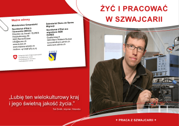 Ważne adresy arki: Ministerstwo Gospod Secrétariat d’Etat à l’économie (SECO) RES Direction du travail / EU Holzikofenweg 36 3003 Berne/Suisse [email protected] www.eures.ch www.espace-emploi.ch 25 Hotline: +41 (0)58 463 25 Spraw Sekretariat Stanu do Migracji: x Secrétariat d’Etat au M SE s on migrati EURES Quellenweg 6 isse 3003 Bern-Wabern/Su h [email protected] www.sem.admin.ch ŻYĆ I PRACOWAĆ W SZWAJCARII „Lubię ten wielokulturowy kraj i jego świetną jakość życia.” Ted Smith, inżynier, Holandia + PRACA Z SZWAJCARII + GOSPODARKA Niewielka powierzchnia i brak surowców nie przeszkodziły Szwajcarii w staniu się uprzemysłowionym krajem o wysoce rozwiniętym sektorze finansowym. Import surowców i produktów żywnościowych odgrywa w związku z tym bardzo ważną rolę. Stabilność gospodarcza i polityczna kraju sprawiły, że bardzo liczne firmy prowadzące działalność na skalę światową obrały Szwajcarię za miejsce swojej głównej siedziby. JAK POSZUKIWAĆ PRACY W SZWAJCARII? Liczne wolne posady nie są opublikowane ani w gazetach, ani w Internecie, gdyż są zajmowane wewnętrznie lub oferowane osobom, które zwracają się bezpośrednio do przedsiębiorstwa. Dlatego też osobiste kontakty oraz publiczne i prywatne agencje pośrednictwa pracy są najlepszą drogą do zapoznania się z rynkiem pracy. W niektórych dziedzinach takich jak budownictwo czy sprzedaż i hotelarstwo, informacje o większości posad są przekazywane ustnie. Nie wahajcie się więc skorzystać ze swoich prywatnych i zawodowych kontaktów. Wielu przedsiebiorców publikuje oferty posad na własnych stronach internetowych. Wyszukiwarki pomogą wam w ich znalezieniu. Szukajcie przedsiębiorstw, które was interesują i wybierzcie te, które odnoszą sukcesy. Adresy większości przedsiębiorstw szwajcarskich znajdują się pod rubryką prezentującą członków („Mitglieder”, „Membres”) na stronach ich zrzeszeń, na przykład: Economie Suisse (organizacja przedsiębiorstw szwajcarskich), Swissmem (organizacja szwajcarskiego przemysłu maszynowego, wyposażenia elektrycznego i metalowego), FH (Szwajcarska Federacja Zegarmistrzowska), SGCI (organizacja przemysłu chemicznego i farmaceutycz- nego), Gastro Suisse (narodowa federacja hotelarstwa i gastronomii), itd. OGŁOSZENIA W GAZETACH I W INTERNECIE Wolne posady często publikowane są w specjalnych dodatkach do głównych gazet. Najbardziej znane to: „Emploi&Formation” (Le Temps w Genewie i Lozannie), „Dossier Emploi” (24 heures w Lozannie), „Stellefant” (Basler Zeitung w Bazylei), „Stellenmarkt” (Bund i Berner Zeitung w Bernie), „Stellen-Anzei ger” et „Alpha” (Tages-Anzeiger i SonntagsZeitung w Zurychu) oraz „NZZ-executive” (Neue Zürcher Zeitung w Zurychu) i strony w Corriere del Ticino (dla kantonu Tessyn). www Regionalne Pośrednictwa Pracy ORP: www.espace-emploi.ch > Qui sommes-nous? Możecie także zapisać się do jednej z wielu prywatnych agencji pośrednictwa pracy lub do agencji pracy czasowej. Kompletna lista agencji upoważnionych do świadczenia usług w tej dziedzinie znajduje się pod następującam adresem: www Skorowidz prywatnych agencji pośrednictwa pracy: www.avg-seco.admin.ch Sieć EURES (Europejski Portal Mobilności Zawodowej) UE ma na celu popieranie mobilności pracowników na terenie Europejskiego Obszaru Gospodarczego. Jej internetowy bank danych zawiera tysiące ofert wolnych posad; niektóre z nich znajdują się w Szwajcarii. Nie wahajcie się złożyć w tym portalu swojego życiorysu, ponieważ ta strona odwiedzana jest przez wielu pracodawców. www EURES dla osób poszukujących pracy: www.ec.europa.eu/eures/ i www.eures.ch DOKUMENTY APLIKACYJNE Pełny zestaw dokumentów aplikacyjnych w Szwajcarii zawiera z reguły list motywacyjny, życiorys (CV) oraz kopie świadectw pracy i dyplomów. Wszystkie dokumenty muszą być zredagowane w jednym z języków narodowych (francuski, niemiecki, włoski). Przedsiębiorstwa wielonarodowe akceptują równierz aplikacje zredagowane po angielsku. Aby wasza teczka wybiła się z tłumu, musicie zadbać o przejrzystą i właściwą formę graficzną listu motywacyjnego i całej aplikacji. „Szwajcaria ma wiele interesująch aspektów, między innymi dobre warunki pracy.” Sandra Brandhuber, pielęgniarka, Austria Celem listu motywacyjnego jest przekonanie waszego rozmówcy, że jesteście idealną osobą na dane stanowisko. Musicie więc sformułować jak najdokładniej wasze zainteresowanie posadą, o którą się ubiegacie. Musicie być komunikatywni i przekonywający oraz wywołać zainteresowanie adresata, nie zapominając o akcencie osobistym. Nie wahajcie się sformułować waszych oczekiwań związanych z posadą i uwydatnić waszych atutów. Jeśli nie całkowicie odpowiadacie wymaganiom stanowiska, wspomnijcie o tym, lecz w sposób pozytywny. Uważajcie, żeby nie przekroczyć jednej strony A4 maszynopisu (list motywacyjny nie powinien być odręczny, chyba, że pracodawca tego wyraźnie wymaga). Dbajcie także o gramatykę i ortografię. CURRICULUM VITAE Prostota, zwięzłość i dokładność! Curriculum vitae powinno mieć najwyżej dwie strony A4 i musi przedstawić, najlepiej w formie tabelki, następujące elementy: –Nazwisko i imię, adres, numer telefonu, wiek, narodowość –Zdjęcie paszportow –Doświadczenie zawodowe (dla młodych kandydatów: staże odbyte w czasie kształcenia) –Wykształcenie (szkoły, studia, zawód) –Kompetencje językowe –Znajomość informatyki –Szczególne uzdolnienia –Osobiste zainteresowania (hobby, udział w stowarzyszeniach, itd.) Dalsze informacje i modele aplikacji: www Europass: http://europass.cedefop.europa.eu www Co to jest dobra aplikacja?: www.espace-emploi.ch Publications > Brochures > Candidature PRZYGOTOWANIE DO PIERWSZEJ ROZMOWY REKRUTACYJNEJ Przygotujcie się starannie i dokonajcie przeglądu swoich mocnych i słabych stron, albowiem będziecie musiel