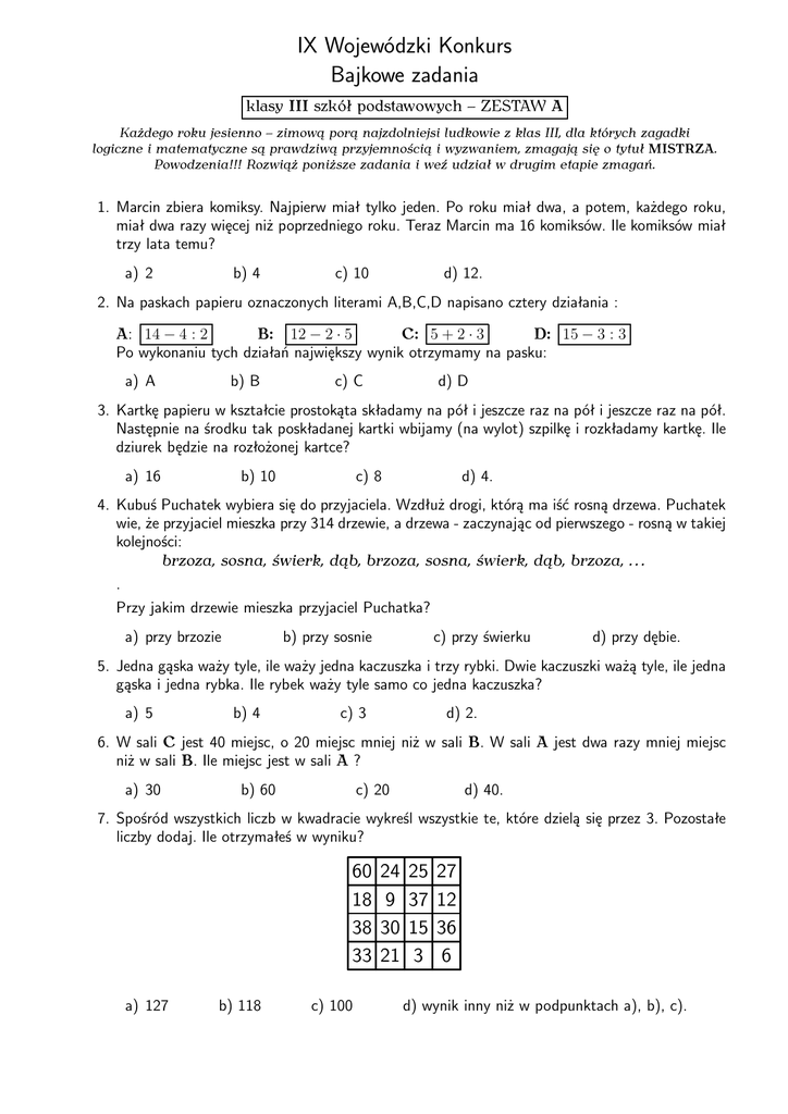 IX Wojewódzki Konkurs Bajkowe zadania klasy III szkół podstawowych – ZESTAW A Każdego roku jesienno – zimową porą najzdolniejsi ludkowie z klas III, dla których zagadki logiczne i matematyczne są prawdziwą przyjemnością i wyzwaniem, zmagają się o tytuł MISTRZA. Powodzenia!!! Rozwiąż poniższe zadania i weź udział w drugim etapie zmagań. 1. Marcin zbiera komiksy. Najpierw miał tylko jeden. Po roku miał dwa, a potem, każdego roku, miał dwa razy więcej niż poprzedniego roku. Teraz Marcin ma 16 komiksów. Ile komiksów miał trzy lata temu? a) 2 b) 4 c) 10 d) 12. 2. Na paskach papieru oznaczonych literami A,B,C,D napisano cztery działania : B: 12 − 2 · 5 C: 5 + 2 · 3 D: 15 − 3 : 3 A: 14 − 4 : 2 Po wykonaniu tych działań największy wynik otrzymamy na pasku: a) A b) B c) C d) D 3. Kartkę papieru w kształcie prostokąta składamy na pół i jeszcze raz na pół i jeszcze raz na pół. Następnie na środku tak poskładanej kartki wbijamy (na wylot) szpilkę i rozkładamy kartkę. Ile dziurek będzie na rozłożonej kartce? a) 16 b) 10 c) 8 d) 4. 4. Kubuś Puchatek wybiera się do przyjaciela. Wzdłuż drogi, którą ma iść rosną drzewa. Puchatek wie, że przyjaciel mieszka przy 314 drzewie, a drzewa - zaczynając od pierwszego - rosną w takiej kolejności: brzoza, sosna, świerk, dąb, brzoza, sosna, świerk, dąb, brzoza, . . . . Przy jakim drzewie mieszka przyjaciel Puchatka? a) przy brzozie b) przy sosnie c) przy świerku d) przy dębie. 5. Jedna gąska waży tyle, ile waży jedna kaczuszka i trzy rybki. Dwie kaczuszki ważą tyle, ile jedna gąska i jedna rybka. Ile rybek waży tyle samo co jedna kaczuszka? a) 5 b) 4 c) 3 d) 2. 6. W sali C jest 40 miejsc, o 20 miejsc mniej niż w sali B. W sali A jest dwa razy mniej miejsc niż w sali B. Ile miejsc jest w sali A ? a) 30 b) 60 c) 20 d) 40. 7. Spośród wszystkich liczb w kwadracie wykreśl wszystkie te, które dzielą się przez 3. Pozostałe liczby dodaj. Ile otrzymałeś w wyniku? 60 18 38 33 a) 127 b) 118 c) 100 24 9 30 21 25 37 15 3 27 12 36 6 d) wynik inny niż w podpunktach a), b), c). 8. Żarówka może świecić nieprzerwanie przez 100 godzin. Została włączona w poniedziałek o dziewiątej wieczorem. Kiedy zgasła? a) w piątek o 9 wieczorem, b) w czwartek o 18:00, c) w niedzielę o 17:00, d) w sobotę o 1 w nocy. ZADANIE 1 W torebce jest mniej niż 150 cukierków. Wiadomo, że można je podzielić równo między czworo lub pięcioro dzieci, ale między trójkę dzieci się nie da. Ile cukierków może być w torebce? W odpowiedzi podaj wszystkie możliwości. ZADANIE 2 Maciek kupił trzy książki. Wszyskie bez pierwszej kosztowały 32 zł, wszystkie bez drugiej kosztowały 29 zł, zaś wszystkie bez trzeciej 27 zł. Ile kosztowała każda książka? ZADANIE 3 Zaczynasz wędrówkę od liczby 5 w lewym górnym rogu, a kończysz na polu z liczbą 5 w prawym dolnym rogu. Poruszasz się przechodząc między sąsiednimi kwadracikami na przemian: kwadracik z cyfrą a następnie kwadracik ze znakiem + i tak dalej dodając po drodze cyfry, przez które przechodzisz. Przez czarny kwadracik nie wolno Ci przejść. Ponadto na każdym kwadraciku możesz stanąć tylko raz a zaznaczana przez Ciebie droga nigdzie nie może się krzyżować. Zaznacz taką drogę, aby uzyskać wynik najbardziej zbliżony do 60. Podaj uzyskany wynik. 5 + 6 + 4 3 + 2 + 5 + + 7 + 8 + + + 9 + 2 + + + 7 + 9 + 9 + + 6 + + 4 5 IX Wojewódzki Konkurs Bajkowe zadania klasy III szkół podstawowych – ZESTAW B Każdego roku jesienno – zimową porą najzdolniejsi ludkowie z klas III, dla których zagadki logiczne i matematyczne są prawdziwą przyjemnością i wyzwaniem, zmagają się o tytuł MISTRZA. Powodzenia!!! Rozwiąż poniższe zadania i weź udział w drugim etapie zmagań. 1. W sali C jest 50 miejsc, o 10 miejsc mniej niż w sali B. W sali A jest dwa razy mniej miejsc niż w sali B. Ile miejsc jest w sali A ? a) 30 b) 60 c) 20 d) 40. 2. Spośród wszystkich liczb w kwadracie wykreśl wszystkie te, które dzielą się przez 3. Pozostałe liczby dodaj. Ile otrzymałeś w wyniku? 60 12 40 39 a) 127 b) 118 27 6 30 24 c) 100 26 34 18 12 24 15 36 9 d) wynik jest inny niż w podpunktach a), b), c. 3. Kartkę papieru w kształcie prostokąta składamy na pół i jeszcze raz na pół i jeszcze raz na pół. Następnie na środku tak poskładanej kartki wbijamy (na wylot) szpilkę i rozkładamy kartkę. Ile dziurek będzie na rozłożonej kartce? a) 16 b) 10 c) 8 d) 4. 4. Marek zbiera komiksy. Najpierw miał tylko jeden. Po roku miał dwa, a potem, każdego roku, miał dwa razy więcej niż poprzedniego roku. Teraz Marcin ma 32 komiksy. Ile komiksów miał dwa lata temu? a) 2 b) 4 c) 8 d) 12. 5. Kubuś Puchatek wybiera się do przyjaciela. Wzdłuż drogi, którą ma iść rosną drzewa. Puchatek wie, że przyjaciel mieszka przy 304 drzewie, a drzewa - zaczynając od pierwszego - rosną w takiej kolejności: brzoza, sosna, świerk, dąb, brzoza, sosna, świerk, dąb, brzoza, . . . . Przy jakim drzewie mieszka przyjaciel Puchatka? a) przy brzozie b) przy sosnie c) przy świerku d) przy dębie. 6. Jedna gąska waży tyle, ile waży jedna kaczuszka i trzy rybki. Dwie kaczuszki ważą tyle, ile jedna gąska i jedna rybka. Ile rybek waży tyle samo co jedna kaczuszka? a) 5 b) 4 c) 3 d) 2. 7. Na paskach papieru oznaczonych literami A,B,C,D napisano cztery działania : A: 12 − 4 : 2 B: 12 − 2 · 5 C: 6 + 2 · 3 D: 15 − 3 : 3 Po wykonaniu tych działań największy wynik otrzymamy na pasku: a) A b) B c) C d) D 8. Żarówka może świecić nieprzerwanie przez 100 godzin. Została włączona w poniedziałek o dziewiątej wieczorem. Kiedy zgasła? a) w piątek o 9 wieczorem, b) w czwartek o 18:00, c) w niedzielę o 17:00, d) w sobotę o 1 w nocy. ZADANIE 1 W torebce jest mniej niż 150 cukierków. Wiadomo, że można je podzielić równo między czworo lub pięcioro dzieci, ale między trójkę dzieci się nie da. Ile cukierków 