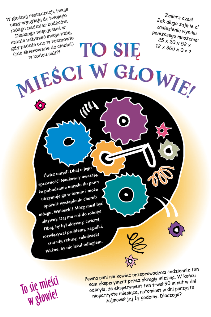 je cji, two staura ojego e r j e n do tw W głoś ysyłają ców. uszy w admiar bodź n św mózgu o więc jeste g e imię, z Dlac swoje ć e z s usły mowie stanie ie ono w roz iebie!) dn gdy pa rowane do c ie ! (nie sk u sali? w końc Zmierz czas! Jak dłu go zajm ie ci znalez ienie w yniku poniżs zego m nożenia 25 x 2 : 0 x 52 x 12 x 36 5x0= ? go baj o je mysł! D u , z ic Ćw uważają kowcy u a N ! ć oś pracy sprawn słu do ie umy n a z d u że że pob ie i mo w form o g je u rób utrzym nie cho ystąpie w ić być n opóź g musi !? Móz k e s io . Wn oty! do rob mózgu mu coś j a D . y ył, aktywn , ćwicz ktywny a ł y b y adki, Dbaj, b my, zag ł proble a w y z ! rozwią olwiek sy, cok u b e r , y giem. szarad ał odło nie leż y b , e Ważn i c ś e i m ę i To s ie! w głow ten ła codziennie przeprowadza c ie cu ow oń k uk W na . Pewna pani gły miesiąc ent przez okrą minut w dni sam eksperym n te trwał 90 t en ym er sp i parzyste odkryła, że ek natomiast w dn a, ąc si ie m e laczego? nieparzyst 1½ godziny. D zajmował jej The European Dana Alliance for the Brain Informacje w „To się mieści w głowie!” pochodzą z książki „The Dana Sourcebook of Brain Science: Resources for Secondary and PostSecondary Teachers and Students, Second Edition” wydanej przez Dana Press. Wersja online „To się mieści w głowie!” (It’s Mindboggling!) znajduje się na stronie www.dana.org/kids/lesson.cfm. Stowarzyszenie na Rzecz Krzewienia Wiedzy o Mózgu „Dana” (The Dana Alliance for the Brain Initiatives) jest organizacją nie nastawioną na zysk (non profit), której celem jest zwiększenie powszechnej świadomości o postępach i korzyściach badań mózgu, a także rozpowszechnianie informacji o samym mózgu w sposób zrozumiały i przystępny. Wydane w całości ze środków Fundacji „Dana”, Stowarzyszenie „Dana” nie pokrywa kosztów badań naukowych i nie przyznaje grantów. The Dana Centre 165 Queen´s Gate, London SW7 5HD E-mail: [email protected] Institute of Experimental Medicine AS CR, v.v.i. Vídeňská 1083, 142 20 Prague 4 E-mail: [email protected] Strona internetowa: http://edab.dana.org © 2007 A Dana Alliance for the Brain Inc. publication prepared by EDAB, the European subsidiary of DABI Na początek - wykonaj po kolei każdą z poniższych czynności. 1. Wyobraź sobie miejsce lub sytuację, w której chciałbyś się znaleźć. Może będzie to surfowanie po szczycie ogromnej fali morskiej lub jazda na desce w dół ośnieżonego halfpipu? Może po prostu wolisz pławić się w blasku słońca na piaszczystej plaży? A może jesteś w swoim pokoju, by uciąć drzemkę, o której od dawna marzyłeś? Skonstruuj w swoim umyśle dokładne wyobrażenie tego miejsca i zatrzymaj je na minutę lub dwie. 2. Wsłuchaj się w dźwięki wokół siebie. Słuchaj dobrze! I co słyszysz? Może żucie gumy przez kogoś tuż obok? Stłumiony śmiech w korytarzu? Dźwięki muzyki gdzieś w tle? Zobacz, ile różnych dźwięków jesteś w stanie wyodrębnić. 3. Teraz postukaj palcami w stół. Delikatnie. Po kolei uderzaj raz, każdym palcem. Potem odwróć kolejność uderzeń. Następnie uderz każdym palcem dwa razy, znów - po kolei, i znów w odwrotnej kolejności. A teraz - po trzy razy... 4. Policz do tyłu, co siedem, zaczynając od 100. 5. Przypomnij sobie wydarzenie z przeszłości. Na przykład moment, gdy po raz pierwszy jedziesz sam na rowerze, lub swoją babcię, gdy piecze ci ulubione ciastka. Przenieś się ponownie w to miejsce i postaraj się przypomnieć sobie wszystko, co ci się uda. Kto był tam wtedy z tobą? W co byłeś ubrany? Co wtedy czułeś? 6. A teraz uszczypnij się! Znajdź delikatne miejsce po wewnętrznej stronie łokcia i uszczypnij się na tyle mocno, by poczuć ból. Paliwo dla twojego mózgu Mózg pracuje najlepiej, gdy dostarczamy organizmowi składniki pokarmowe w odpowiednich proporcjach. Bez zrównoważonego jadłospisu twoje neurony nie mogą pracować optymalnie, a ty narażasz się na problemy z pamięcią, wysławianiem się, napady złości lub smutku czy zawroty głowy. 1 Wykonanie powyższych sześciu zadań uaktywniło pokaźny obszar twojego mózgu. Nawet coś tak „prostego”, jak bębnienie kolejnymi palcami w stół, wymaga niezwykle zorganizowanego działania milionów komórek nerwowych w obrębie mózgu, działania wspólnego, skoordynowanego w czasie, które generuje sygnały wprawiające w ruch twoje palce. Gdybyś właśnie leżał wewnątrz urządzenia skanującego typu PET lub MRI - nowoczesnych narzędzi neuronaukowych, które umożliwiają badaczom robienie zdjęć żywego, działającego mózgu - zdjęcia te ukazałyby aktywność w określonych rejonach twojego mózgu. W przypadku każdego z sześciu zadań byłyby to inne obszary lub odmienne ich kombinacje. W przypadku uderzania kolejnymi palcami o blat mielibyśmy do czynienia z aktywnością grup neuronów. Aktywność tę pokazałyby co najmniej cztery rejony mózgu: • kora przedczołowa, gdzie mózg podejmuje świadome decyzje o wykonaniu czynności, • kora przedruchowa, gdzie powstają instrukcje wykonania czynności, • kora ruchowa, która jest rodzajem stacji przekaźnikowej, wysyłająca te instrukcje do mięśni ręki i dłoni, które poruszają palcami oraz, • móżdżek, który nadzoruje cały proces i we właściwy sposób dostosowuje twoje działanie w odpowiedzi na bodźce zewnętrzne, np. położenie twojej ręki względem blatu stołu. Wszystko to dzieje się w zaledwie ułamku sekundy. Z perspektywy mózgu nie jest to więc „prosta” czynność. Niewyspany? Po jednej nieprzespanej nocy jesteś zrzędliwy i opryskliwy. Po dwóch - trudno ci się skoncentrować. A po kilku - zaczynasz mieć halucynacje (widzisz rzeczy, których nie ma!). 2 Siła mózgu! Przez dwie minuty postaraj się zapamiętać następujące 10 słów w podanej kolejności: czekolada, głowa, świnia, świat, pierścień, żona, cud, Hen